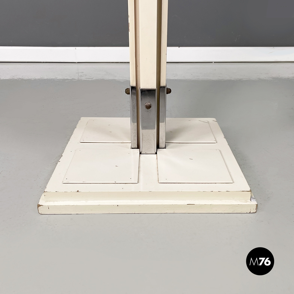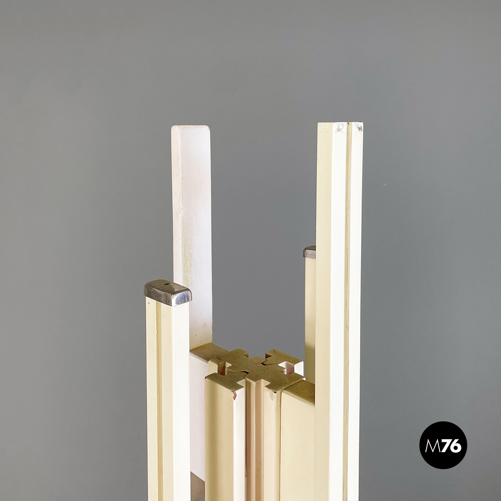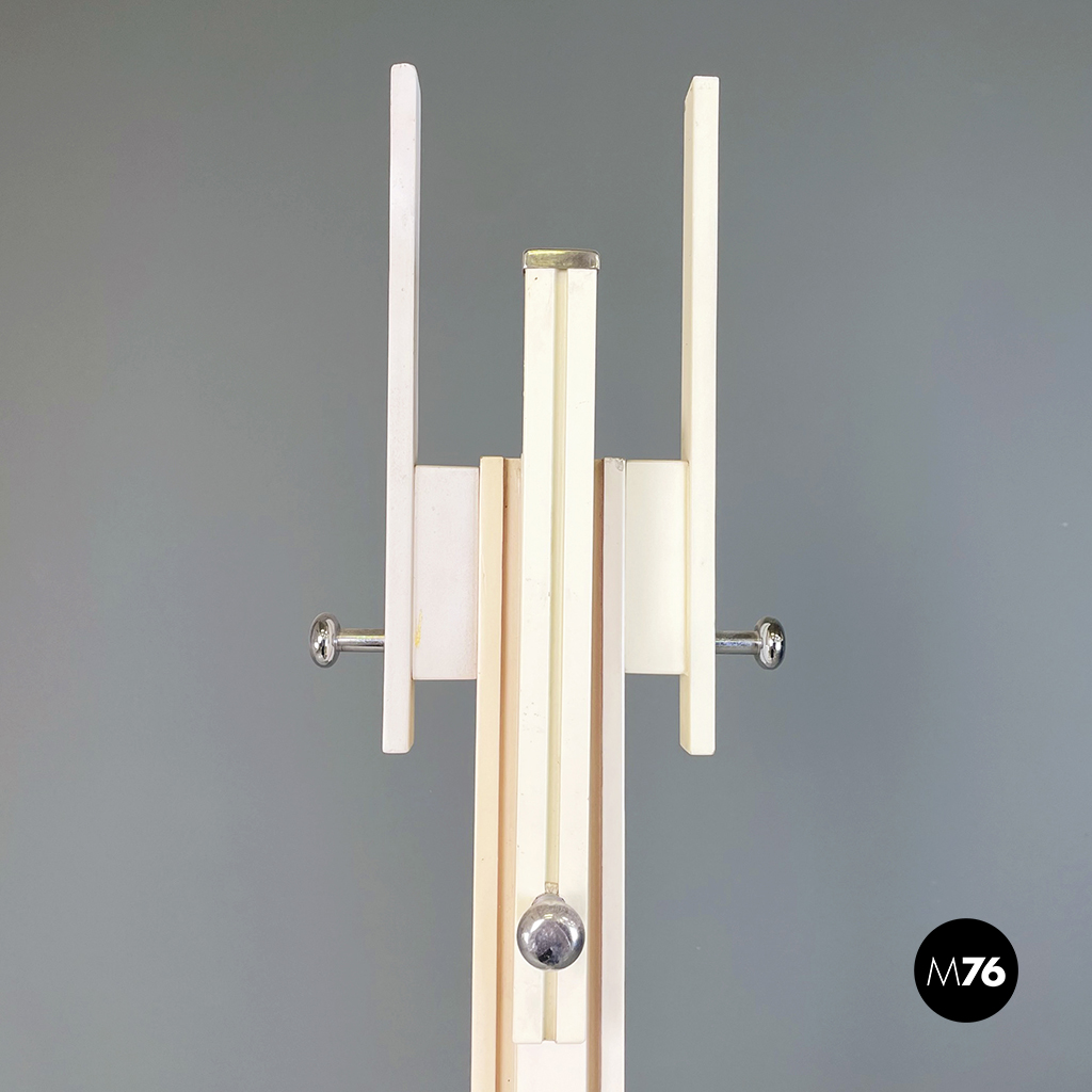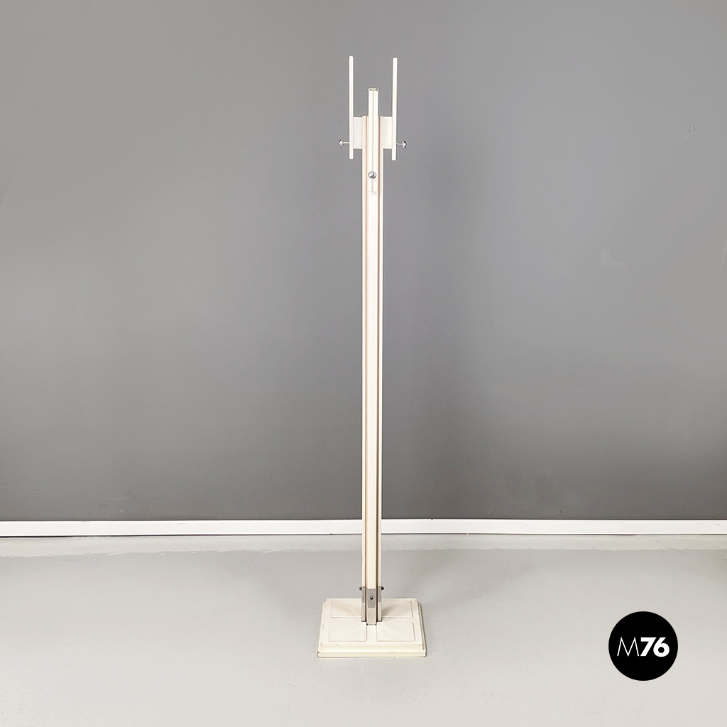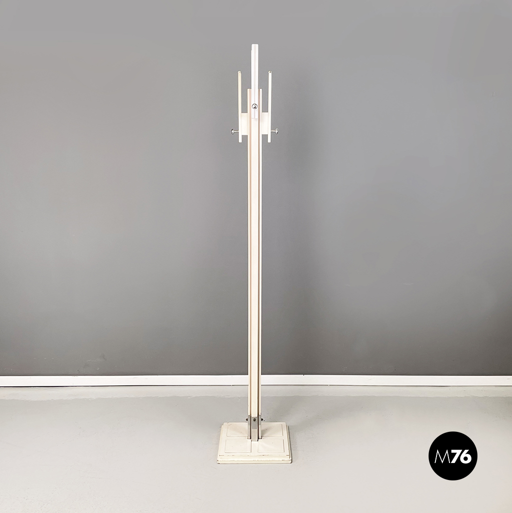 Appendiabiti da terra a base quadrata in legno verniciato bianco e metallo. Nella parte superiore presenta quattro ganci metallici ad altezze differenti. La struttura centrale è composta da una serie di listelli in legno con dettagli metallici nella parte alta. La base quadrata è in legno.