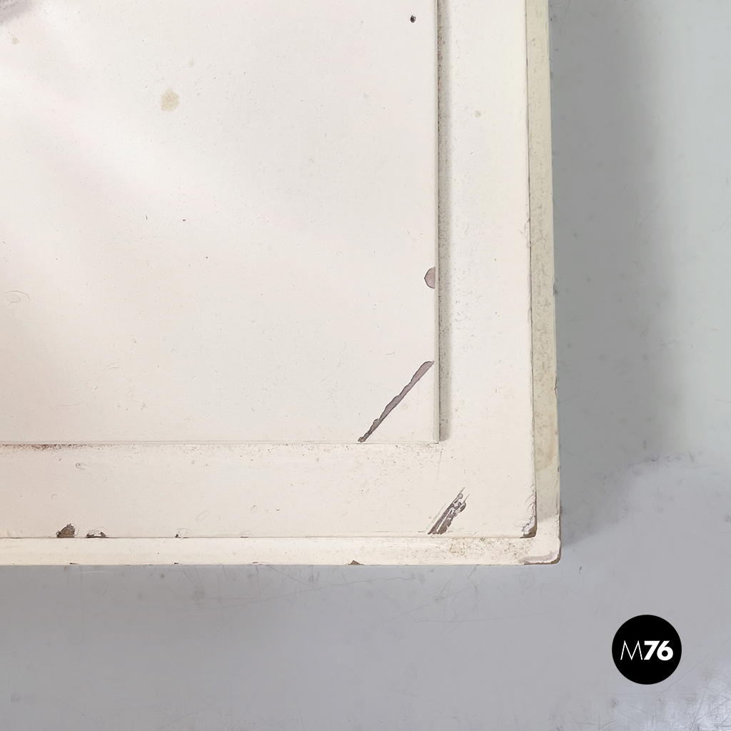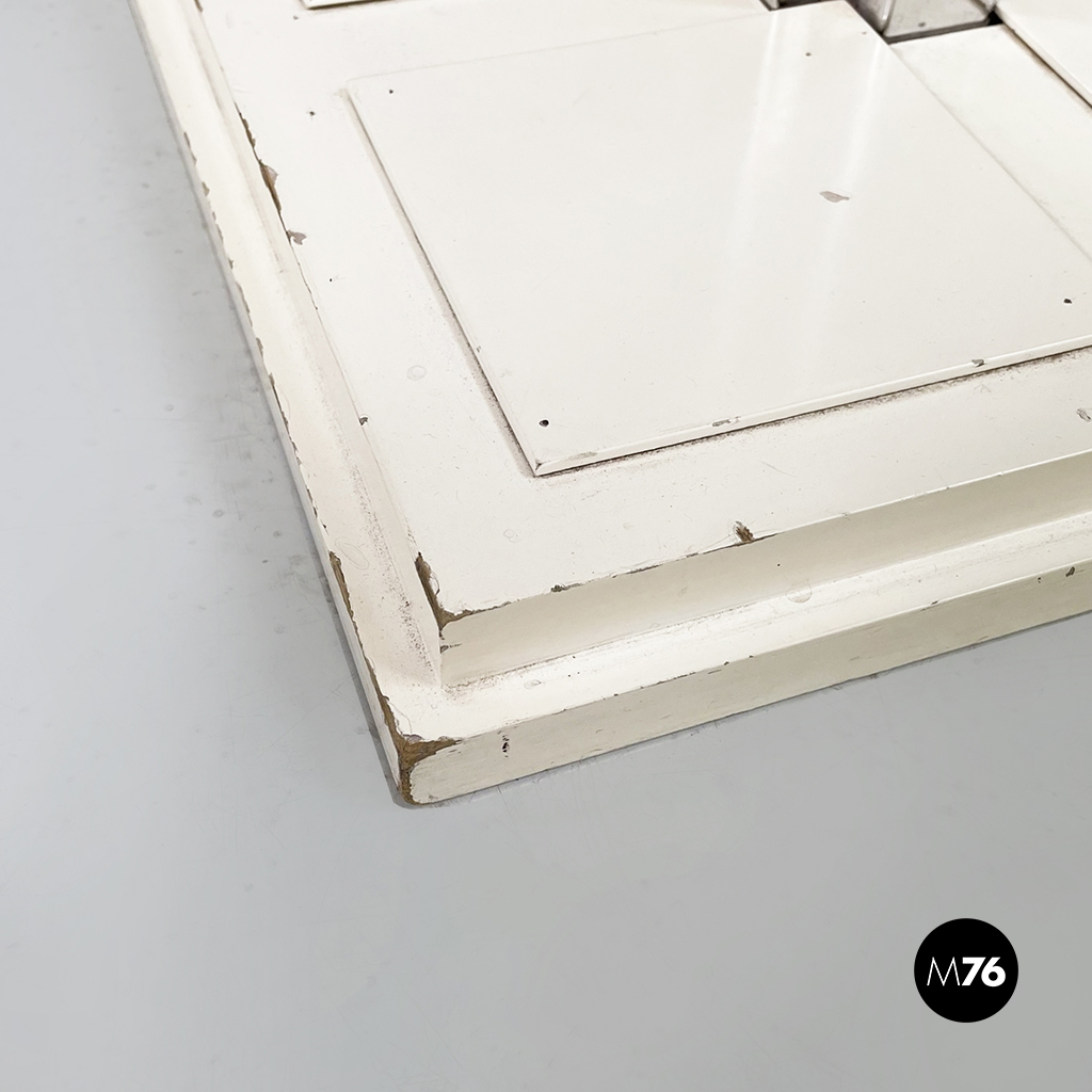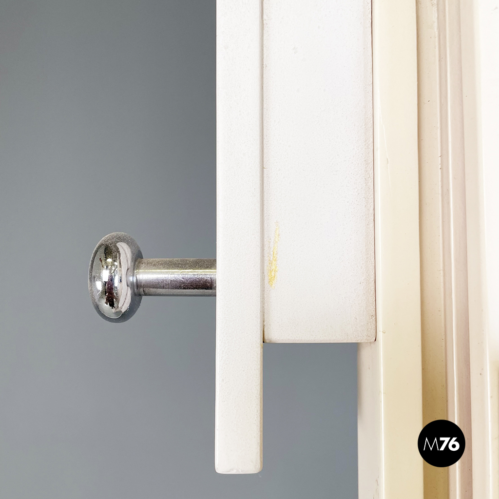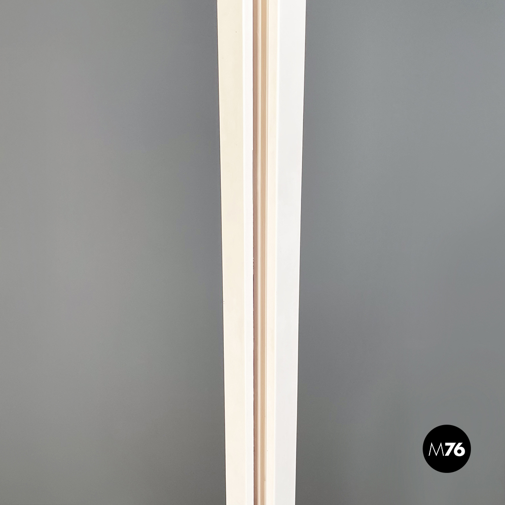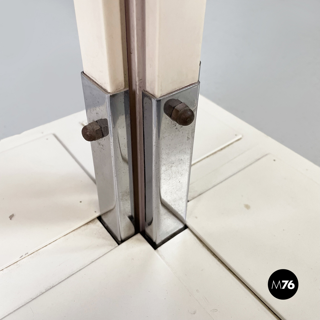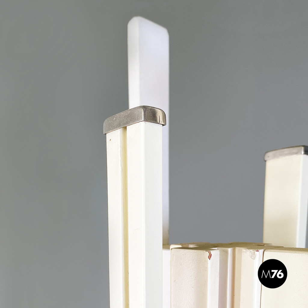 Appendiabiti da terra a base quadrata in legno verniciato bianco e metallo. Nella parte superiore presenta quattro ganci metallici ad altezze differenti. La struttura centrale è composta da una serie di listelli in legno con dettagli metallici nella parte alta. La base quadrata è in legno.