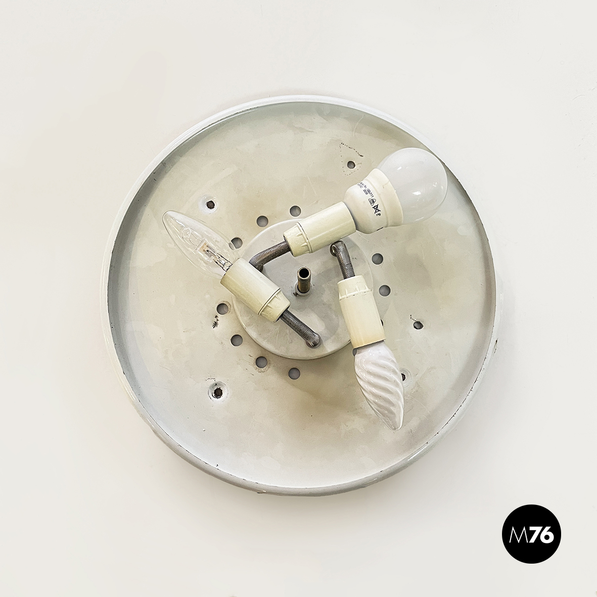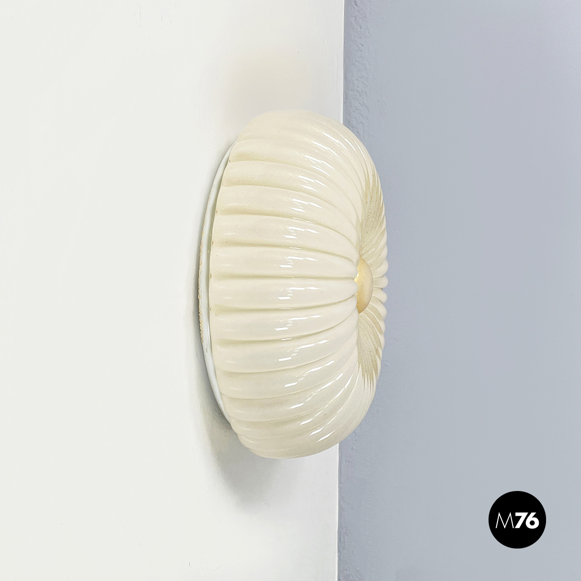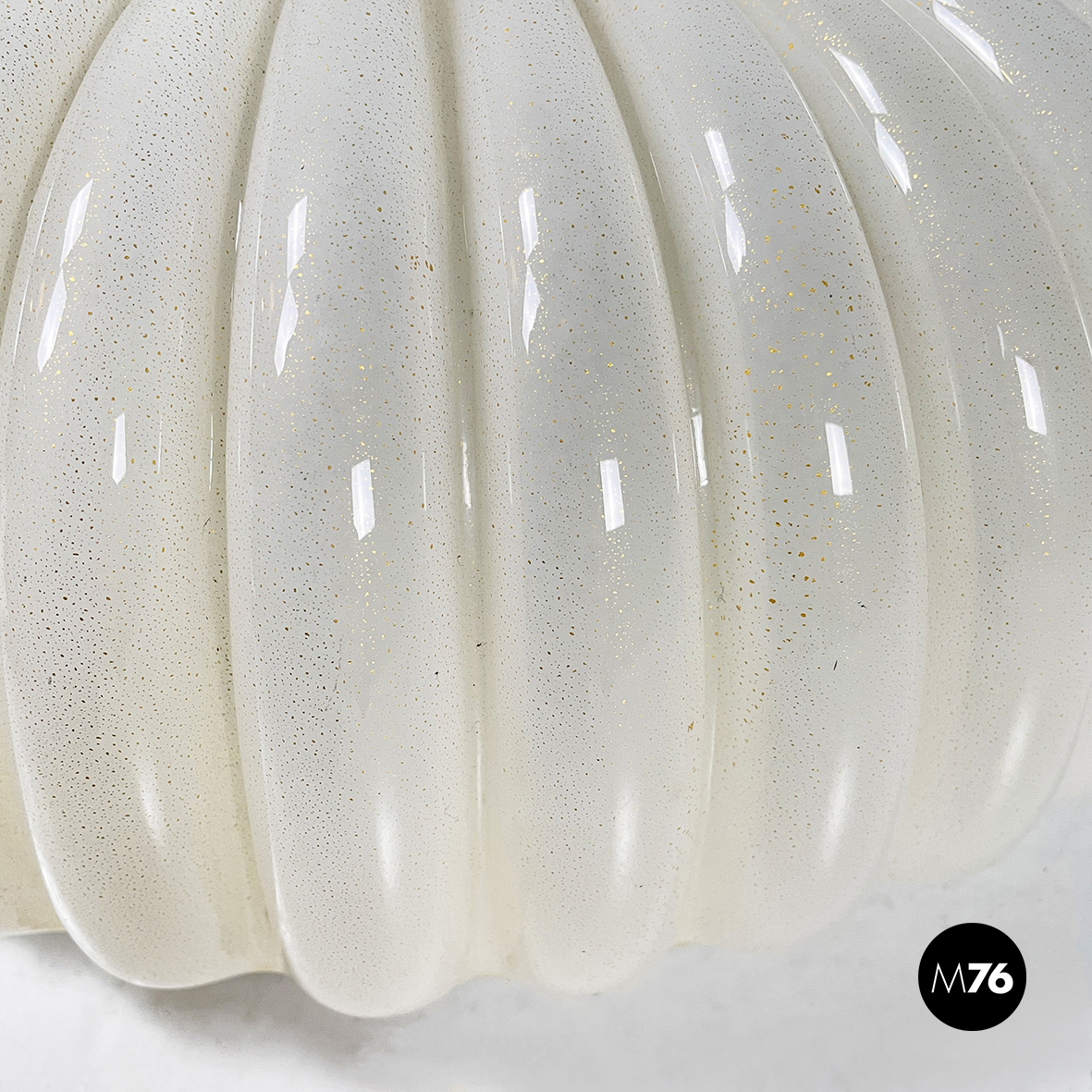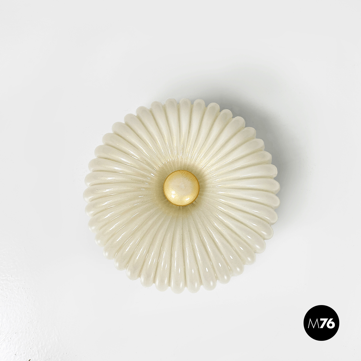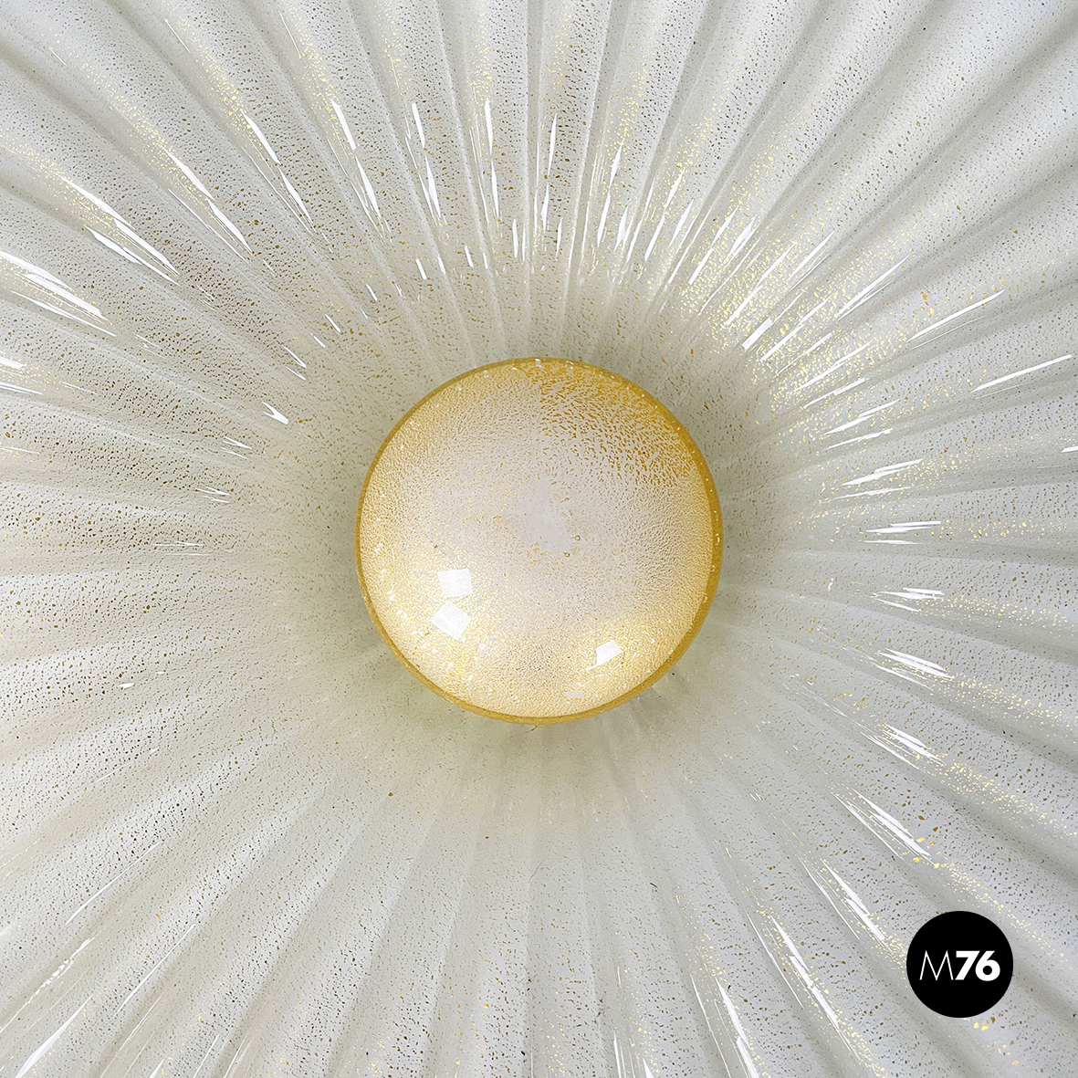 Applique o plafoniera a base tonda in vetro opalino decorato con polvere d’oro. Il diffusore presenta delle scanalature decorative concentriche con al centro un cerchio anche esso in vetro opalino con polvere d’oro. L’attaccatura al parete è in metallo verniciato bianco. All’interno sono presenti 3 attacchi per lampadina. Può essere usata sia come lampada da parete che da soffitto.