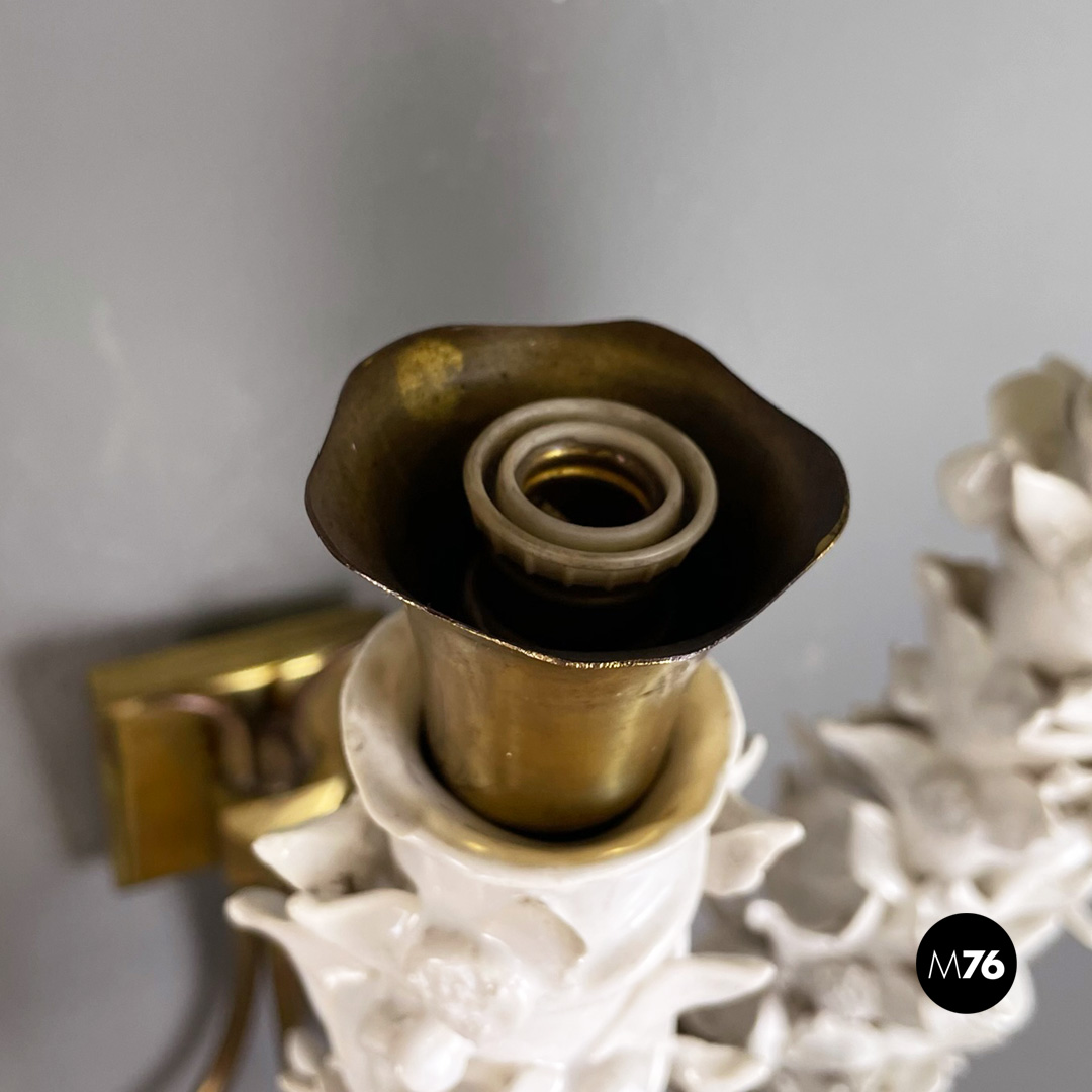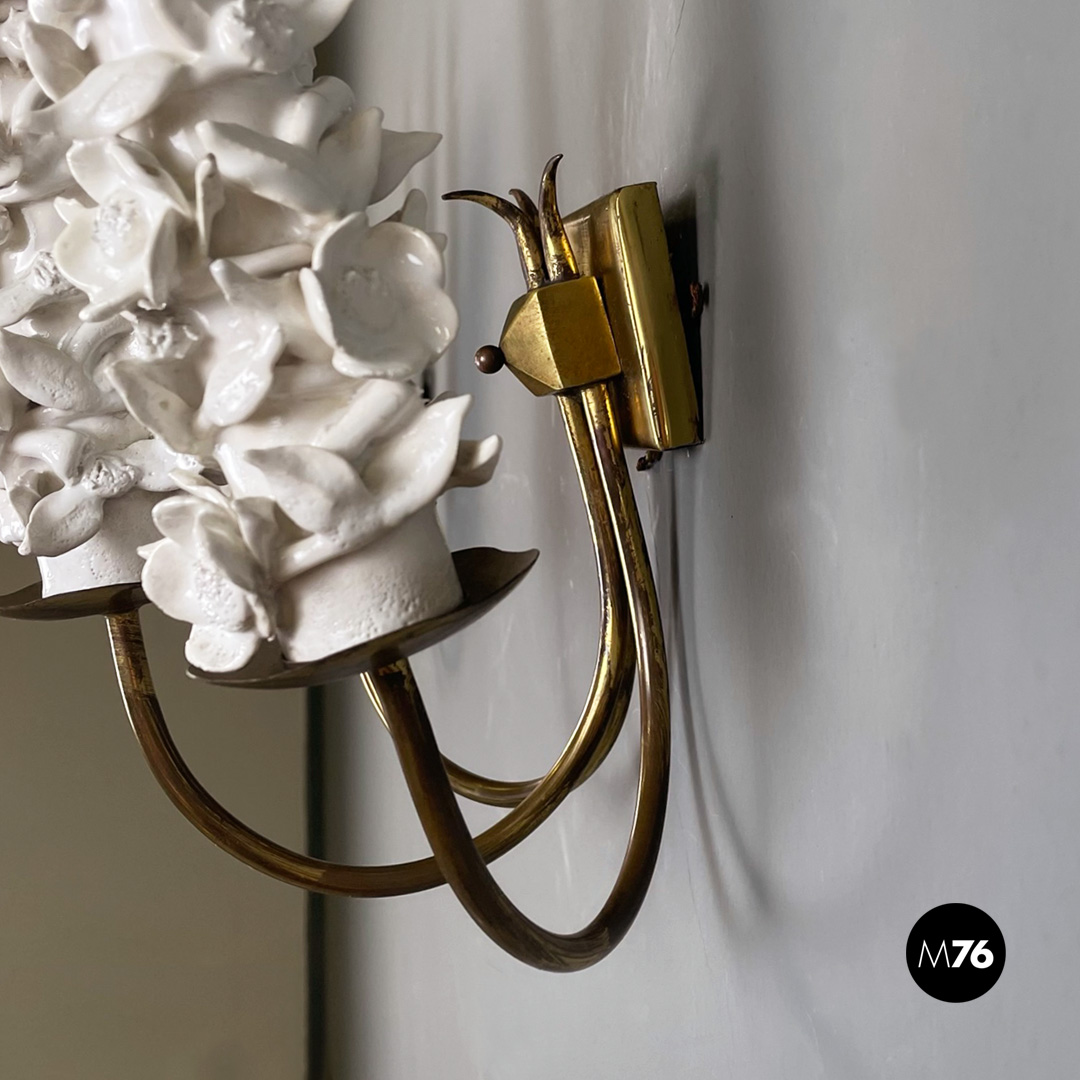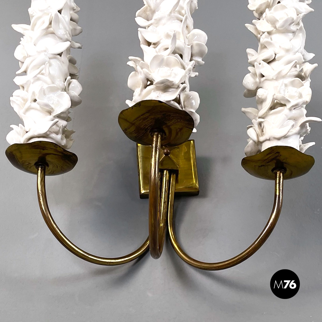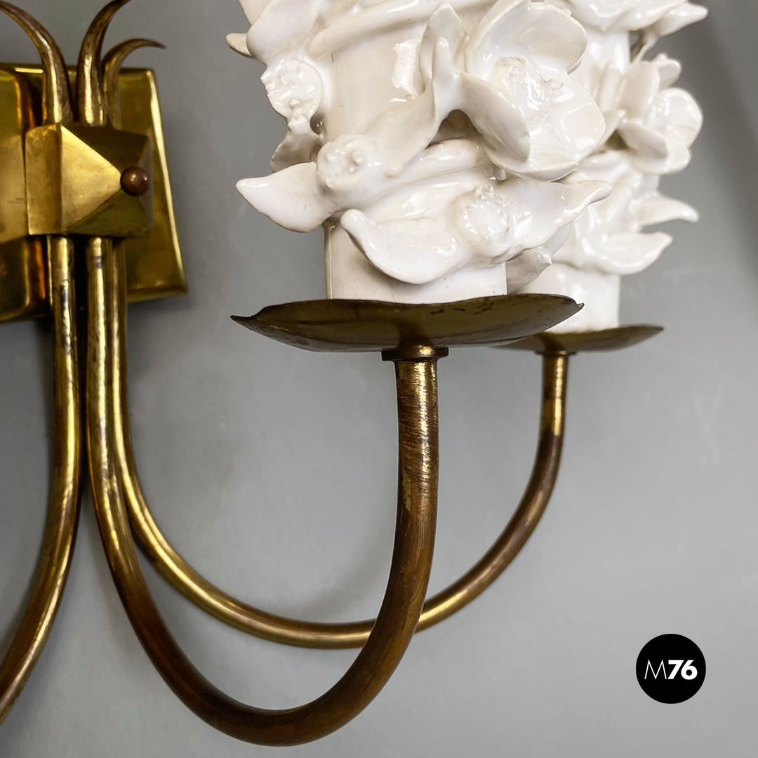Set di tre applique a tre luci in ottone e ceramica. La struttura presenta tre bracci in tondino di ottone e tre diffusori in ottone con decorazione floreale in ceramica bianca.