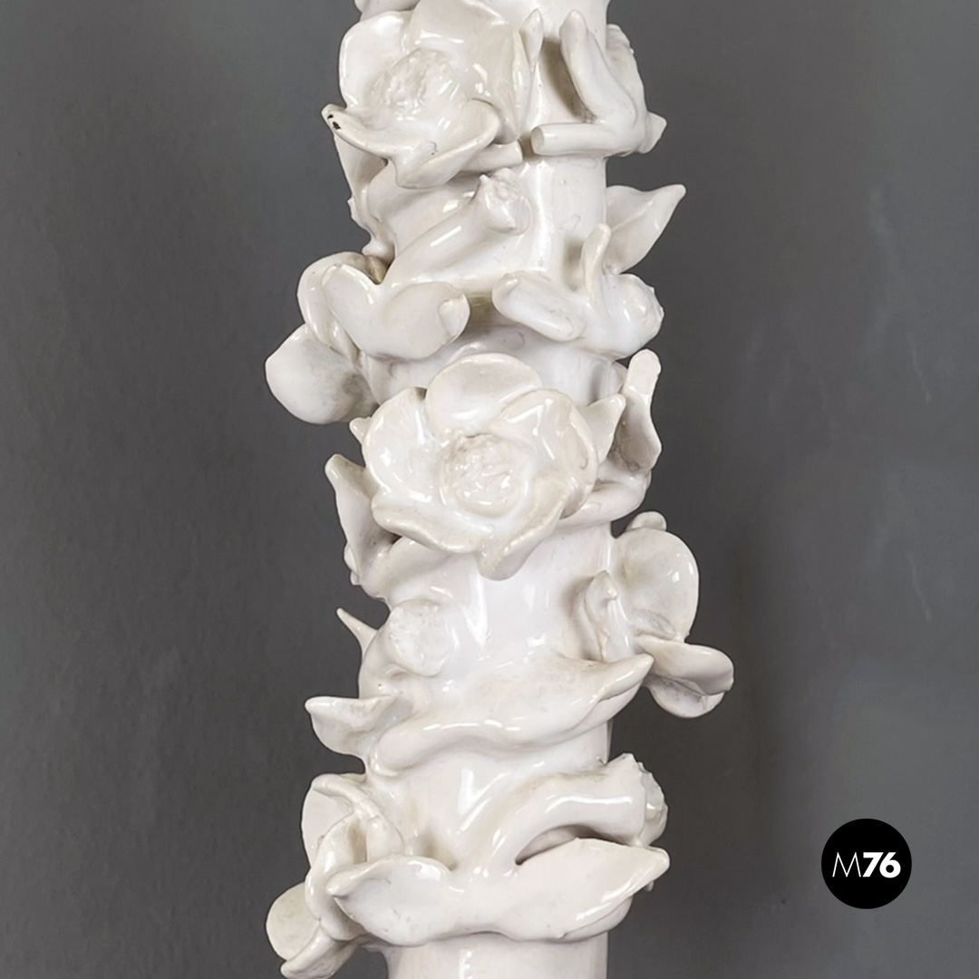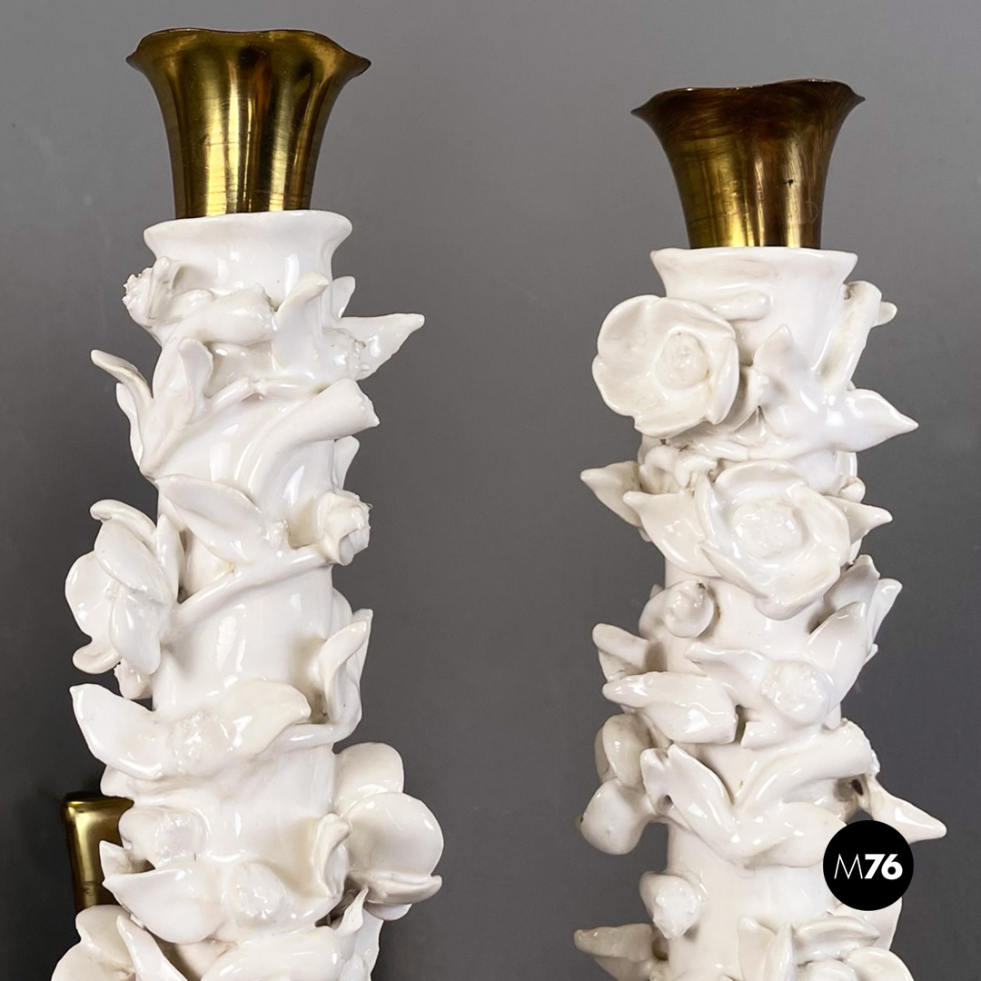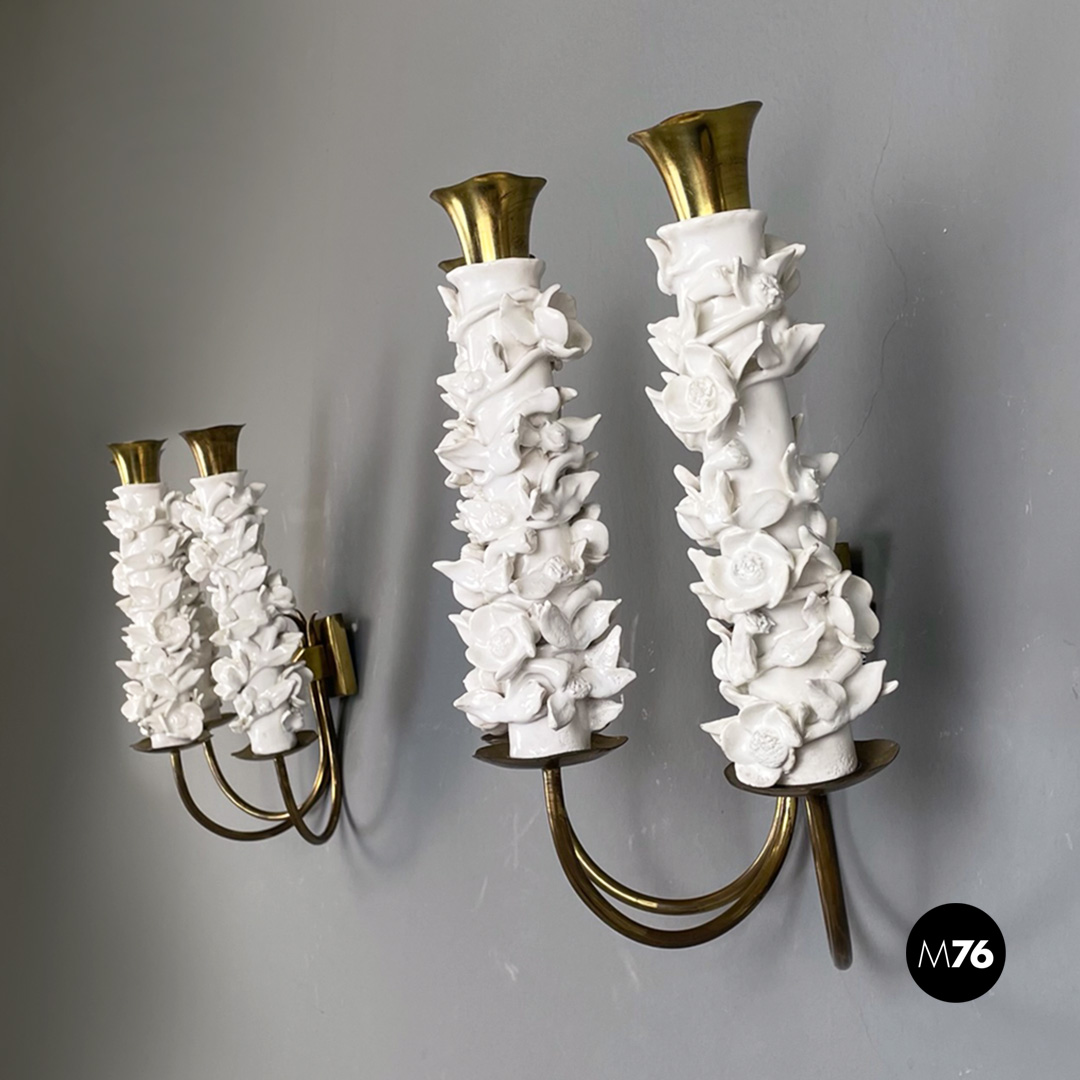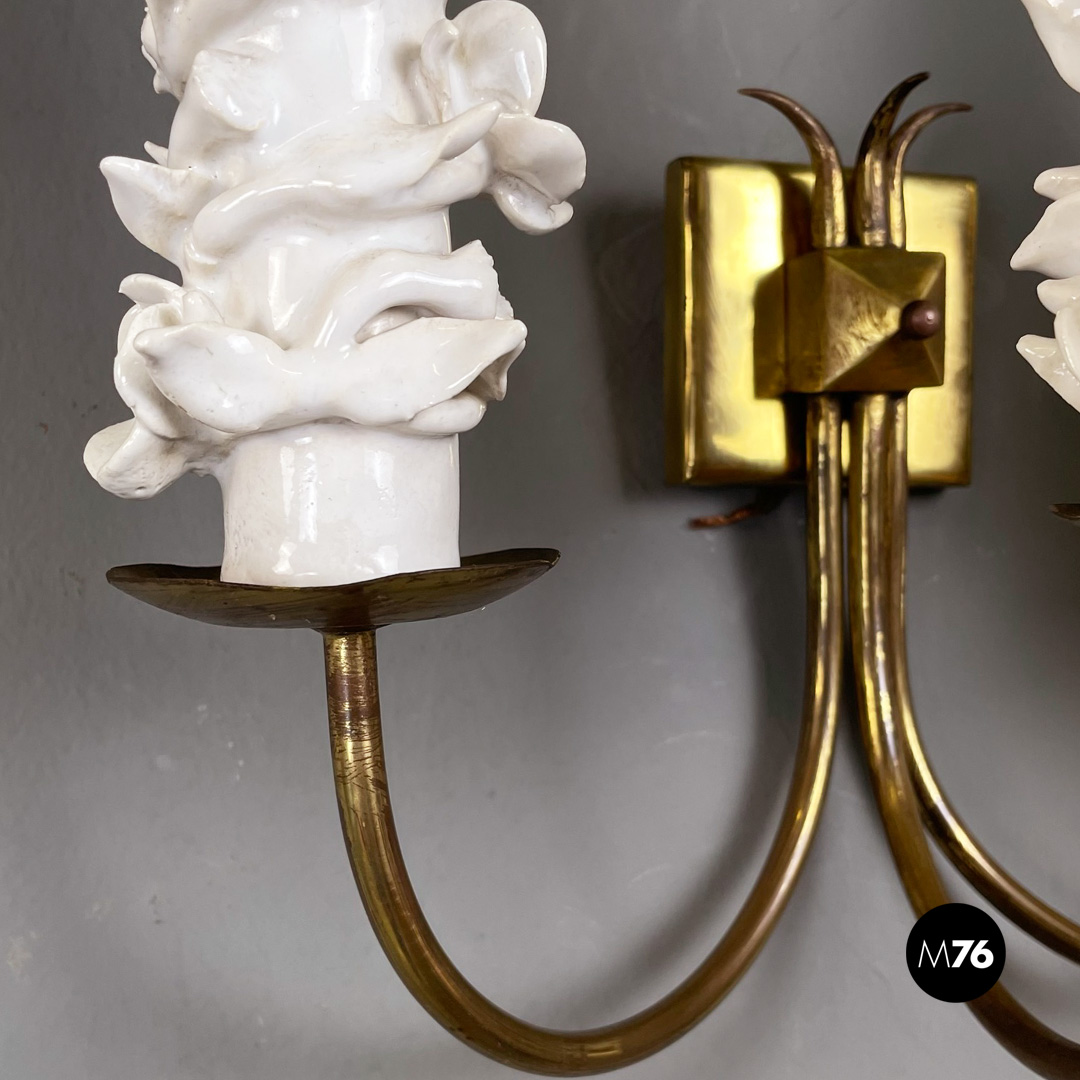 Set di tre applique a tre luci in ottone e ceramica. La struttura presenta tre bracci in tondino di ottone e tre diffusori in ottone con decorazione floreale in ceramica bianca.
