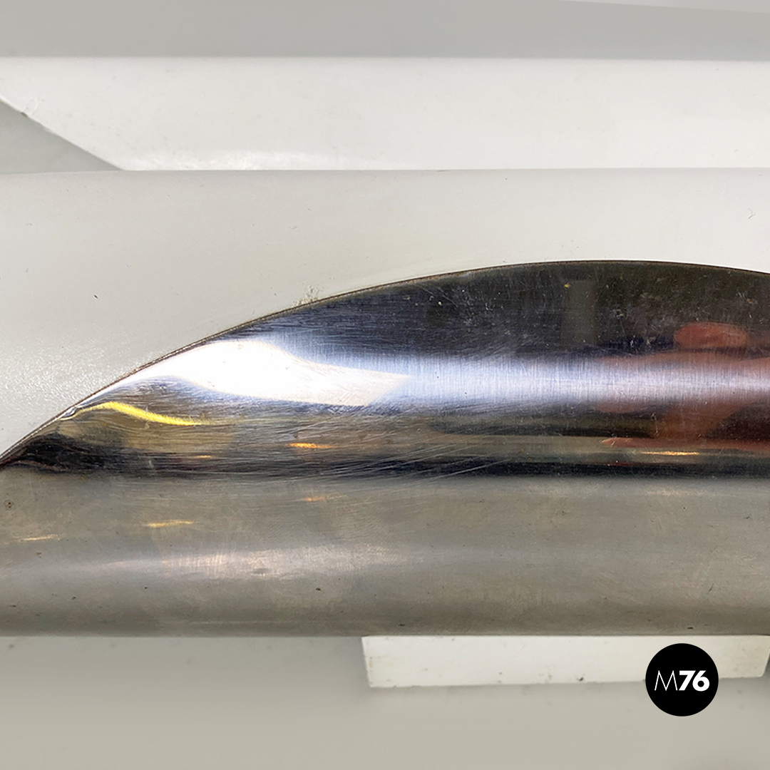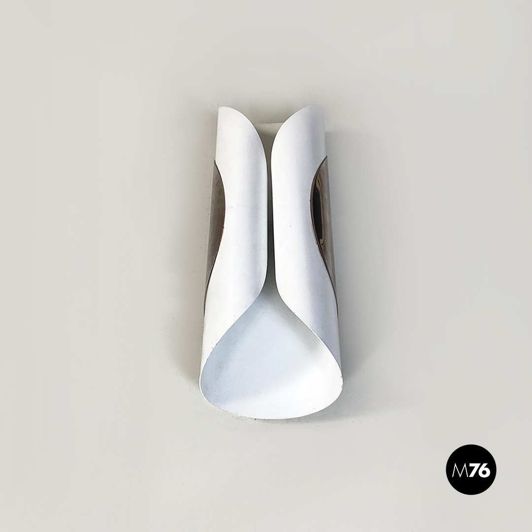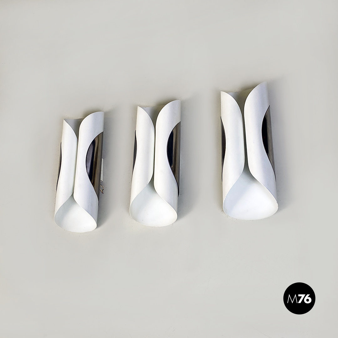 Set di tre applique o lampade da parete con struttura formata da due lamiere curvate una bianca interna più grande avvolta da un’altra lamiera con finitura cromata più piccola. Ogni pezzo supporta quattro lampadine E14.