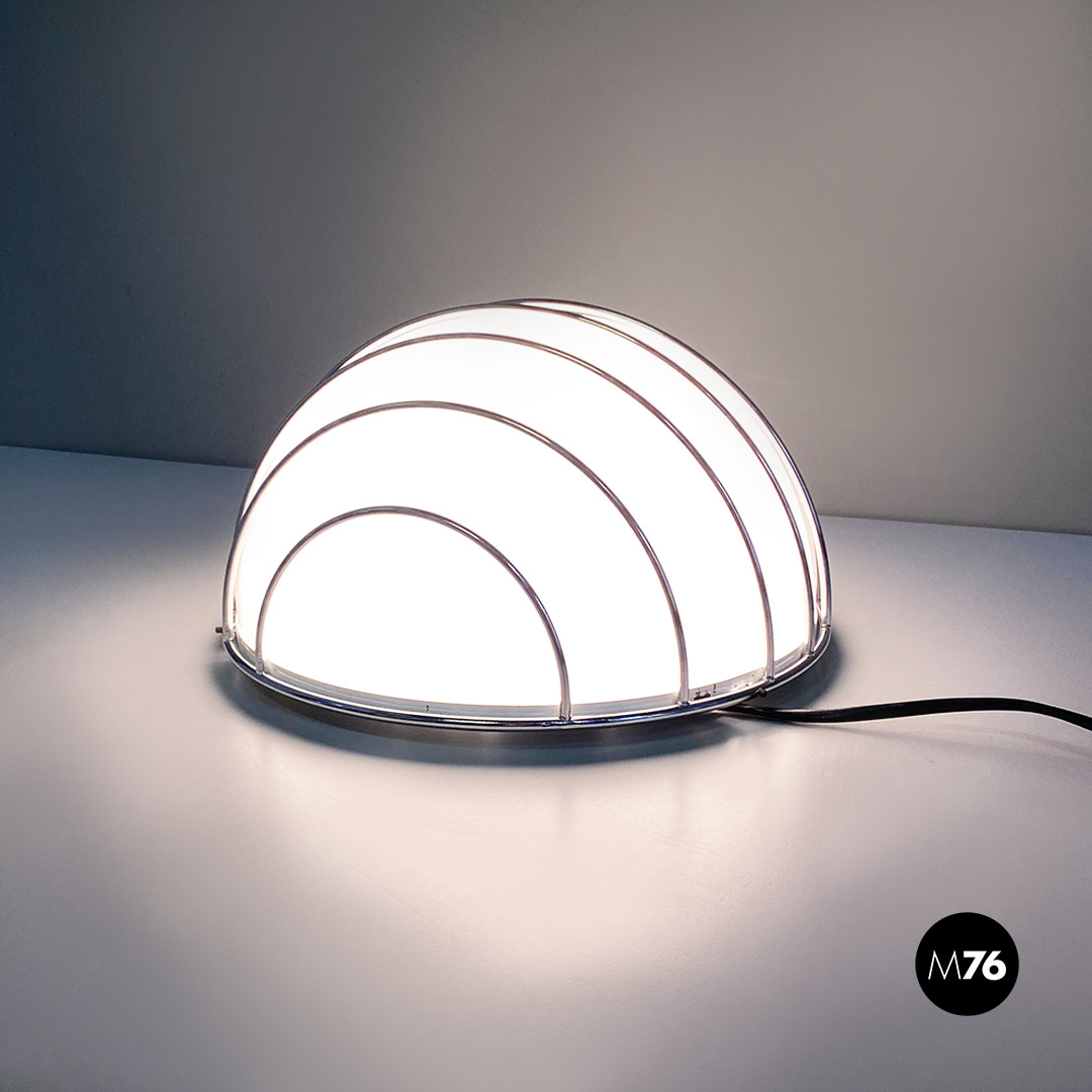 Lampada da parete modificata per essere anche una lampada da tavolo di forma semisferica con diffusore in plastica bianco posto all’interno di una griglia in tondino di metallo cromato.