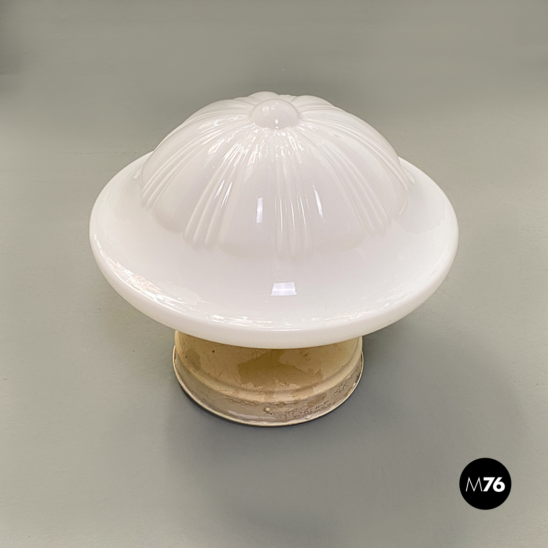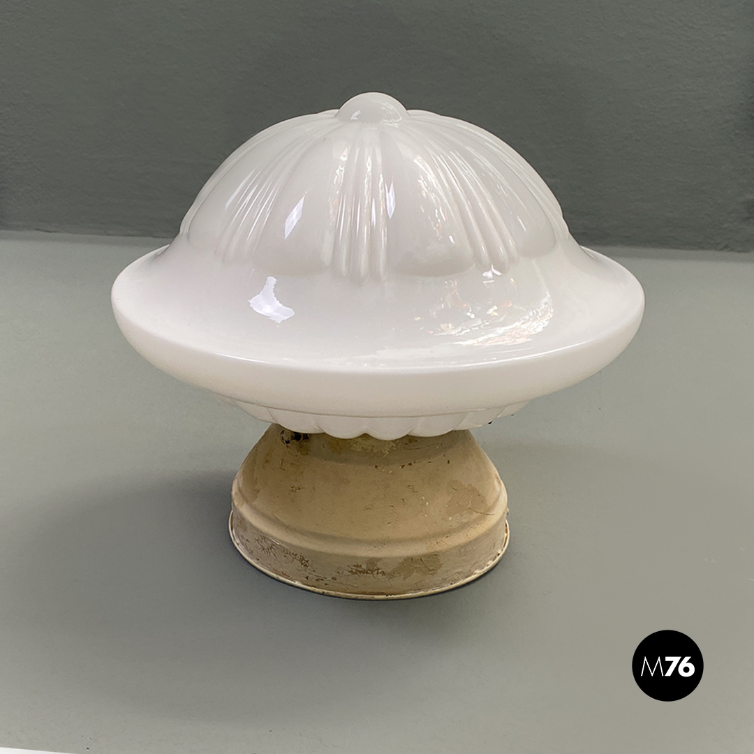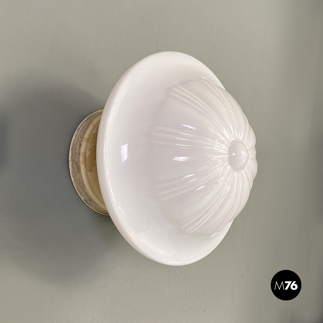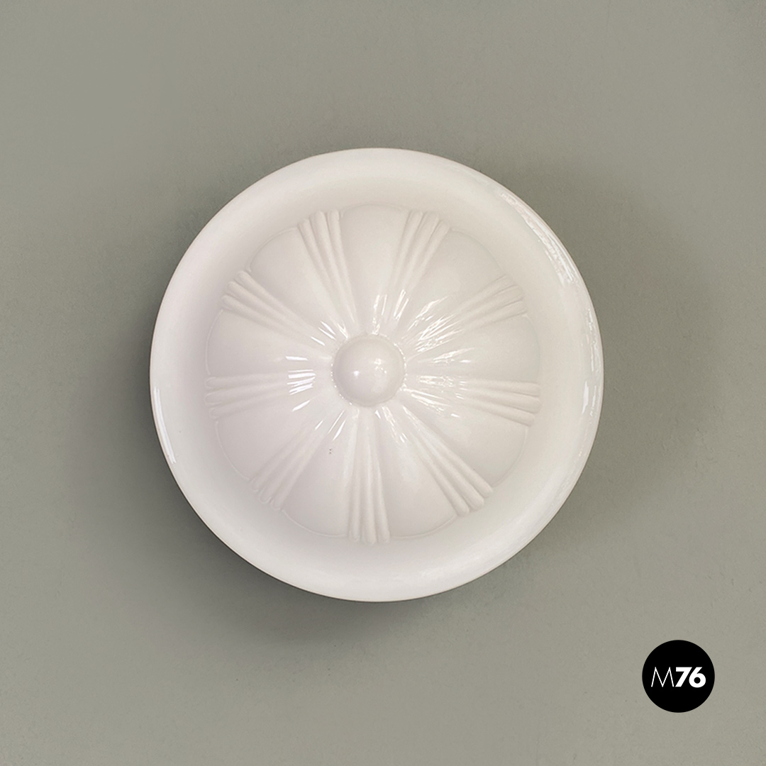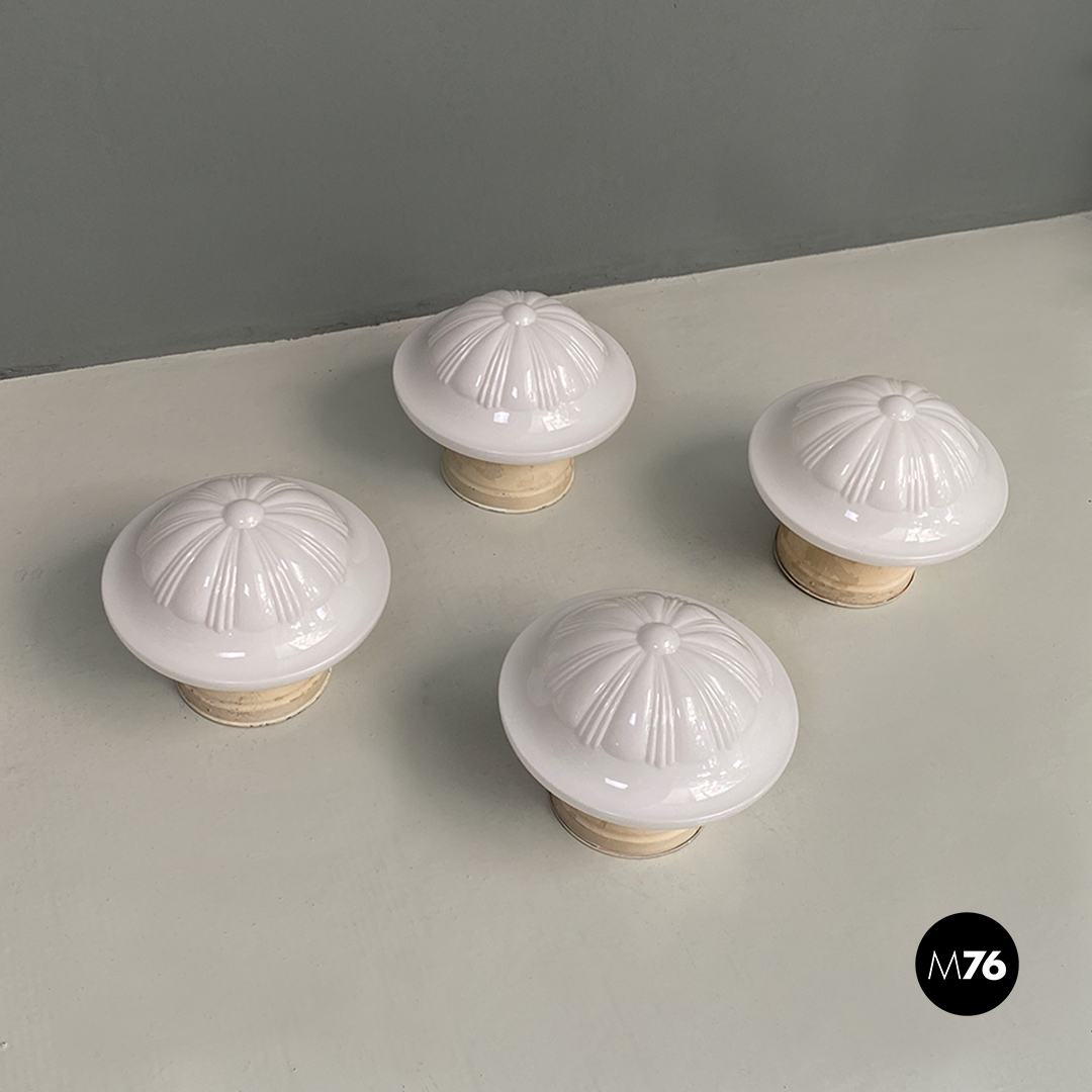 Set di quattro plafoniere o applique a base tonda con paralume in vetro bianco con decorazione concentrica. La struttura da muro è in metallo verniciato bianco.
