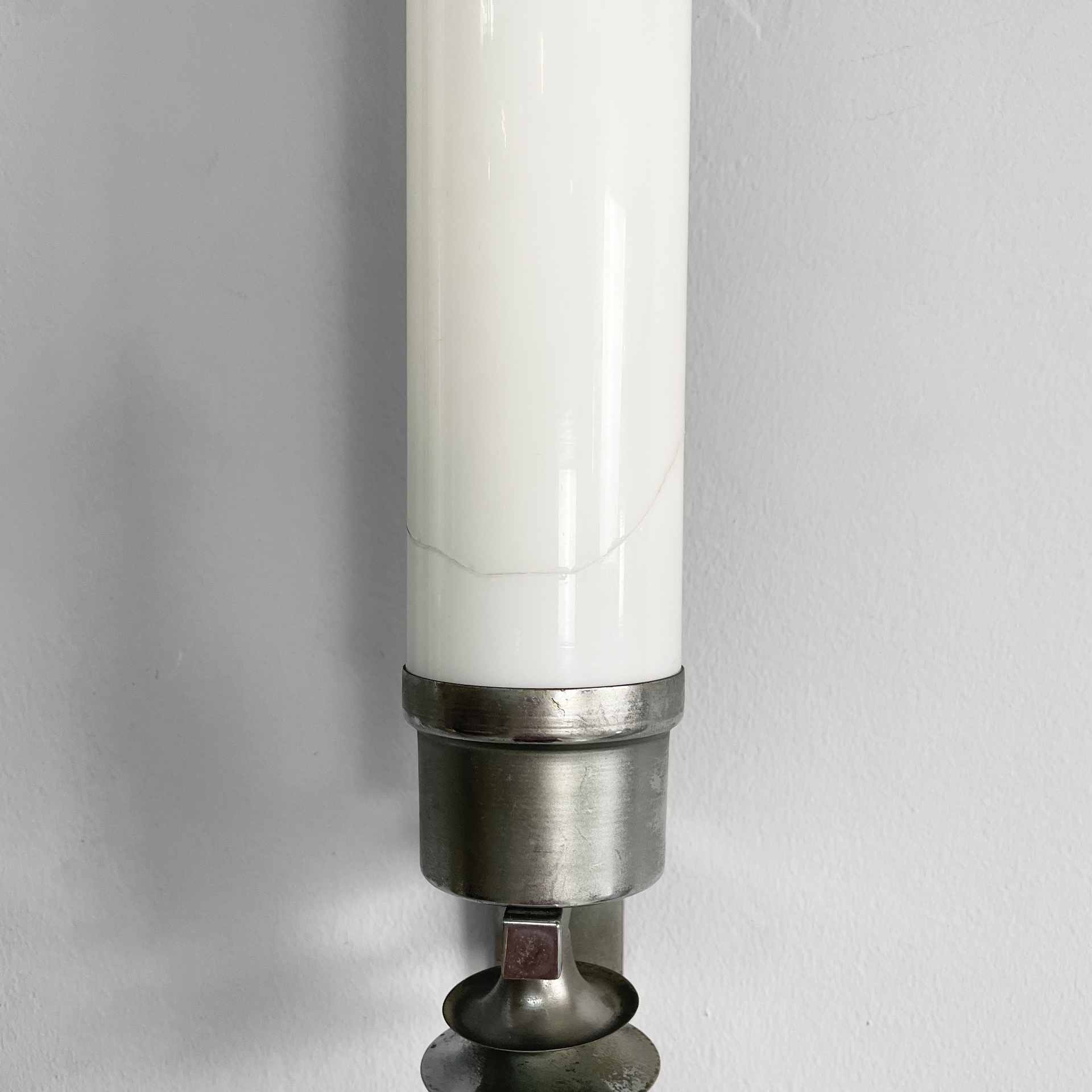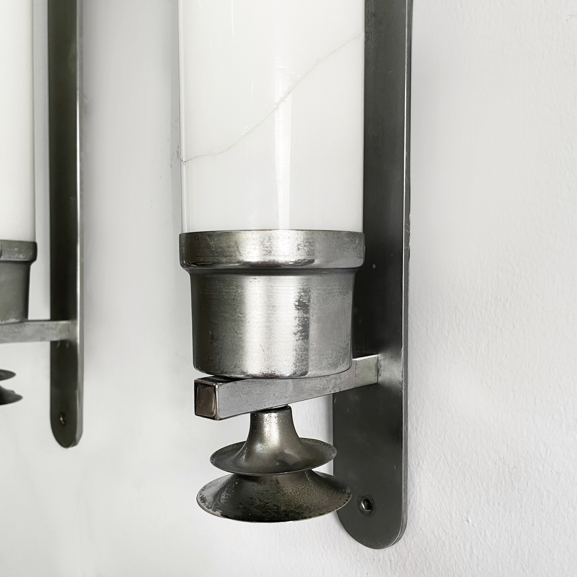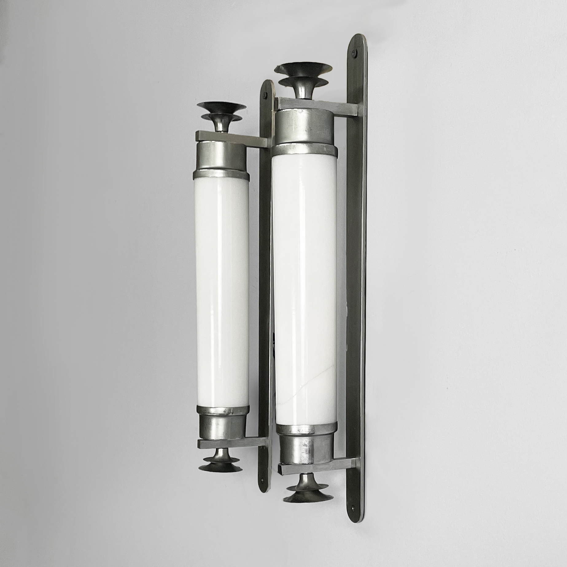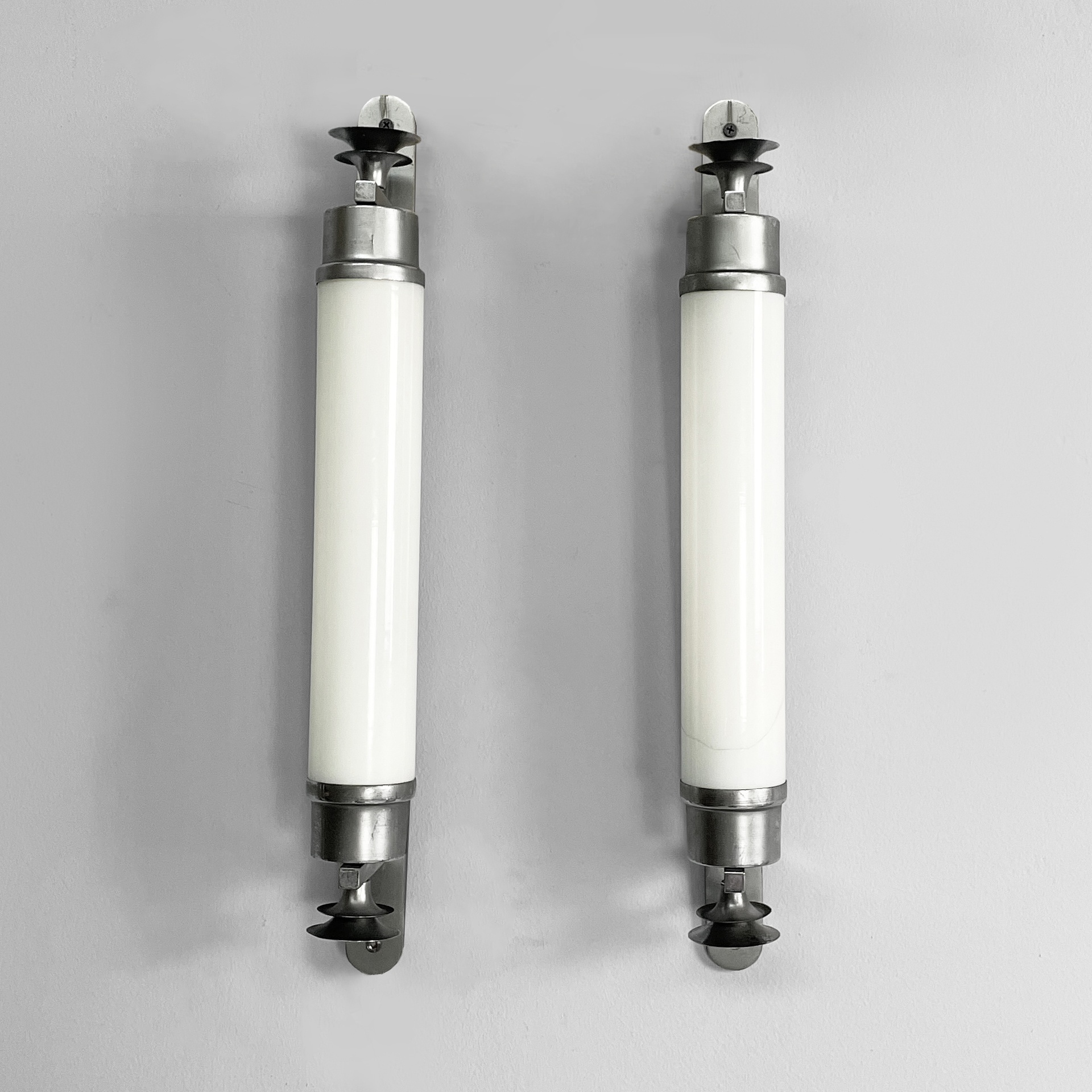 Coppia di applique o lampade da parete con diffusore cilindrico in vetro opalino con le estremità in metallo. All’interno sono presenti due lampadine E27. Alle estremità sono presenti delle decorazioni metalliche. Due listelli orizzontali collegano il diffusore all’attacco a parete ovale in metallo. Utilizzabili anche in orizzontale. Art Deco.