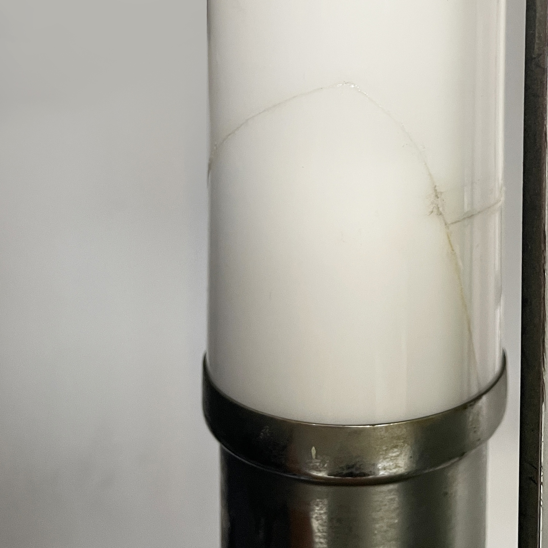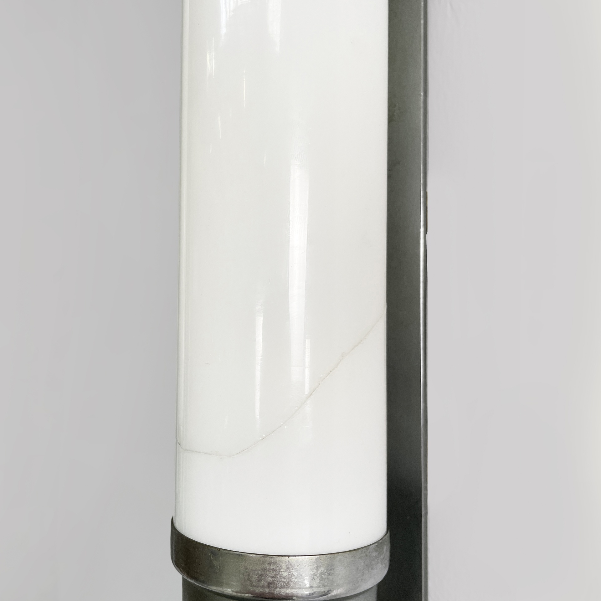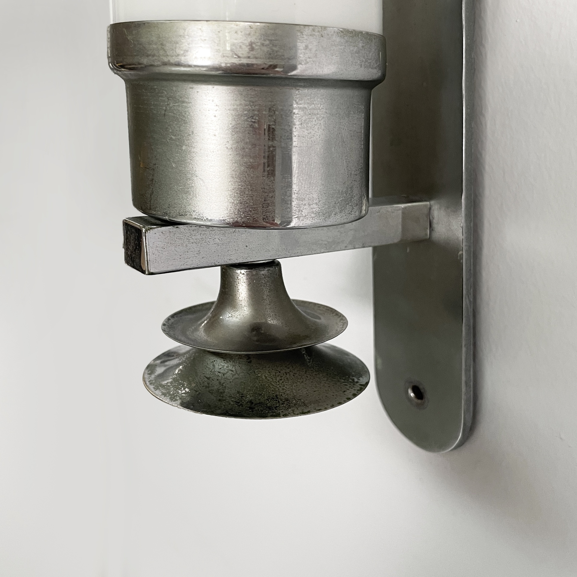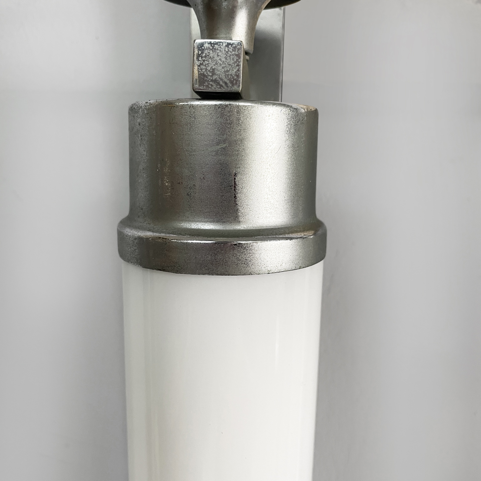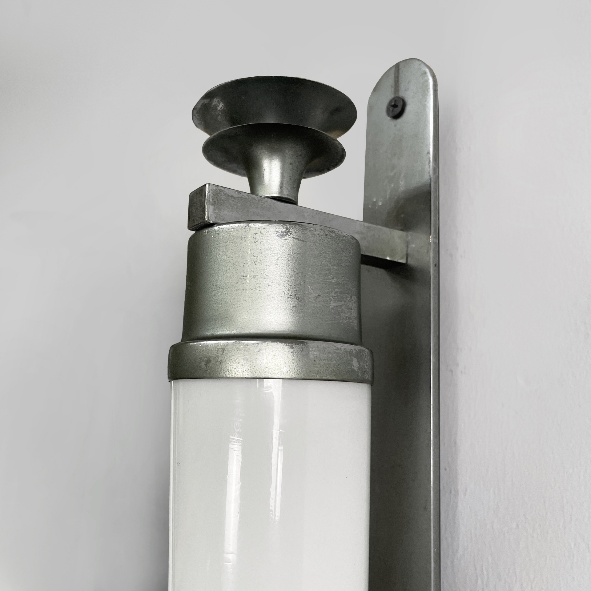 Coppia di applique o lampade da parete con diffusore cilindrico in vetro opalino con le estremità in metallo. All’interno sono presenti due lampadine E27. Alle estremità sono presenti delle decorazioni metalliche. Due listelli orizzontali collegano il diffusore all’attacco a parete ovale in metallo. Utilizzabili anche in orizzontale. Art Deco.
