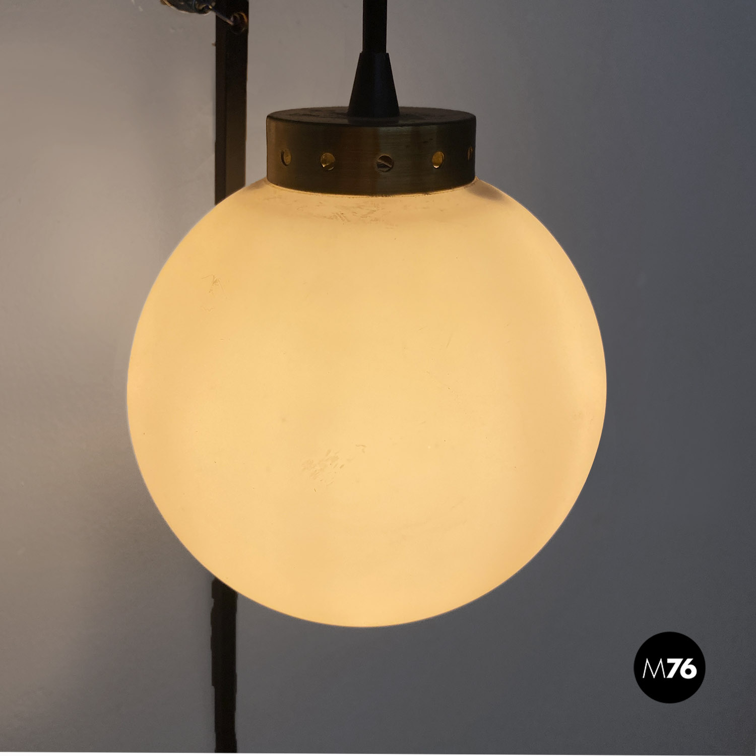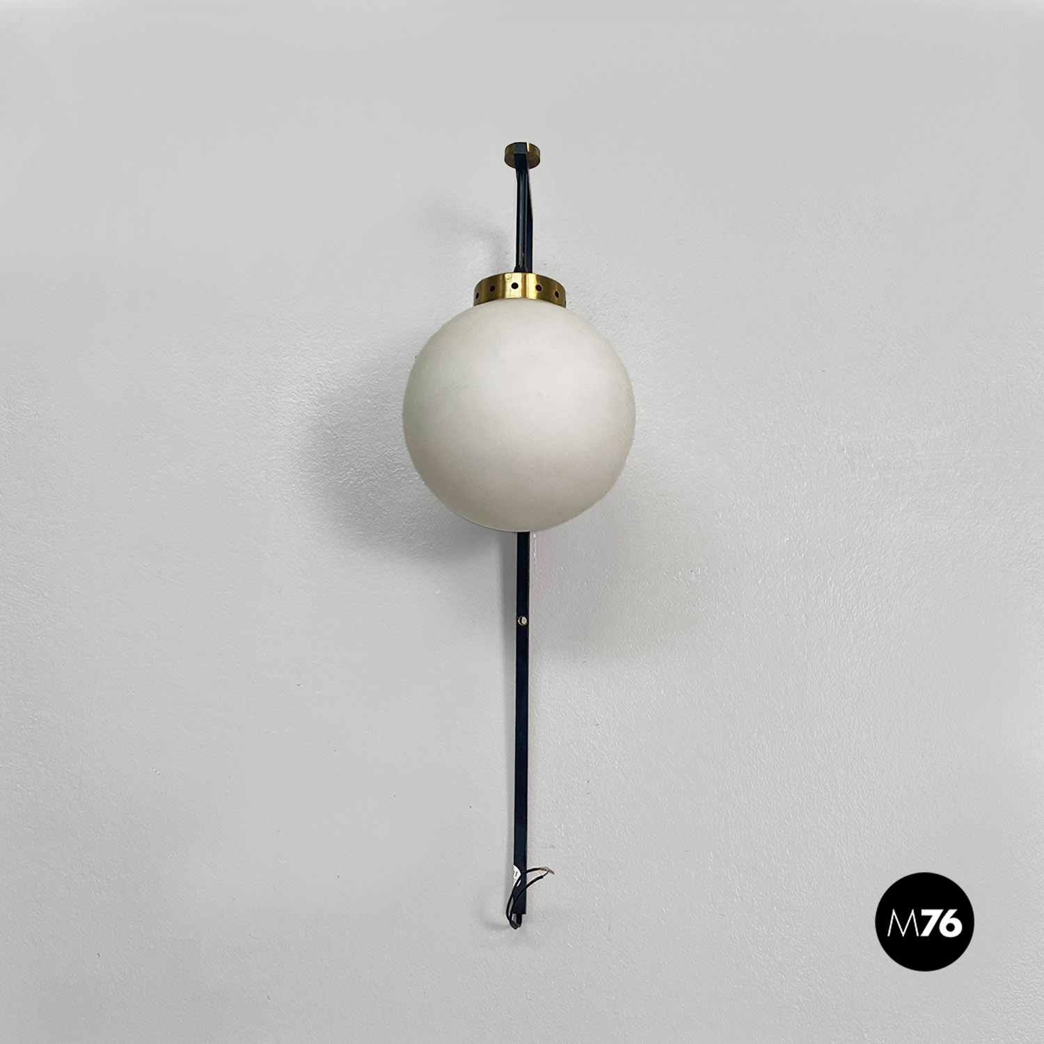Applique con struttura in metallo nero a sezione quadrata e paralume sospeso in vetro opaline di forma sferica con eleganti dettagli in ottone.