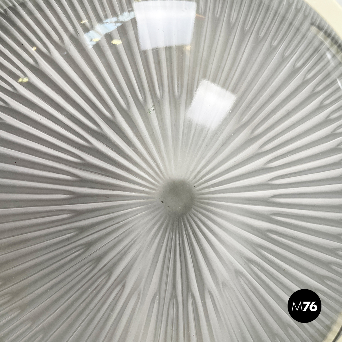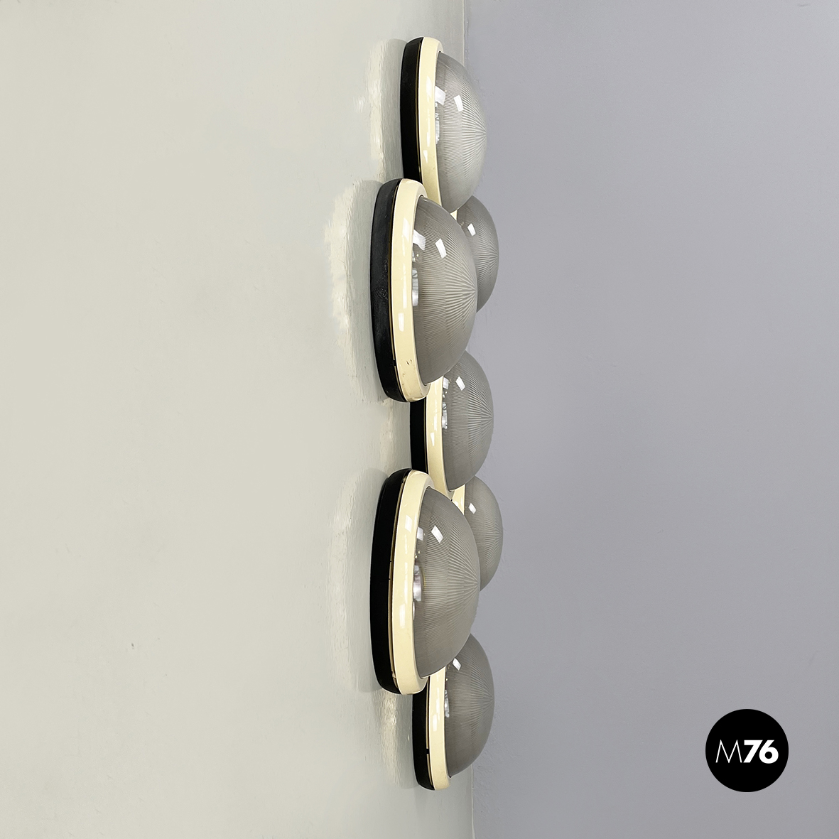 Set di sette applique o lampade da parete con diffusore a semisfera in vetro stampato. La struttura a base tonda è in plastica beige con finitura lucida e nera con finitura opaca. Utilizzabili come lampade da soffitto o plafoniere.