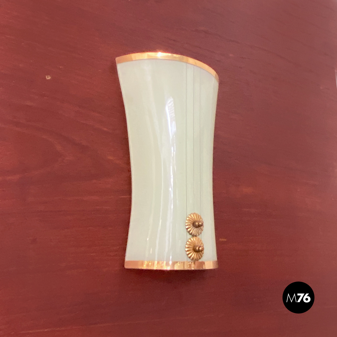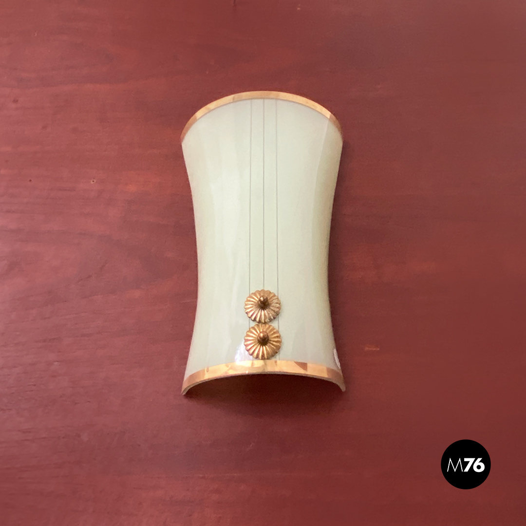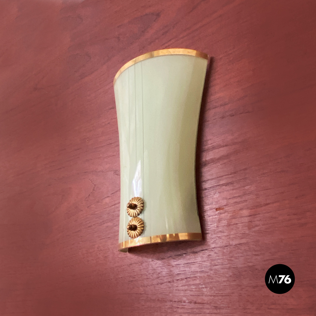 Applique dalla forma curva con vetro verde chiaro motivo con doppia linea centrale in ottone così come i profili e gli altri dettagli visibili.