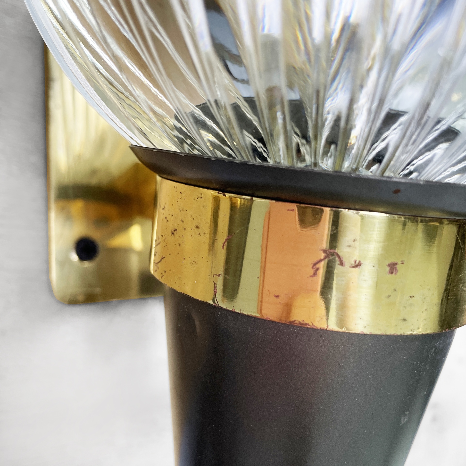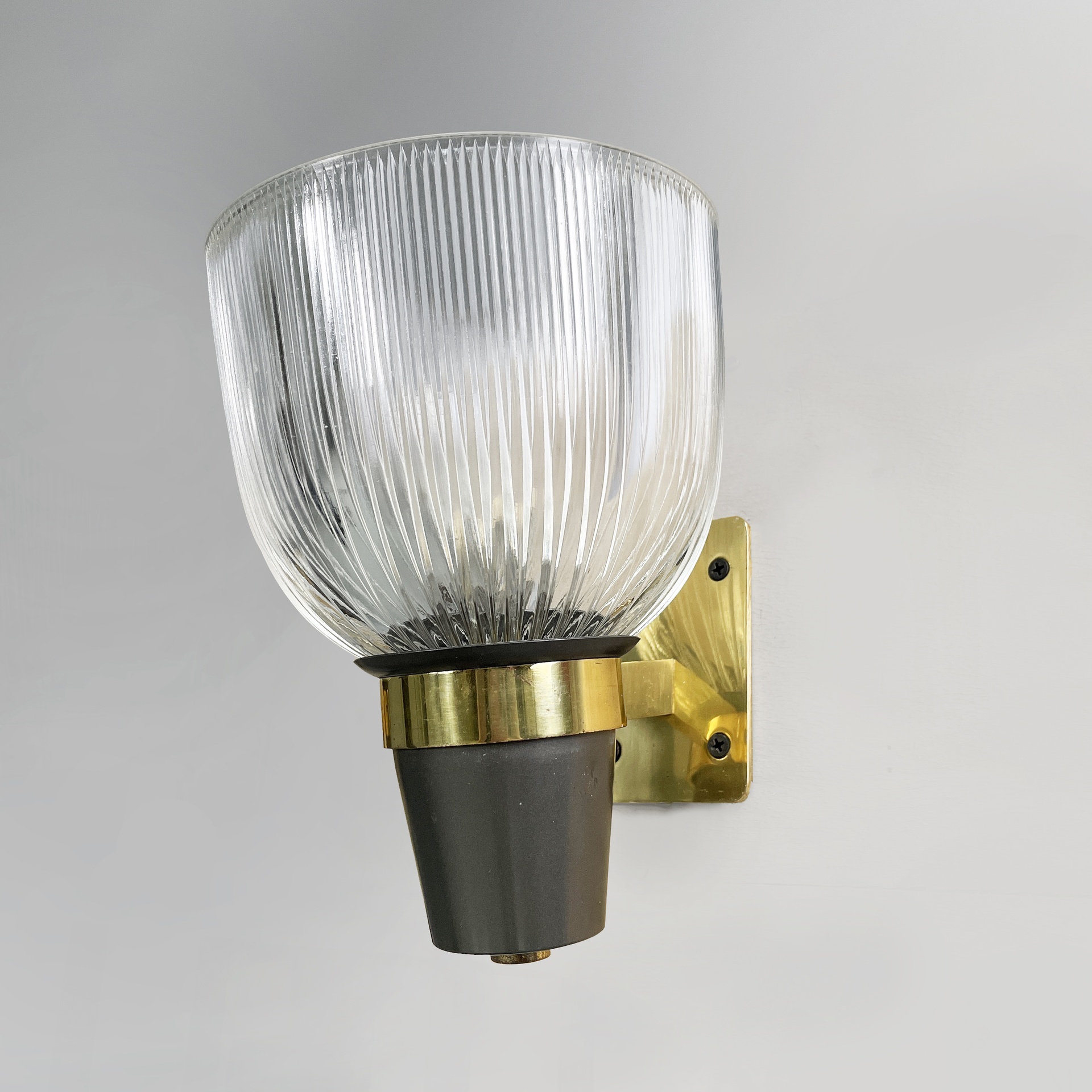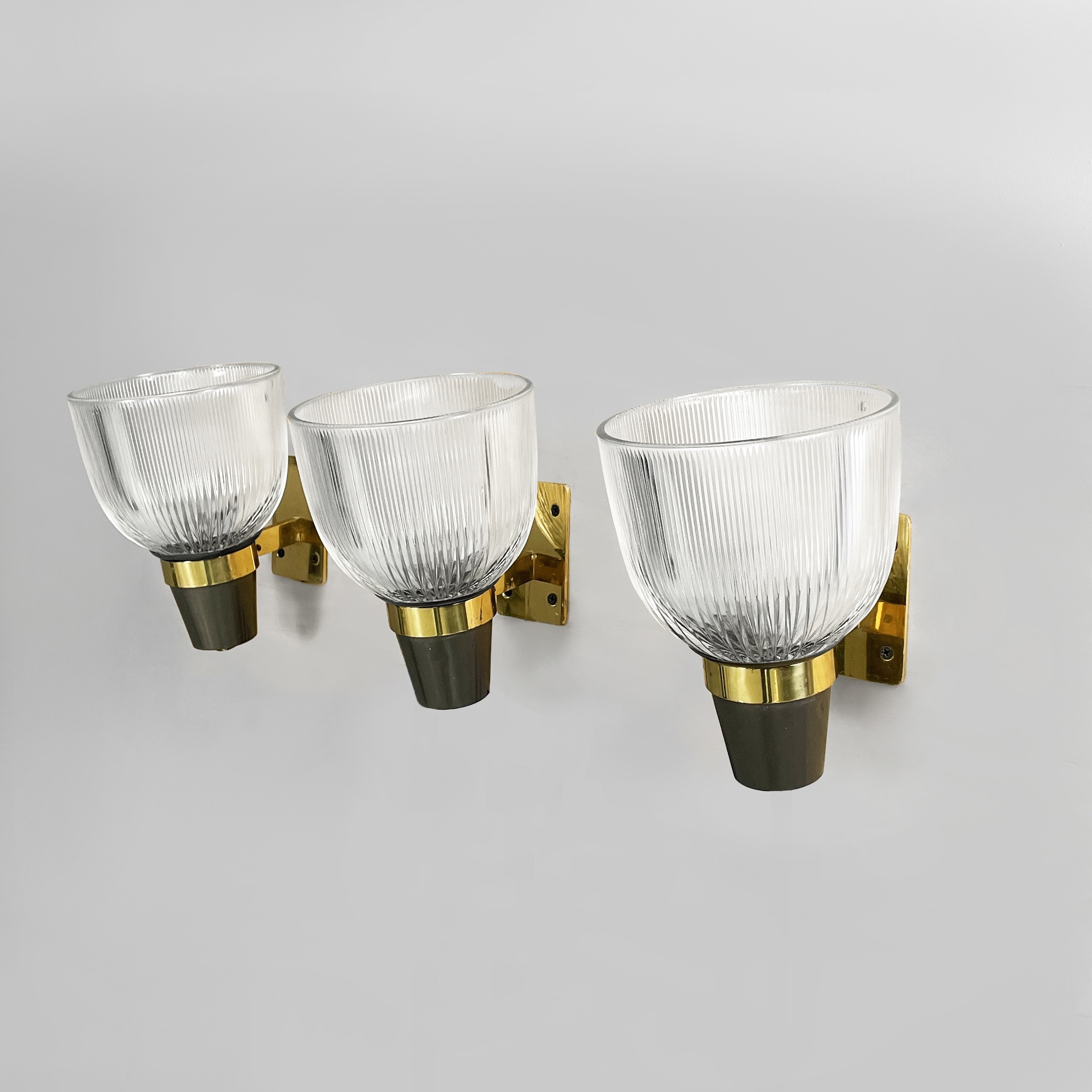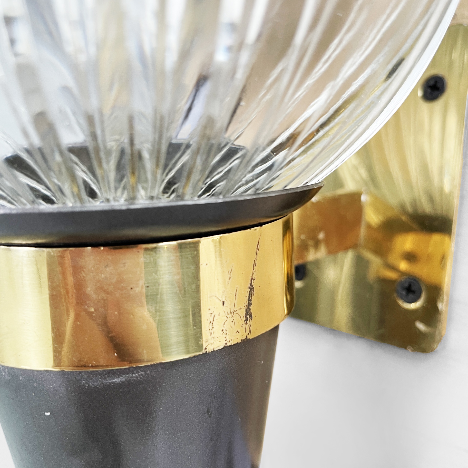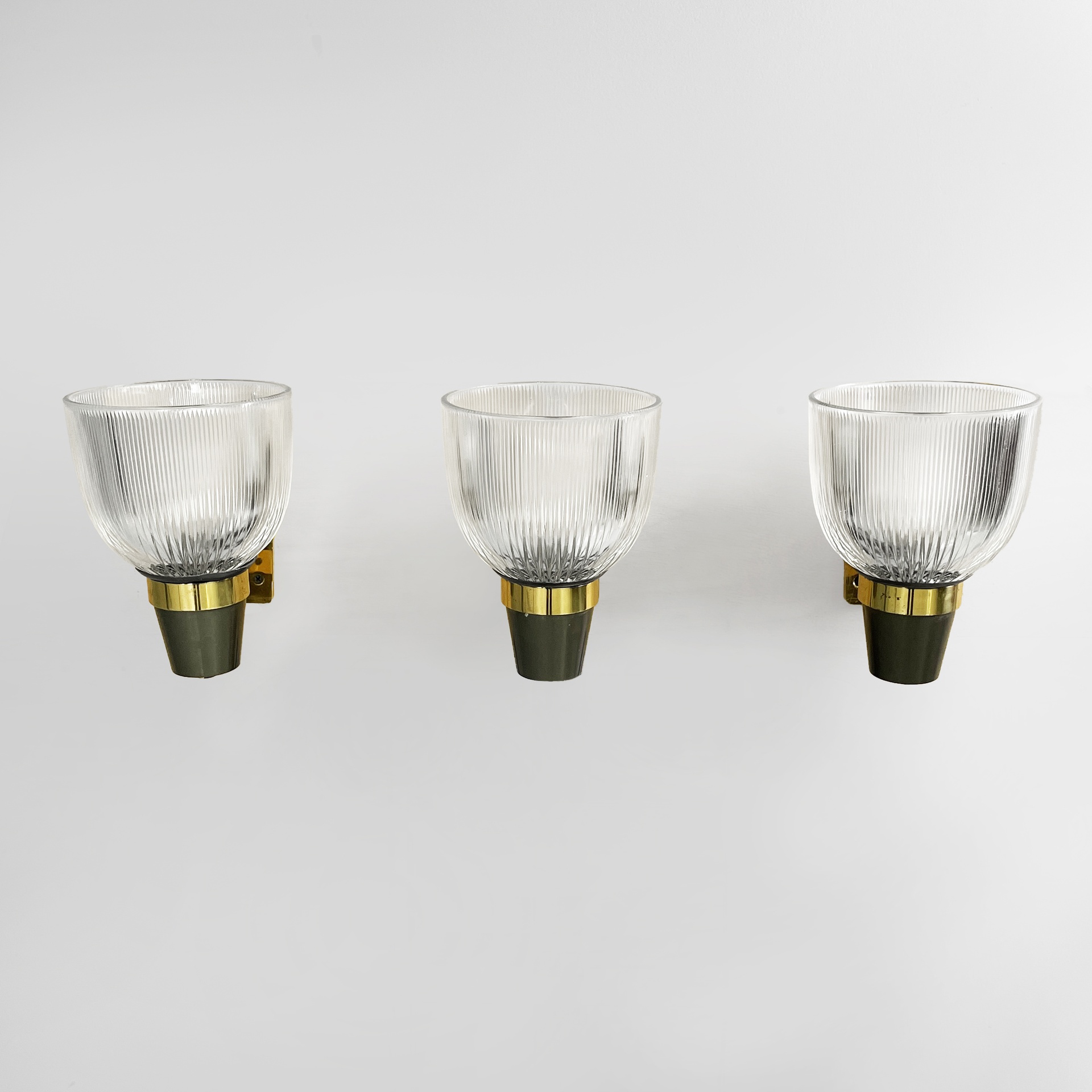 Set di tre applique o lampade da parete modello LP5 con diffusore a cupola in vetro stampato. La struttura conica in metallo verniciato nero presenta nella parte superiore una fascia in ottone. La struttura si collega all’attacco a parete rettangolare grazie ad una listello in ottone.