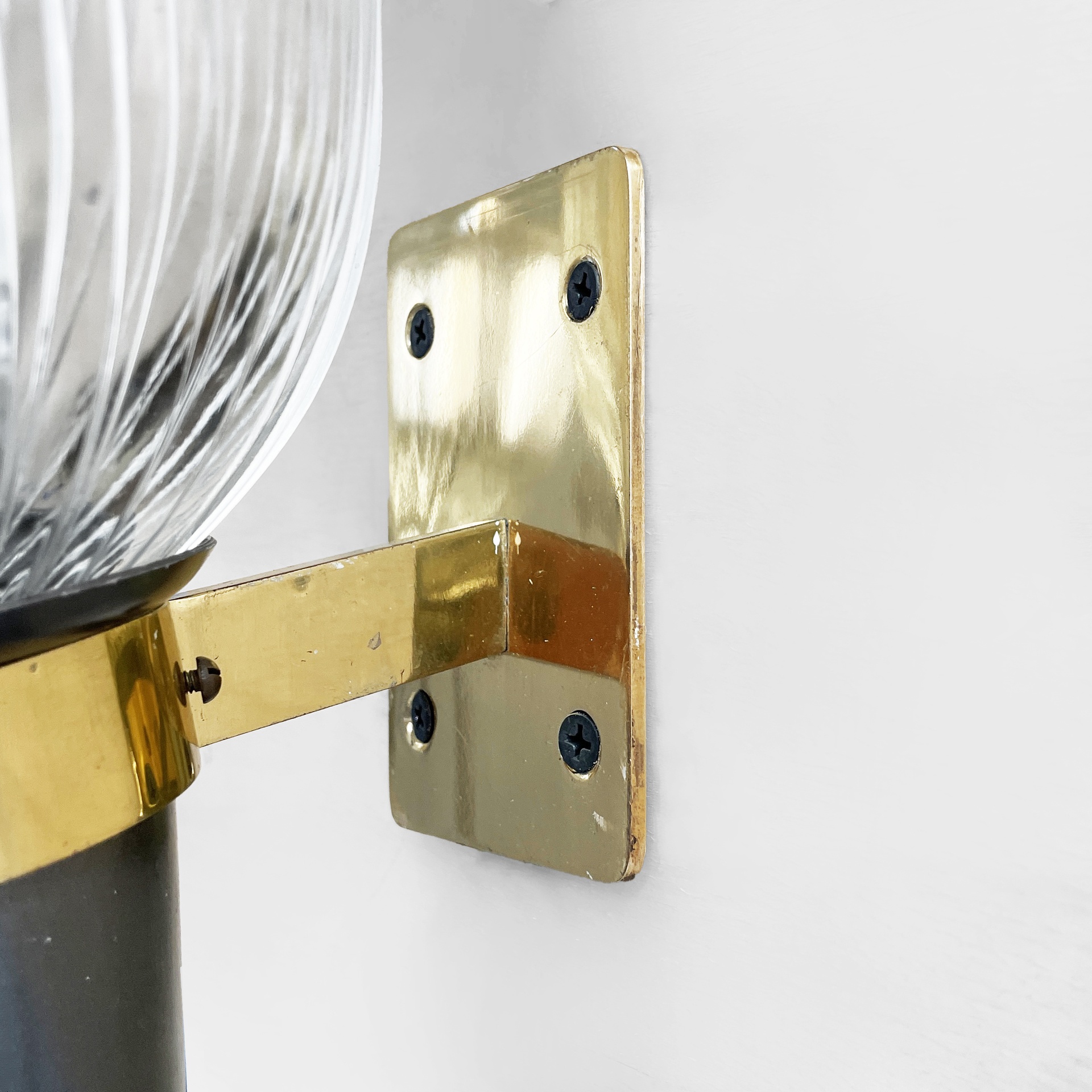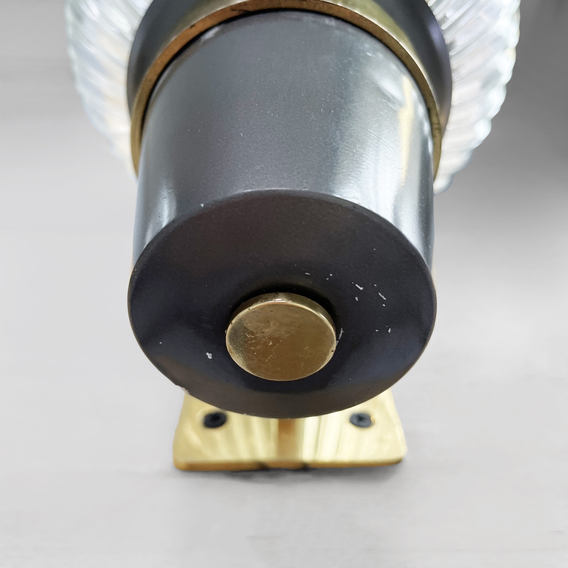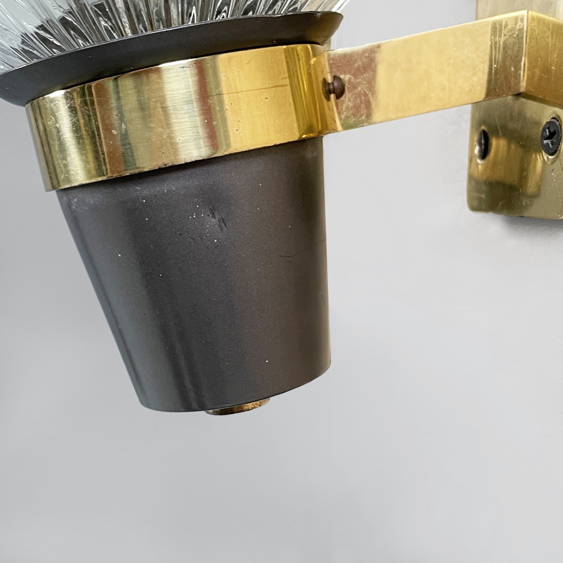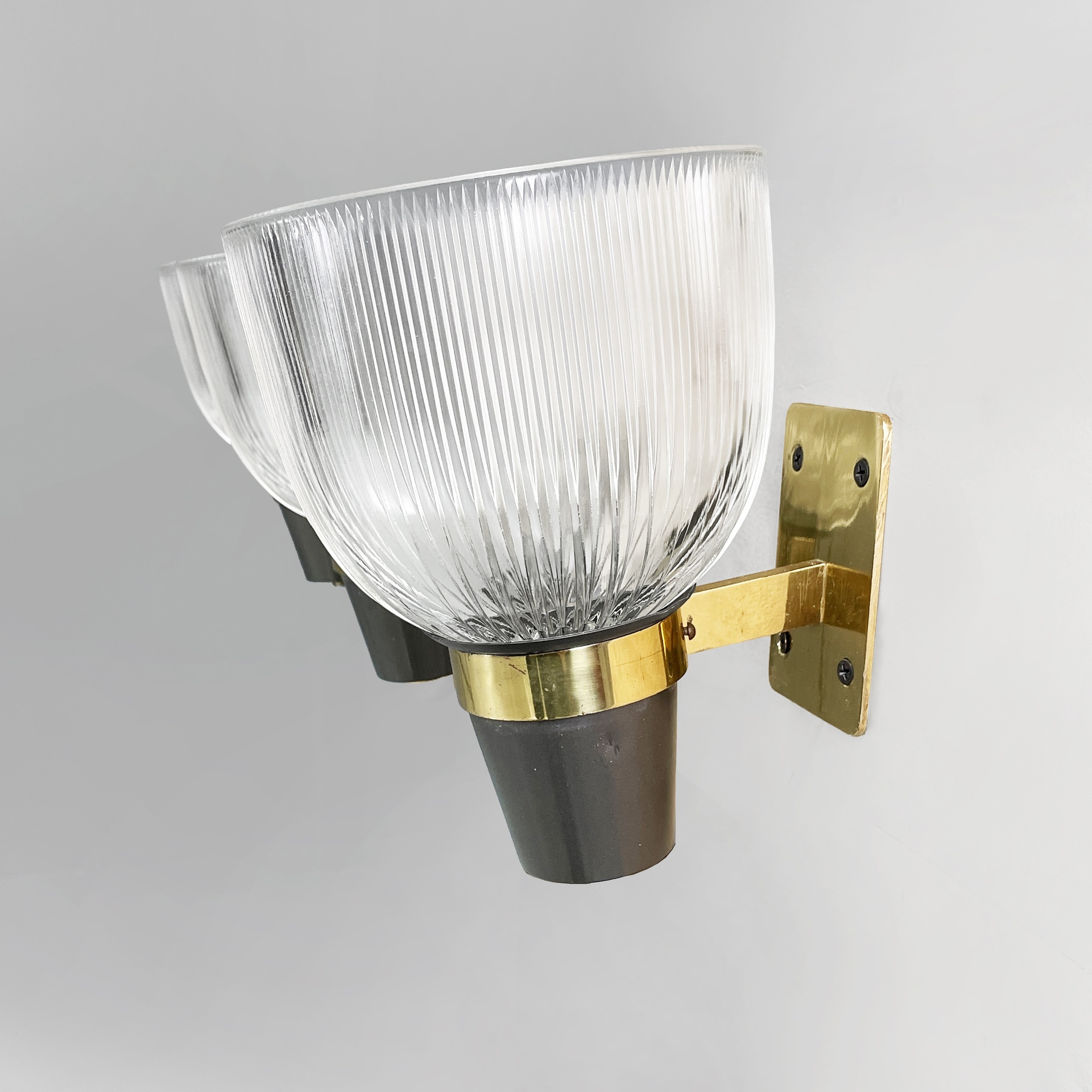 Set di tre applique o lampade da parete modello LP5 con diffusore a cupola in vetro stampato. La struttura conica in metallo verniciato nero presenta nella parte superiore una fascia in ottone. La struttura si collega all’attacco a parete rettangolare grazie ad una listello in ottone.