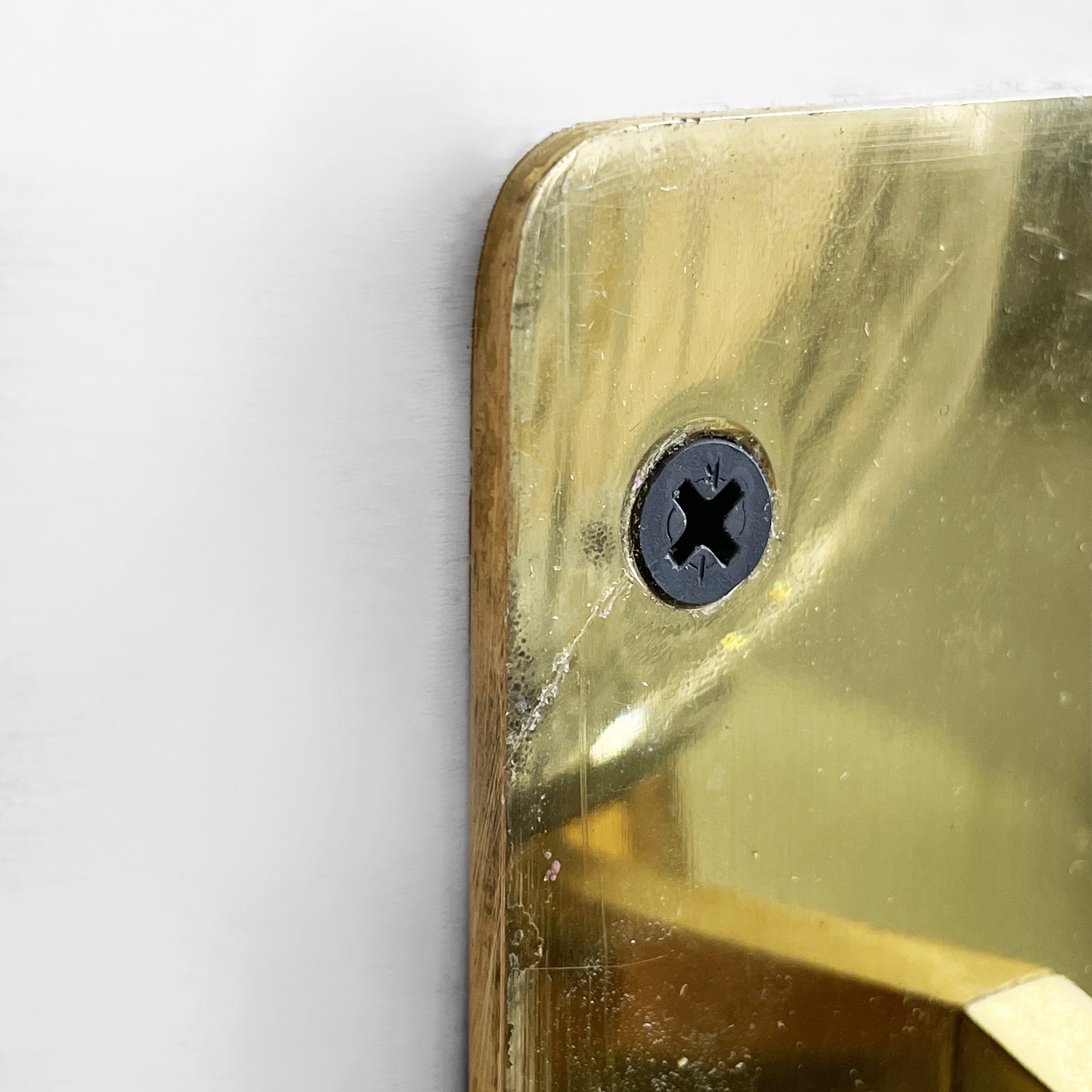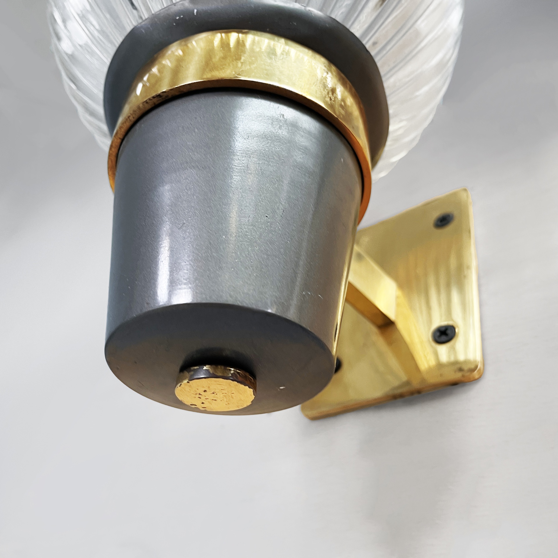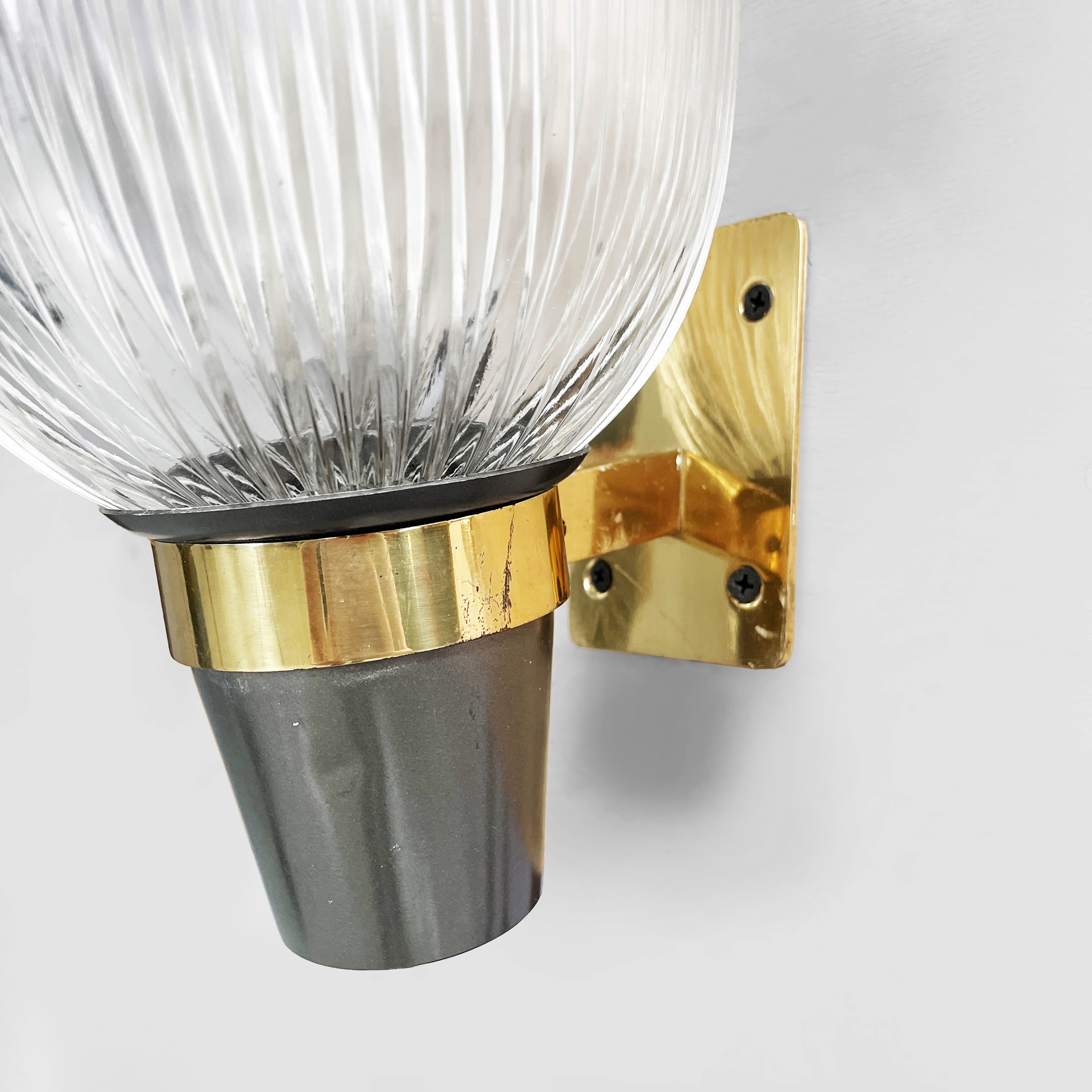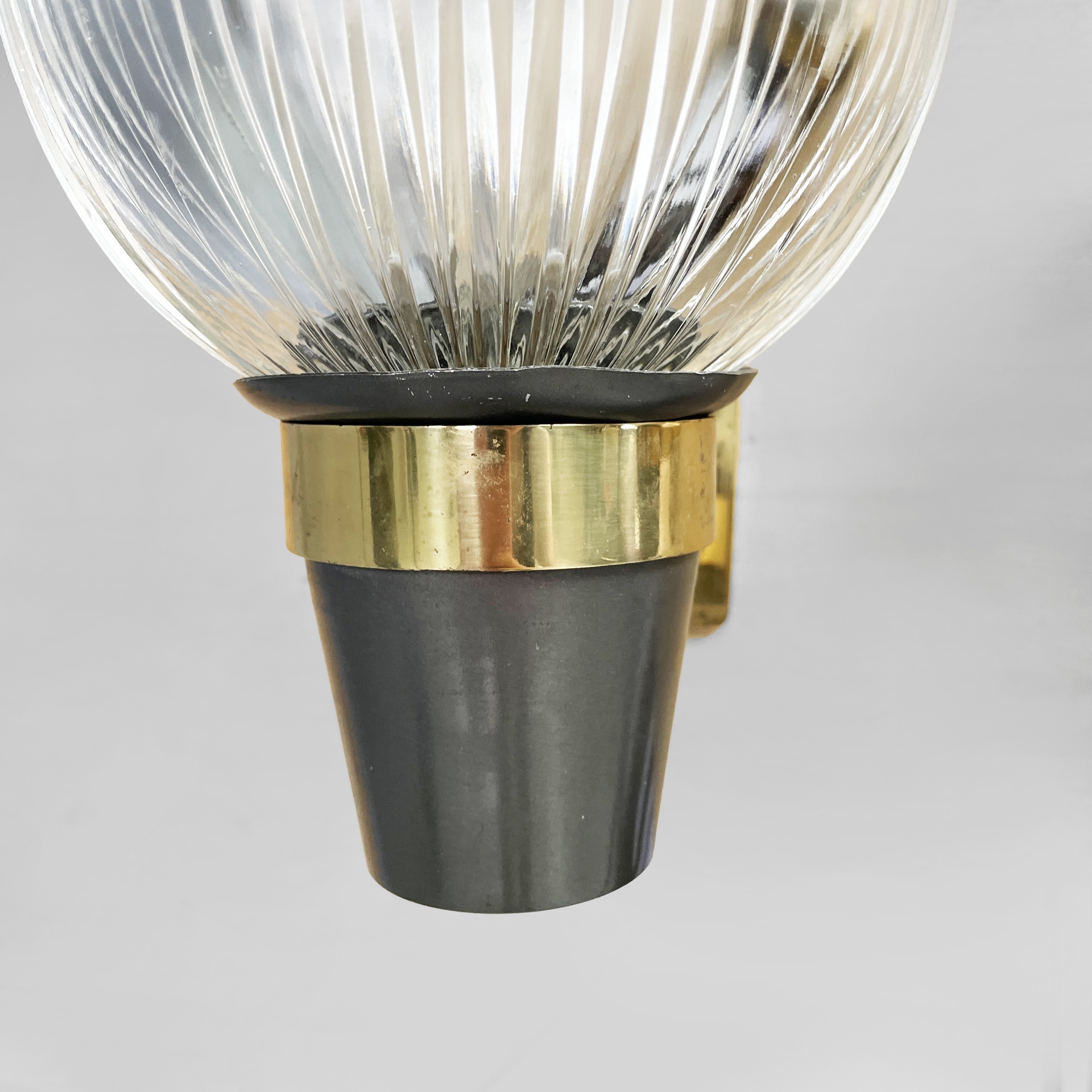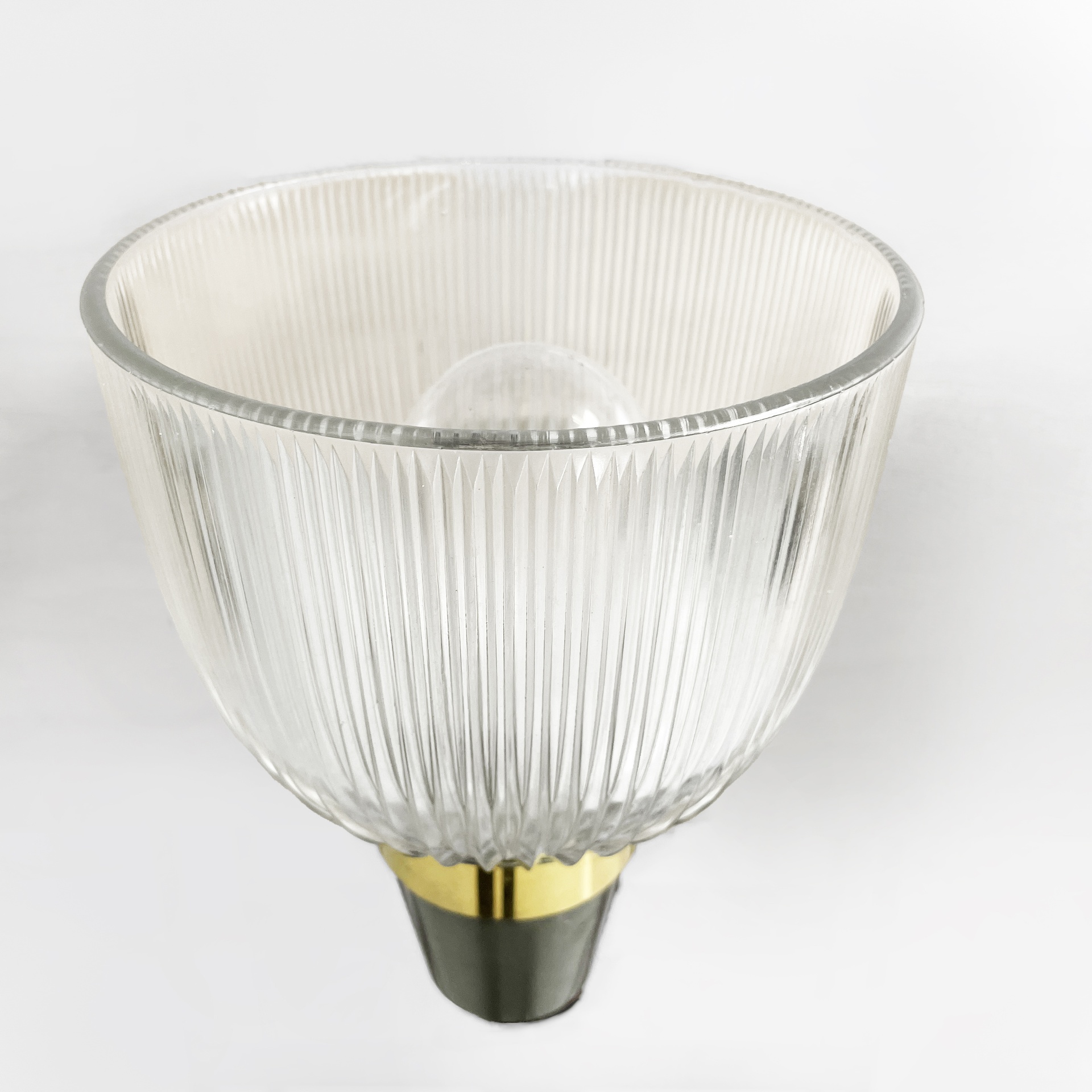 Set di tre applique o lampade da parete modello LP5 con diffusore a cupola in vetro stampato. La struttura conica in metallo verniciato nero presenta nella parte superiore una fascia in ottone. La struttura si collega all’attacco a parete rettangolare grazie ad una listello in ottone.