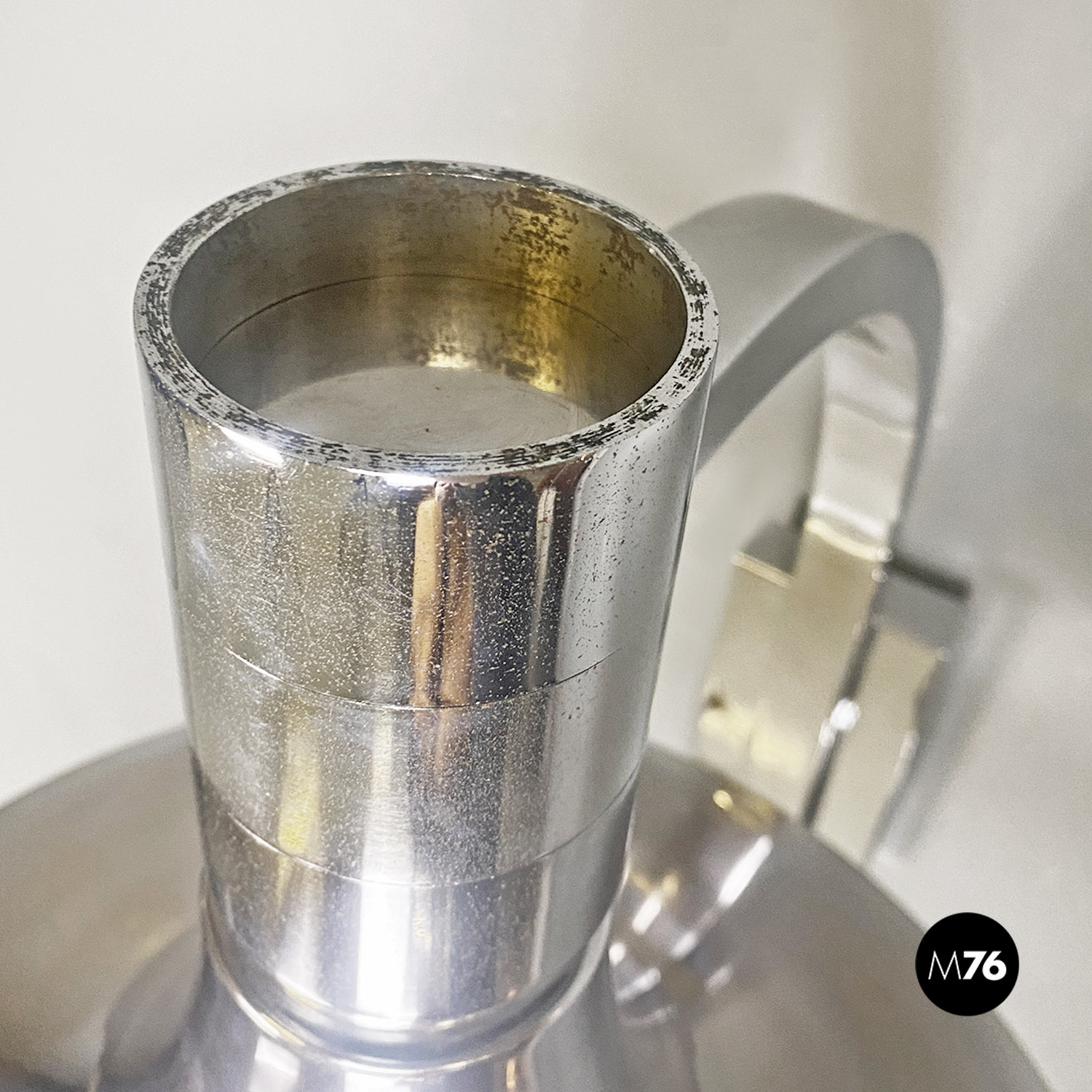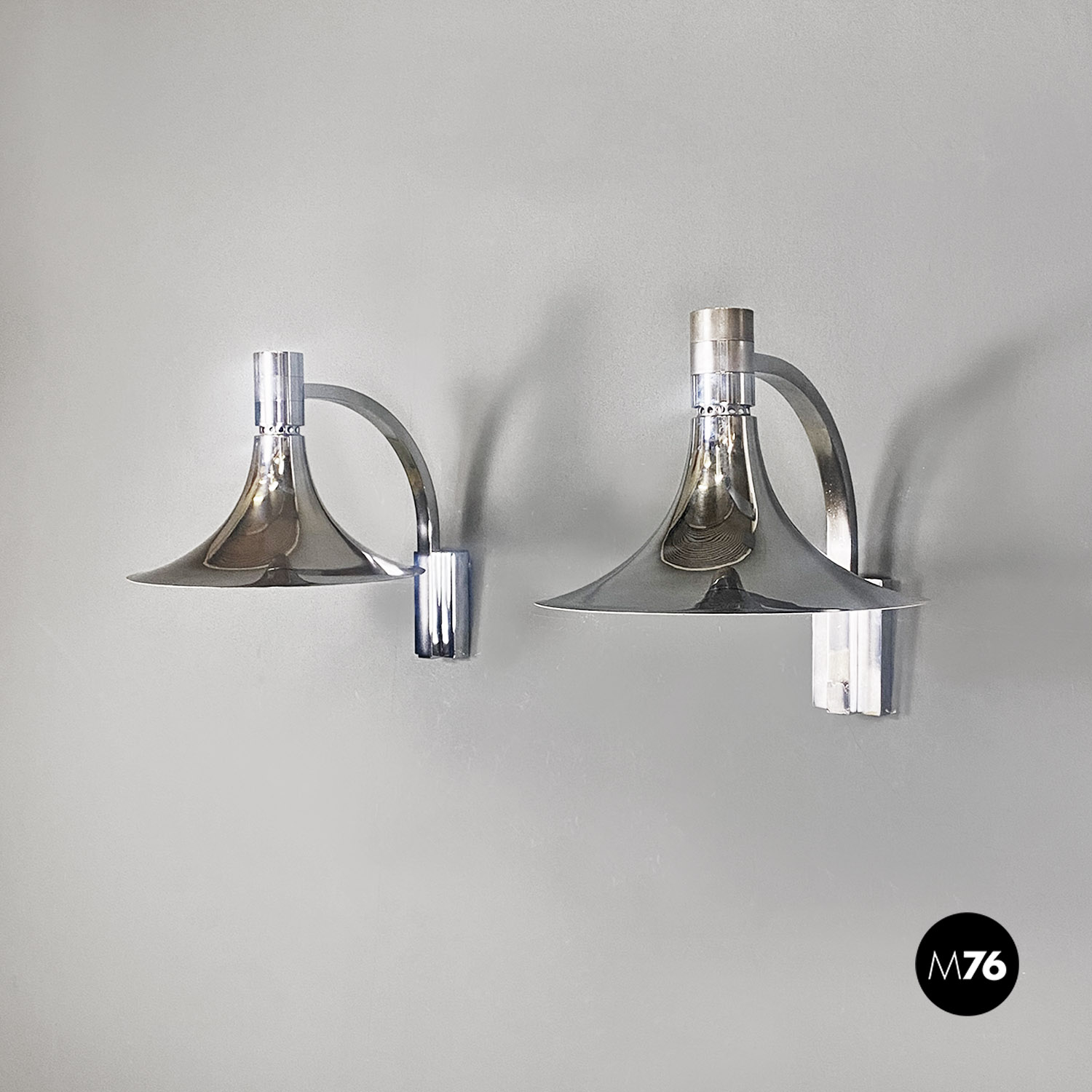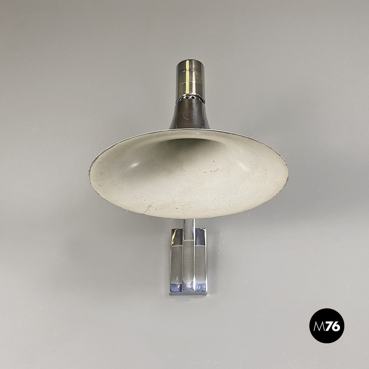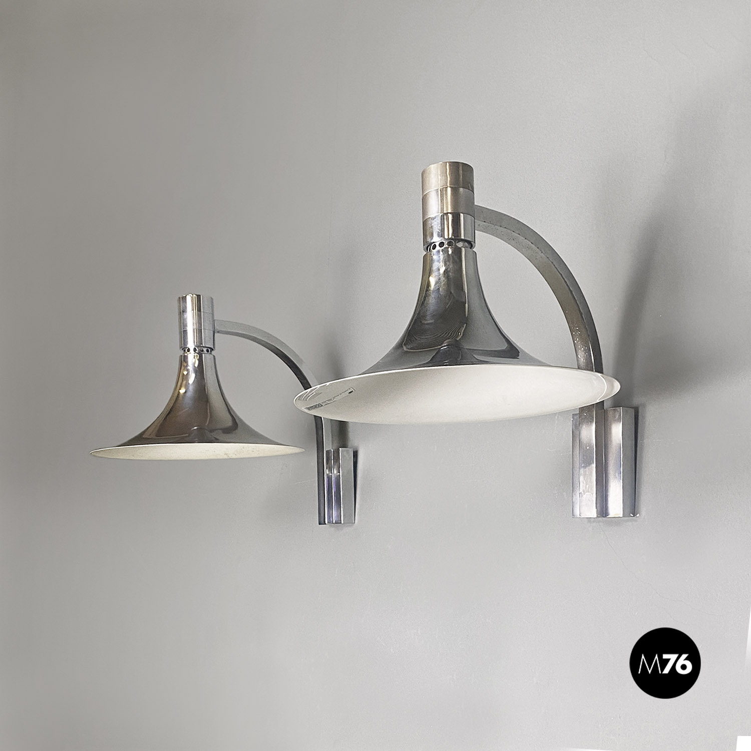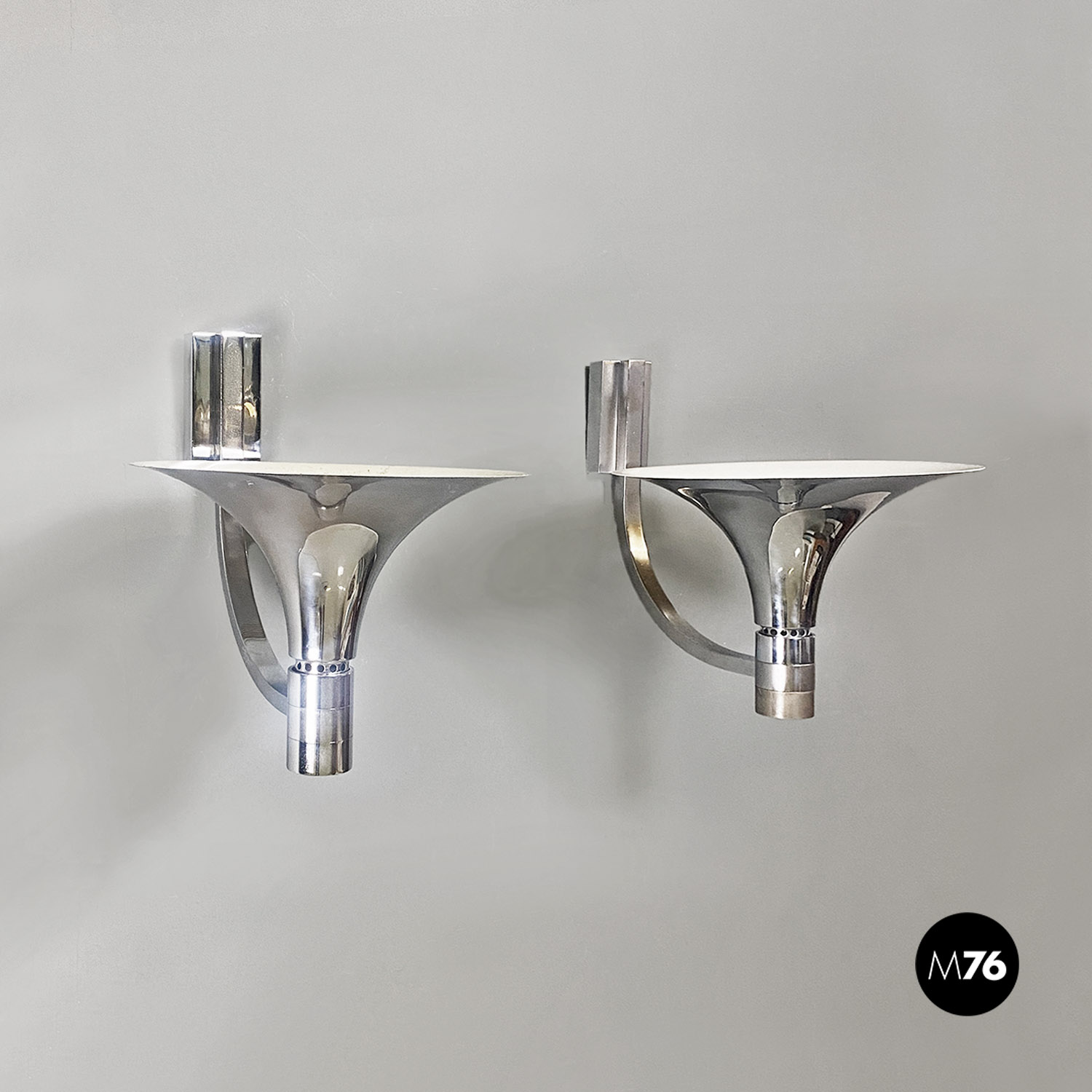 Coppia di appliques o lampade da parete appartenenti alla serie AM/AS con struttura in acciaio cromato composta da un braccio ricurvo a sezione quadrata e paralume anch’esso in acciaio cromato esternamente e smaltato bianco opaco all’interno con delle differenze sulla cromatura di una delle due lampade che risulta avere una superficie più satinata.