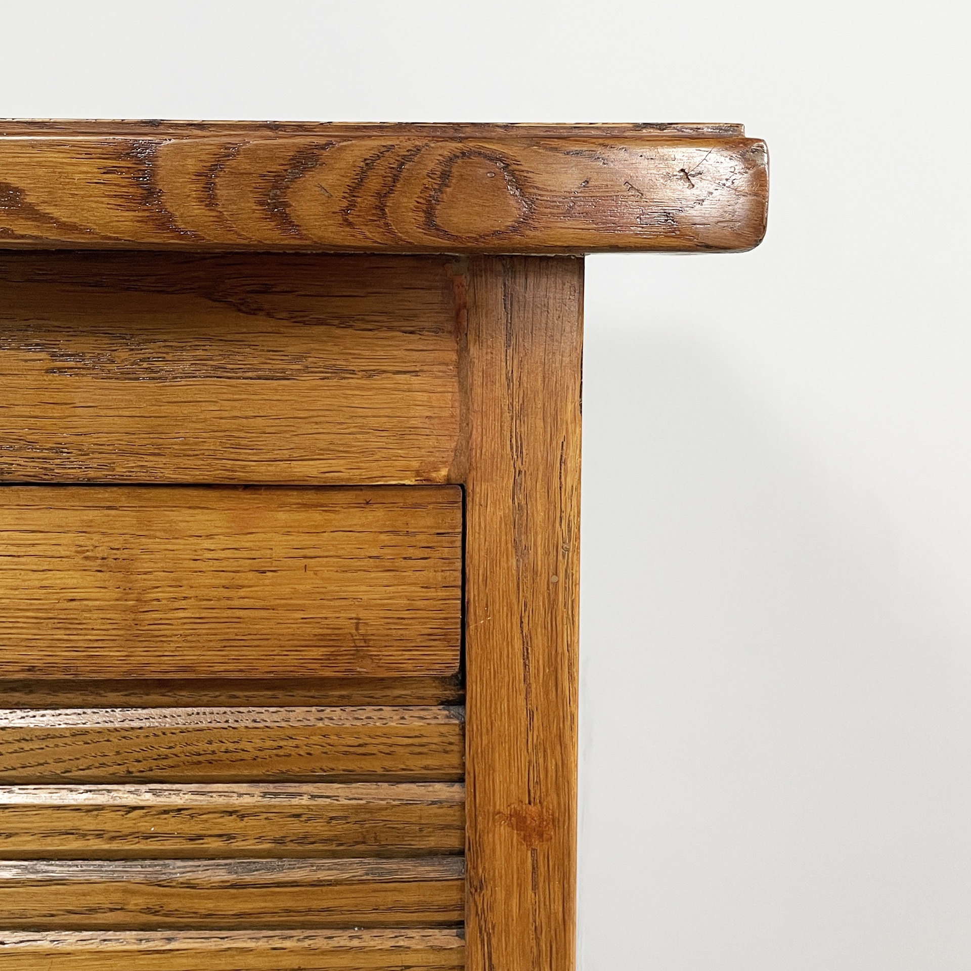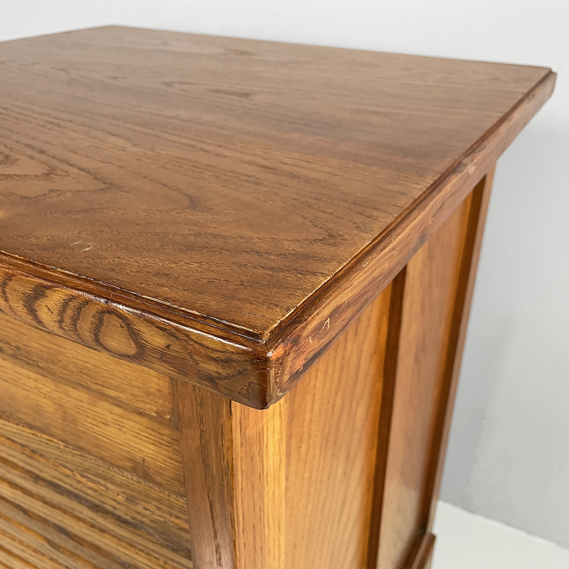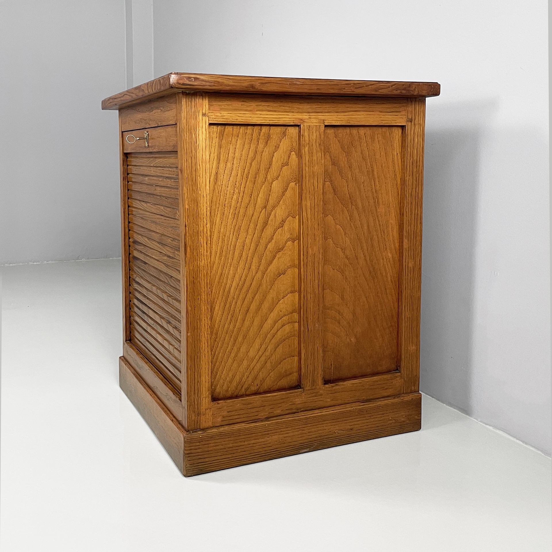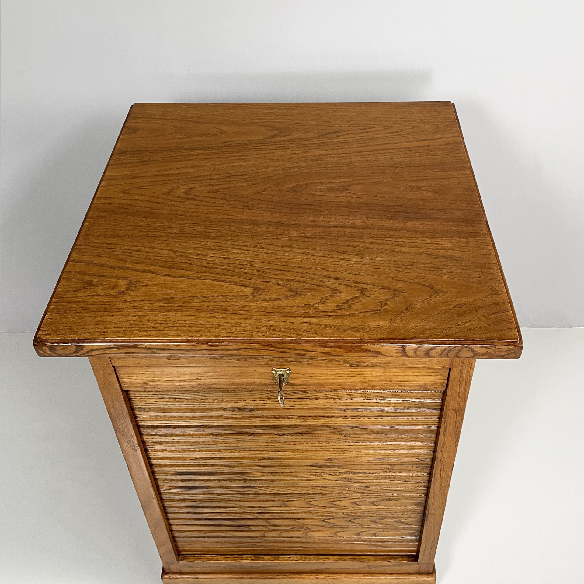 Mobile archivio da ufficio a base rettangolare in legno. Presenta un’apertura a serranda e nella parte interna ci sono due ripiani e un cassetto. Chiave presente. Listelli decorativi sui lati.