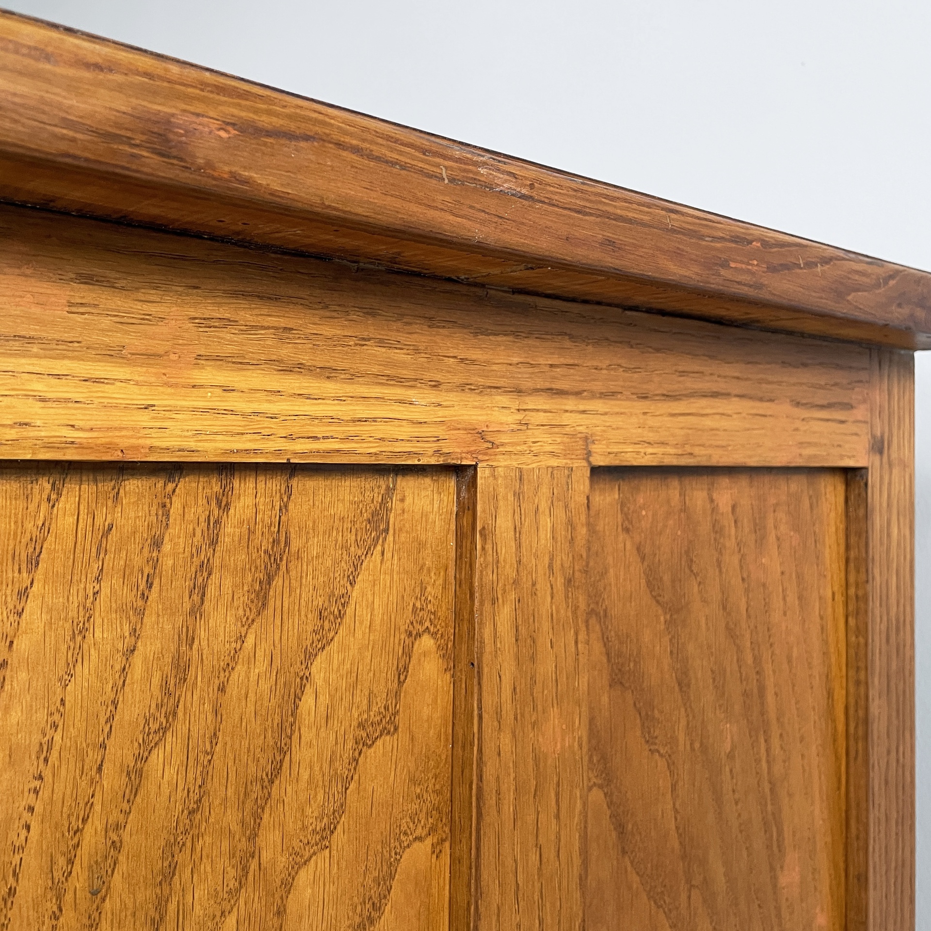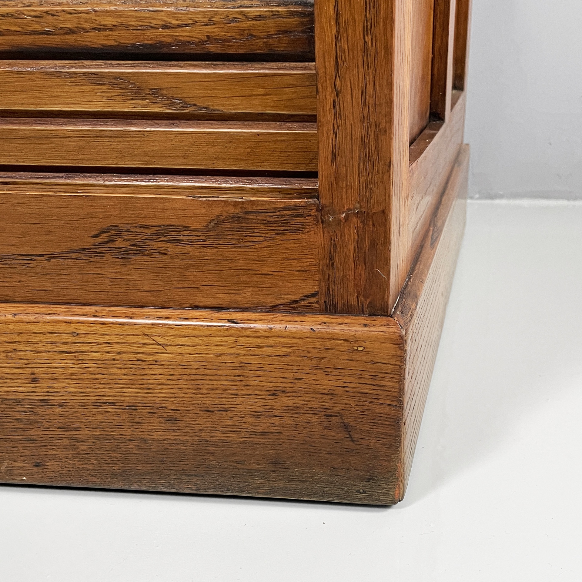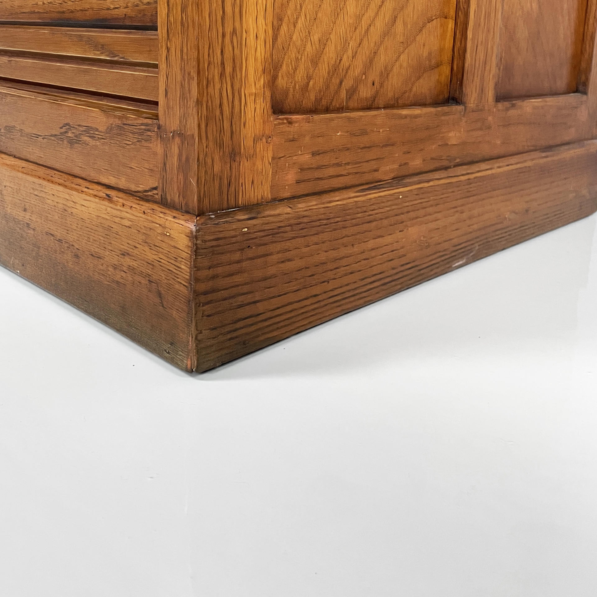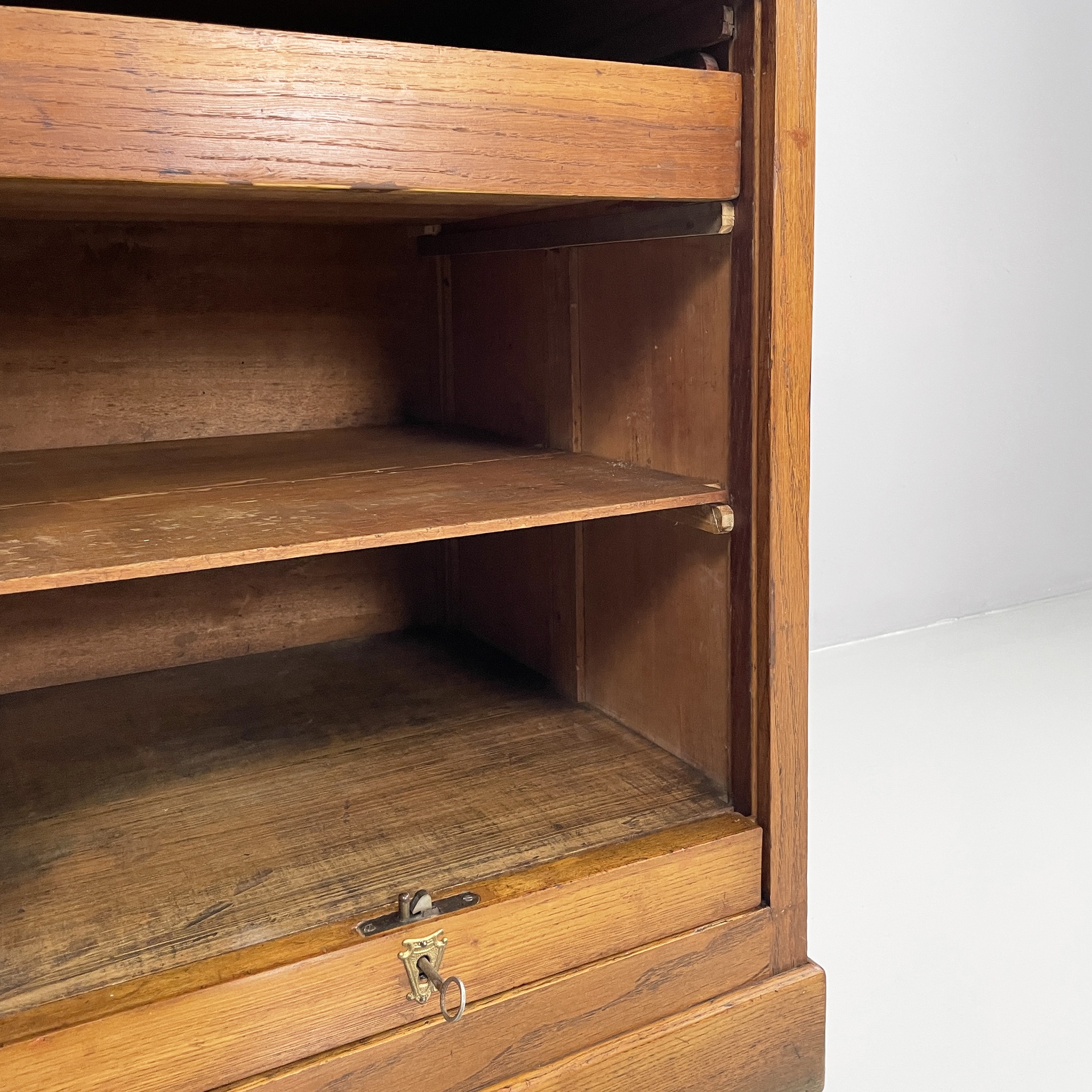 Mobile archivio da ufficio a base rettangolare in legno. Presenta un’apertura a serranda e nella parte interna ci sono due ripiani e un cassetto. Chiave presente. Listelli decorativi sui lati.
