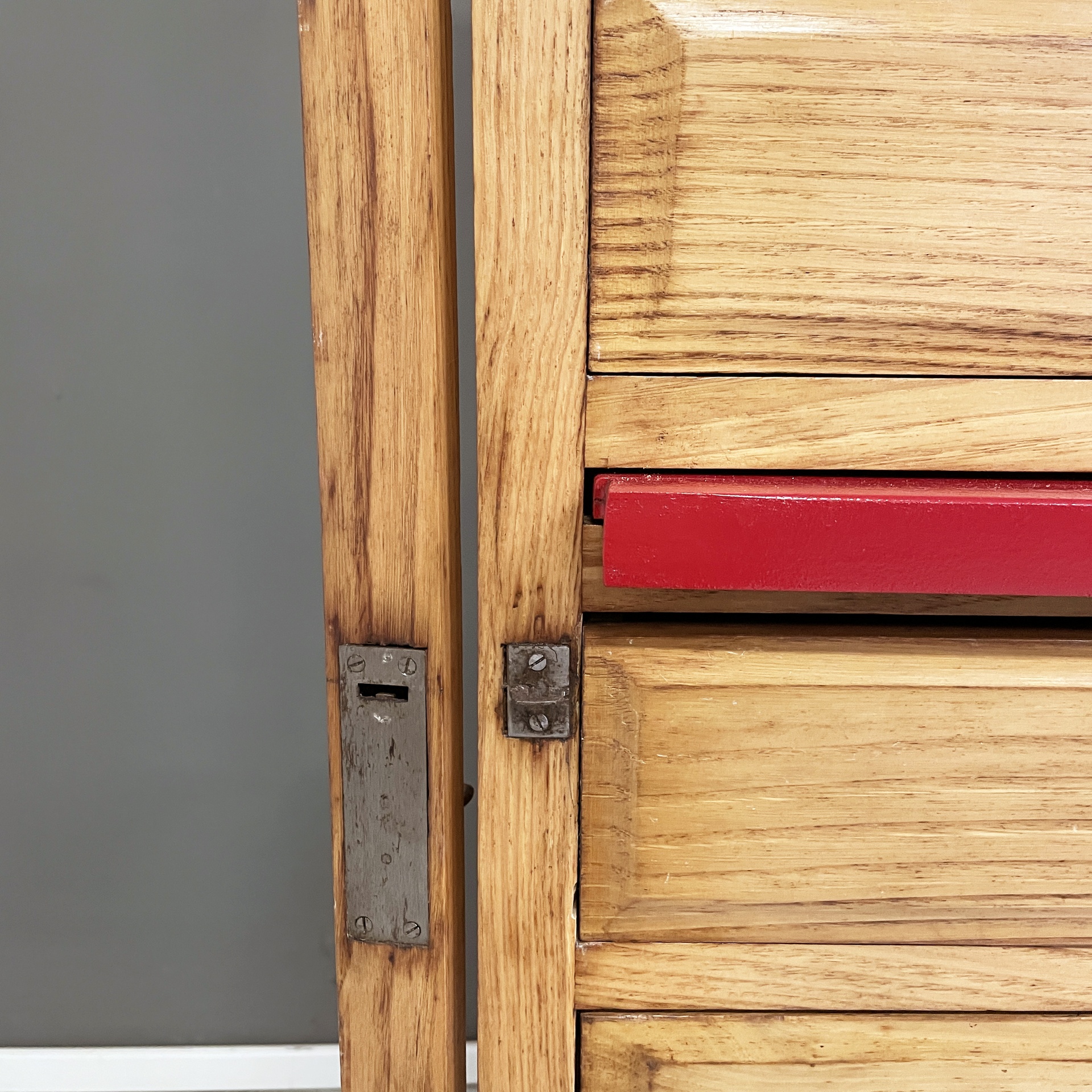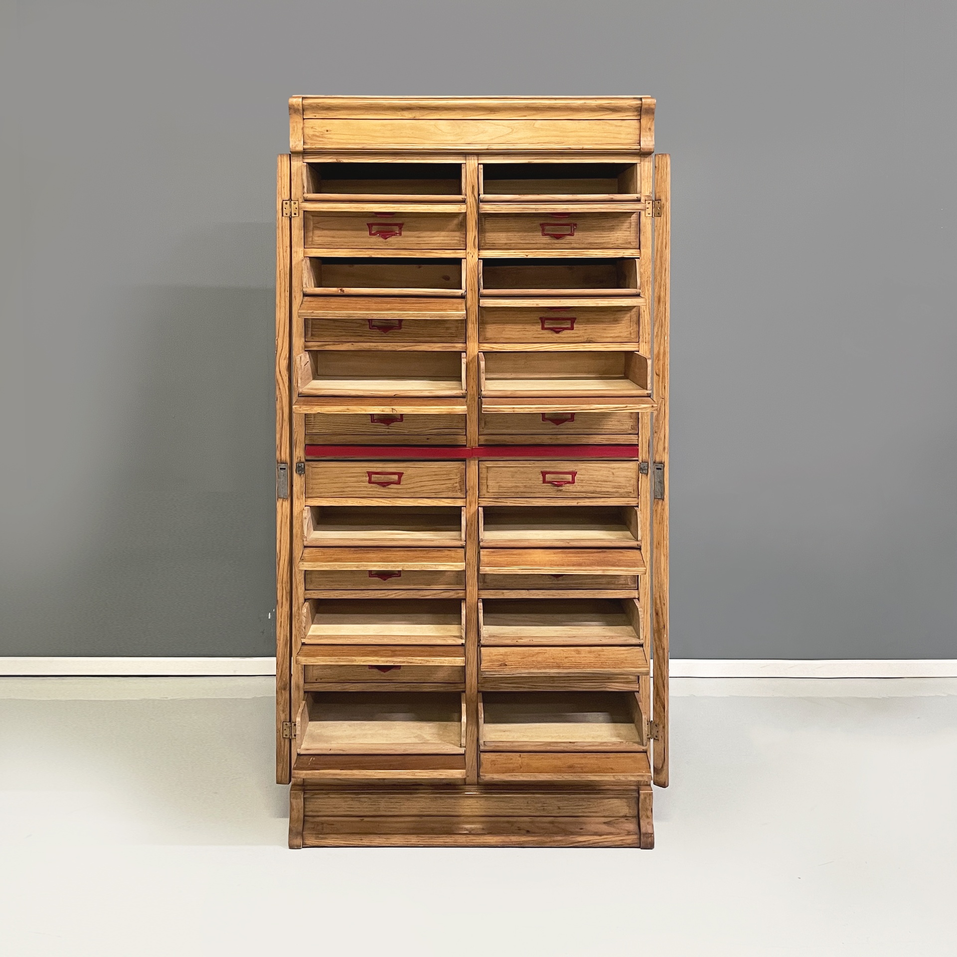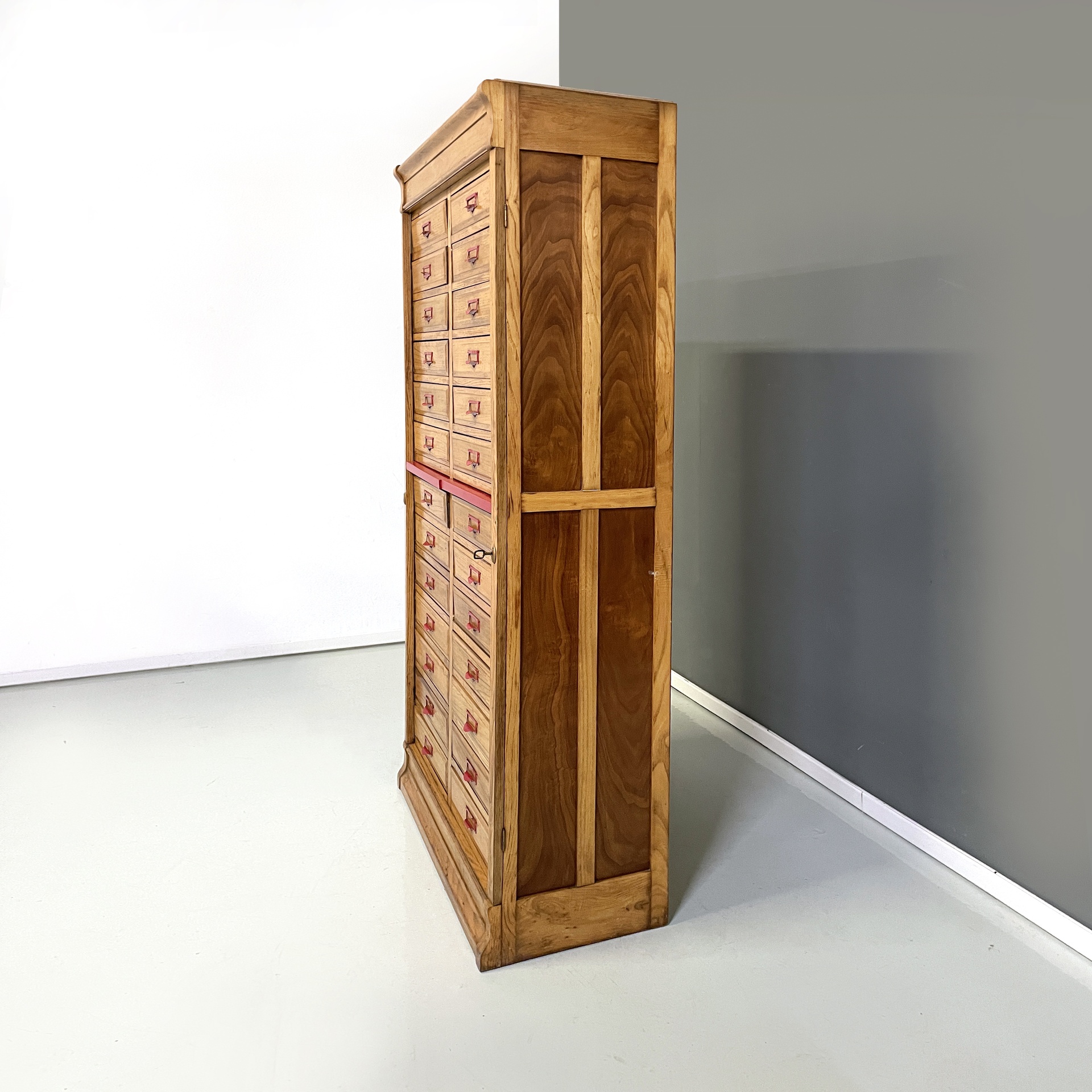 Office filing cabinet in solid wood with red painted metal strip in the middle. On the front it has 26 rectangular drawers divided on two columns. Each drawer features a red painted metal handle. On the sides there are two strips that allow you to lock the drawers thanks to a lock. Key present.