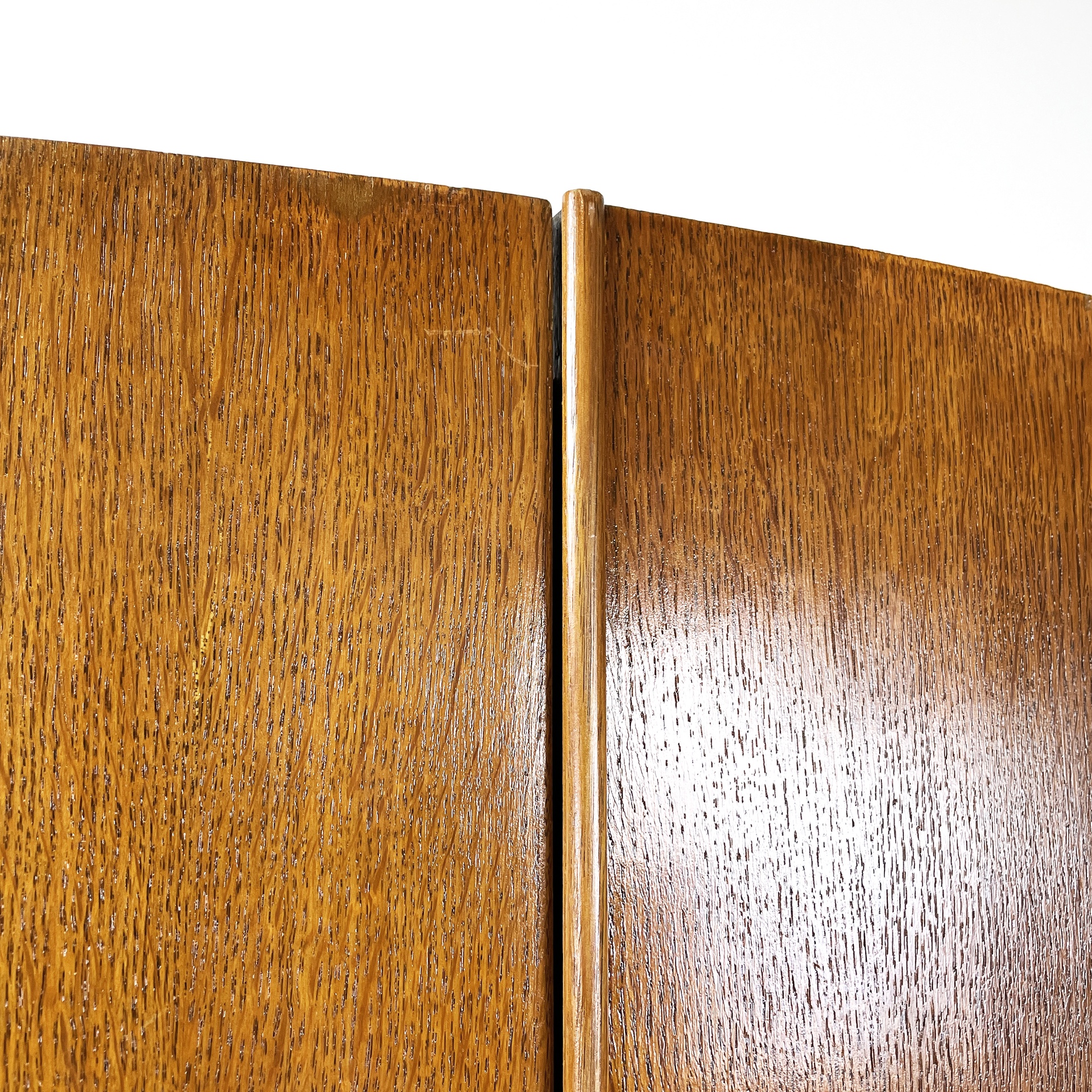 Wardrobe entirely in solid wood with double hinged door. Inside there are two spaces. On the left there is an extractable metal coat hanger with a wooden rod for ties. On the right there are shelves a drawer a small object holder for buttons and a compartment with a door with mirror. Each element has a label that specifies the use of the shelf. From Art Deco period.