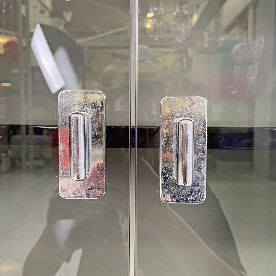 Armadio interamente in legno laccato nero con doppia anta a battente in vetro fumè.