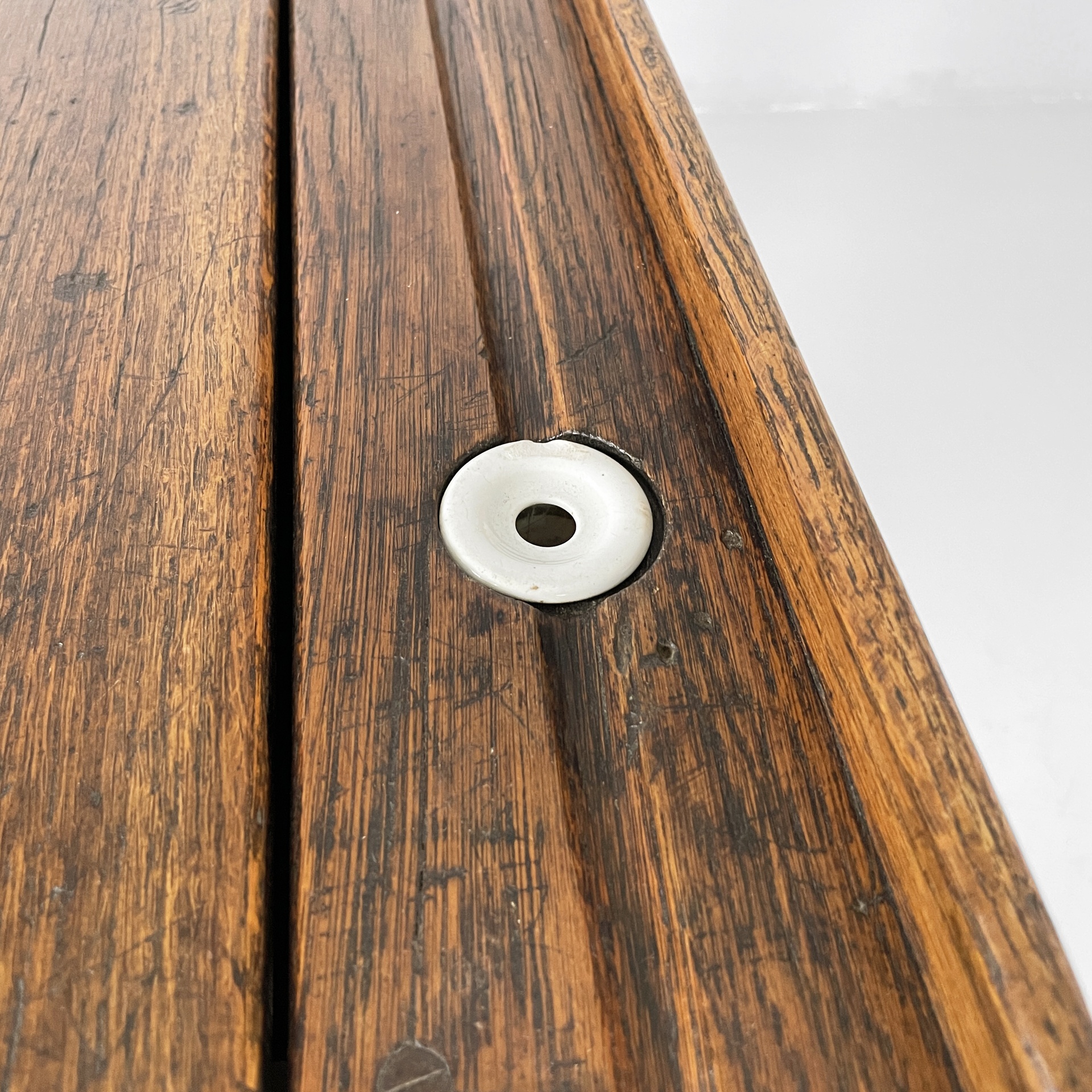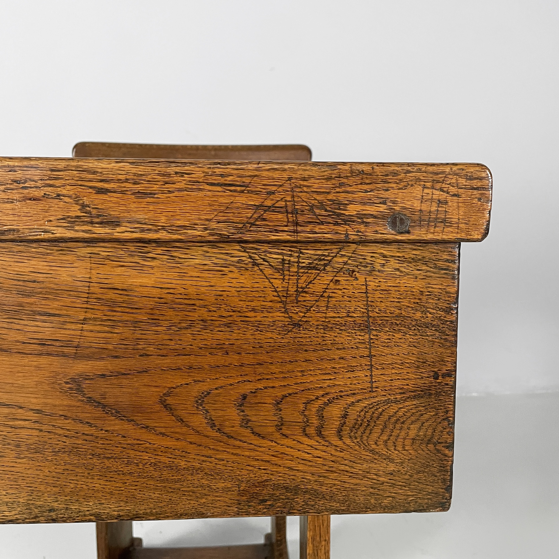 Banco di scuola composto da un tavolo e una sedia, interamente in legno. Il banco presenta un piccolo calamaio estraibile in ceramica bianca, un piano inclinato per poter appoggiare il quaderno e un vano interno. Il tavolo presenta un sistema a scorrimento per poter permettere di sedersi. La sedia presenta uno schienale a listelli e una seduta sagomata. Sedia e banco sono collegati alla base.