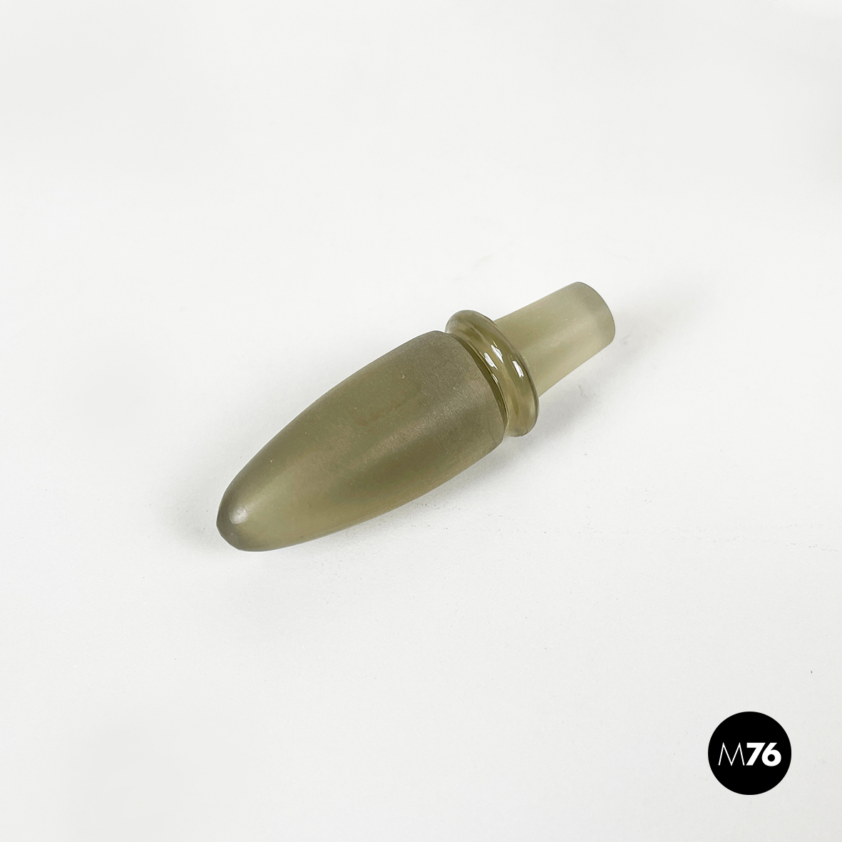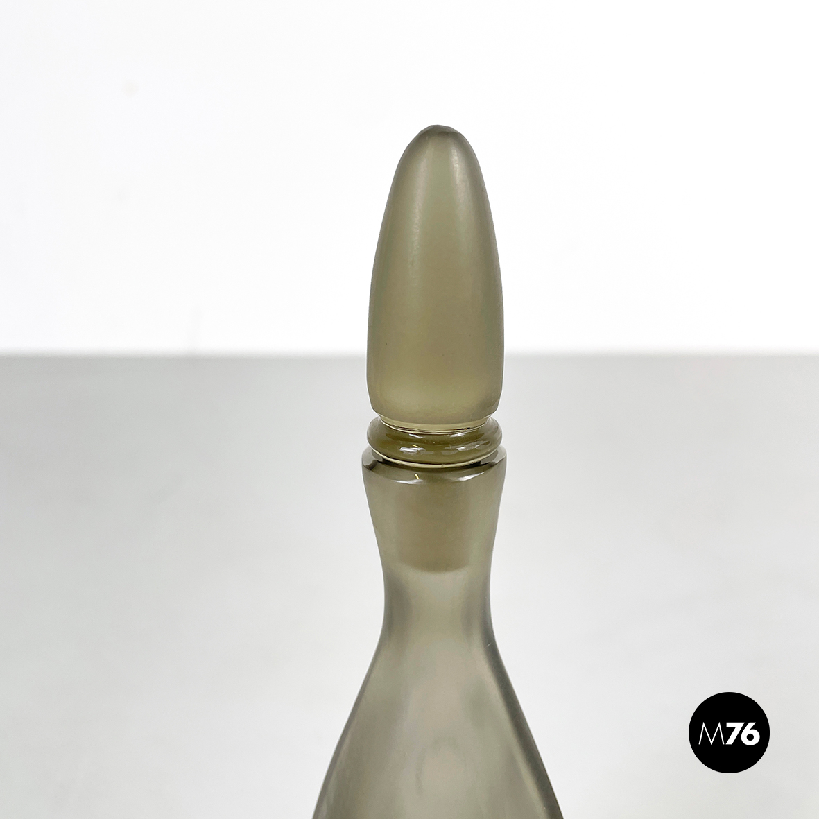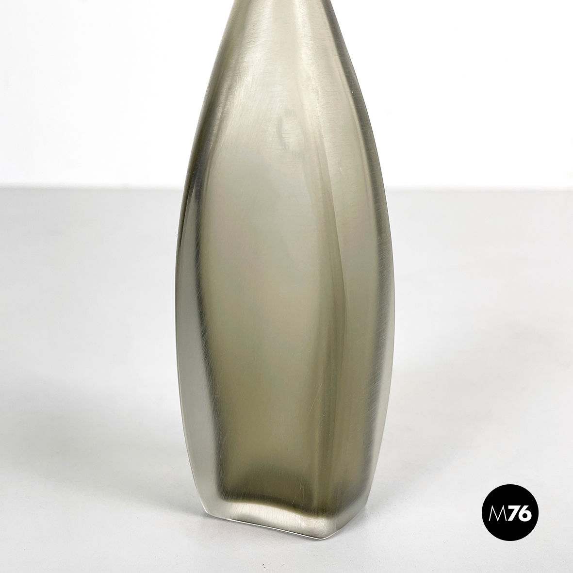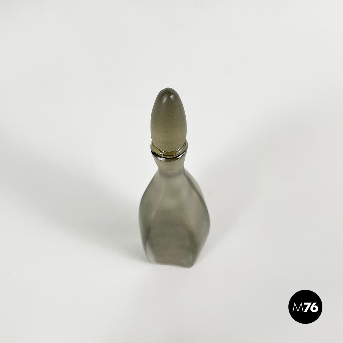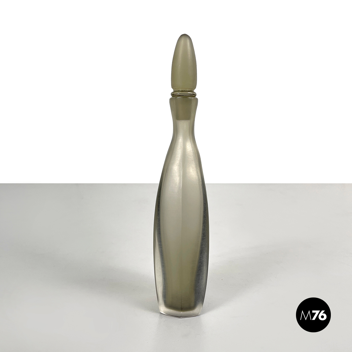 Bottiglietta decorativa a base squadrata in vetro di Murano grigio e trasparente opaco. Il tappo a base tonda presenta una forma affusolata e allungata. La bottiglia si tende ad allargare al centro e stringere alla base.