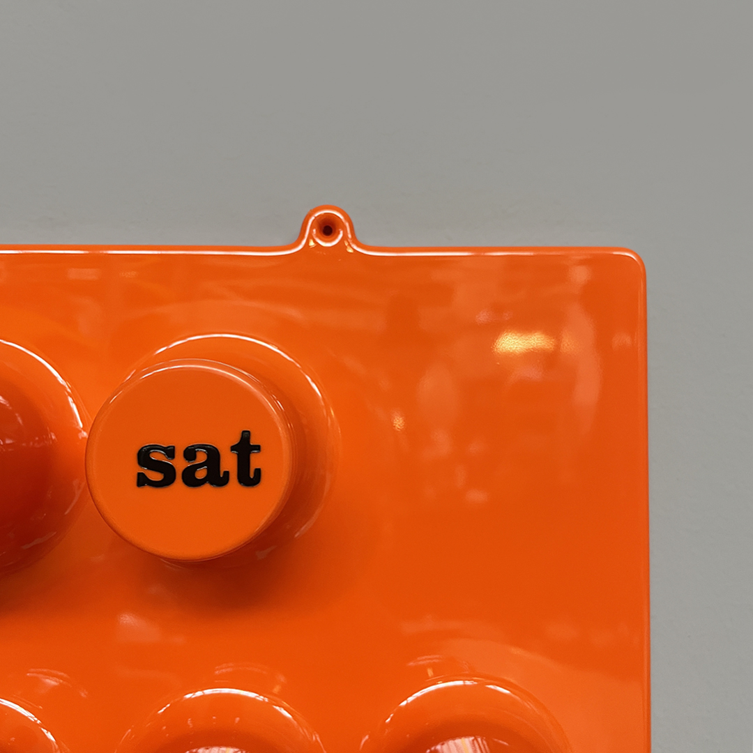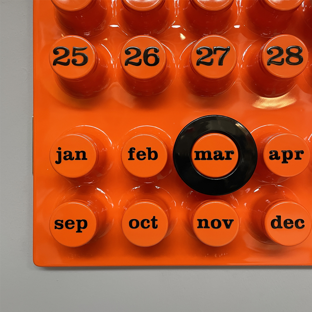 Calendario infinito da parete in plastica arancione. Il calendario presenta diversi cilindri sporgenti: questi corrispondono nella parte alta ai giorni dalla settimana, nella parte centrale ai numeri e nella parte inferiore ai mesi. Per segnare i giorni e i mesi è possibile grazie ad un anello in plastica bianco e nero. L’anello può essere richiesto in altri colori.