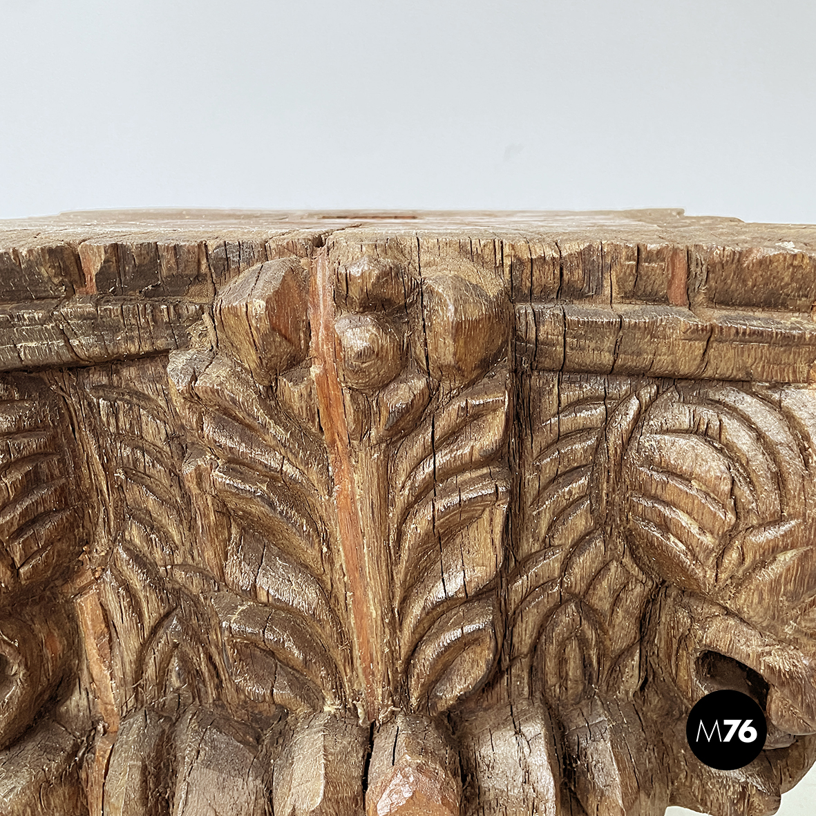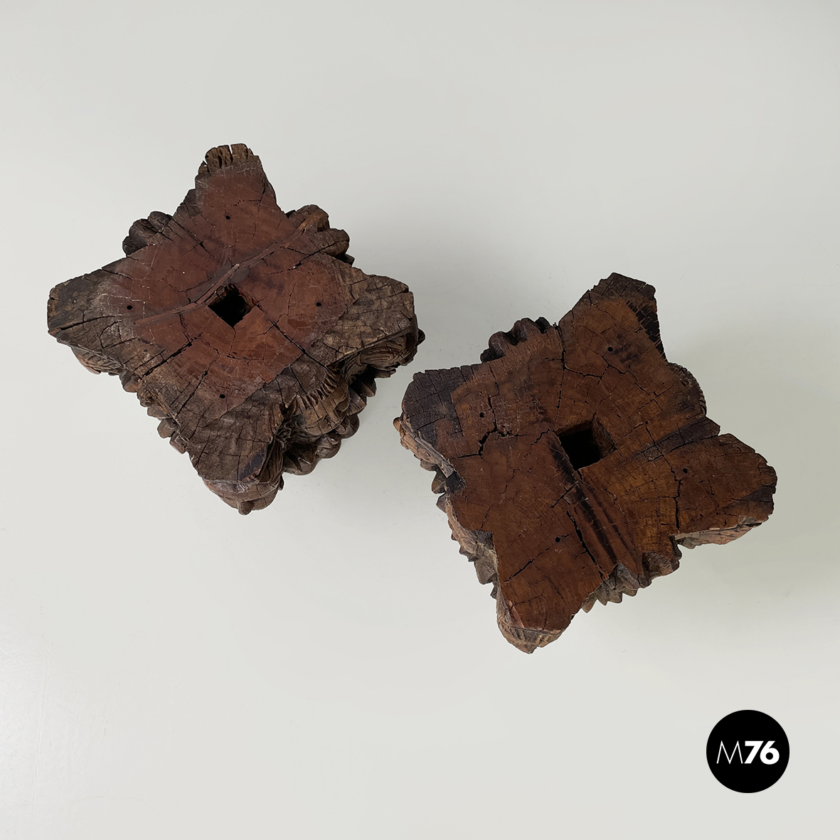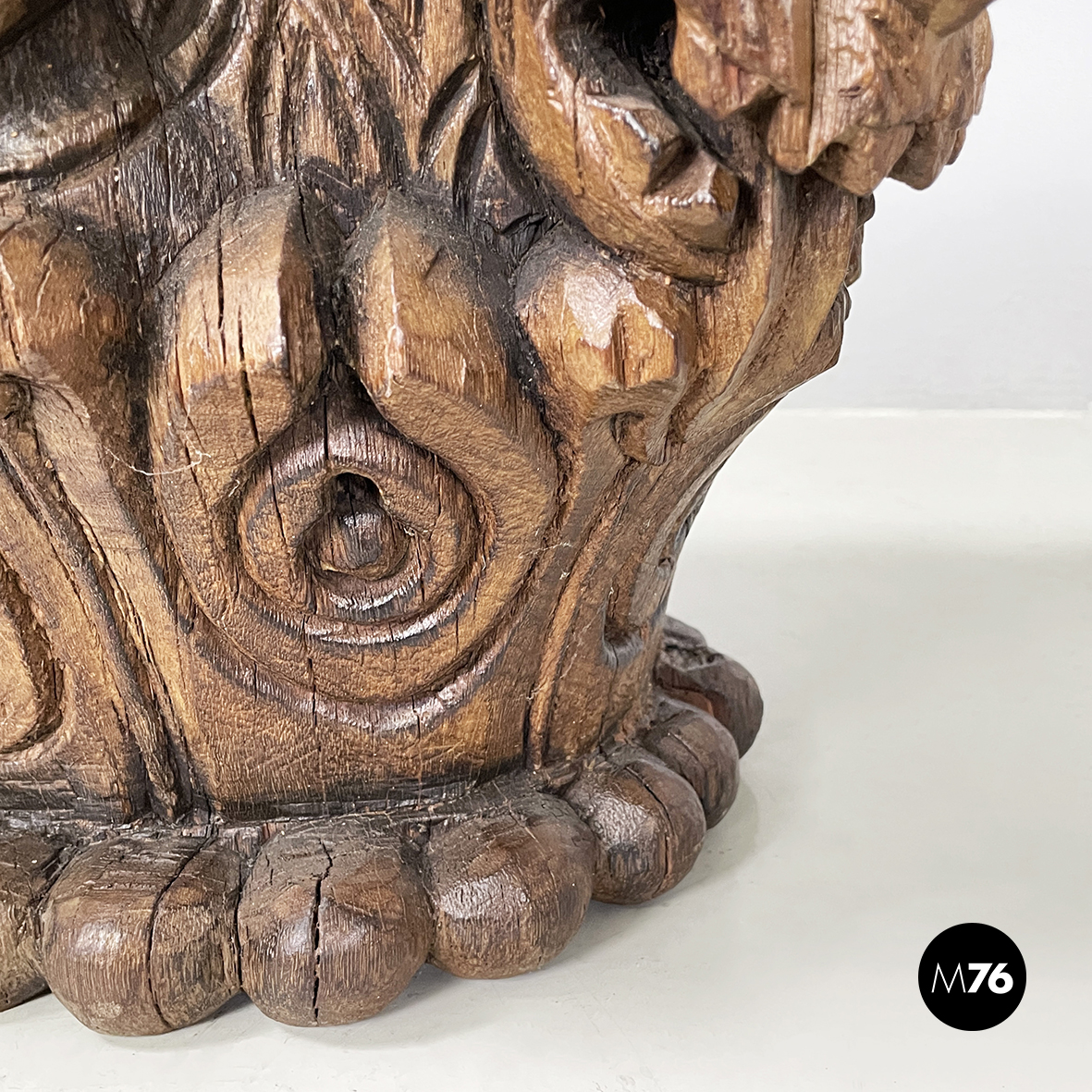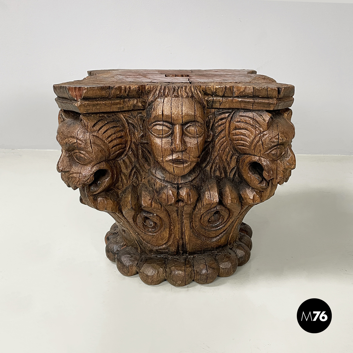 Coppia di capitelli interamente in legno finemente intagliato. Sugli angoli sono presenti delle teste di gargoyle. Sui lati sono presenti decori a forma di foglie e volti umani. Al centro del piano è presente un foro squadrato. Alla base sono presenti decori sferici. Utilizzabili come elementi decorativi o tavoli da caffè piedistalli o espositori.