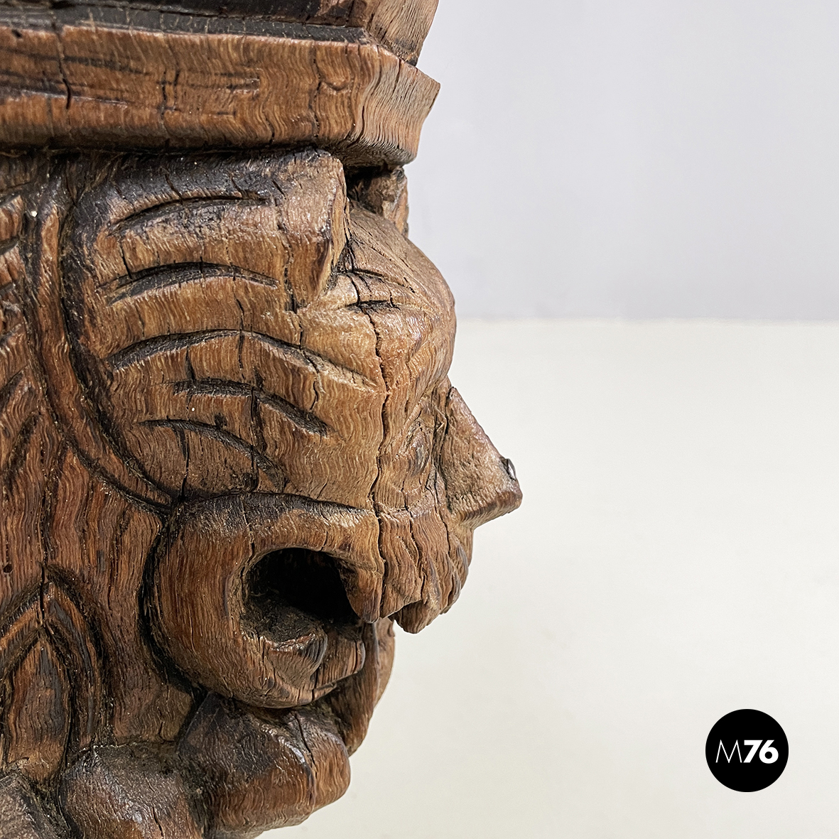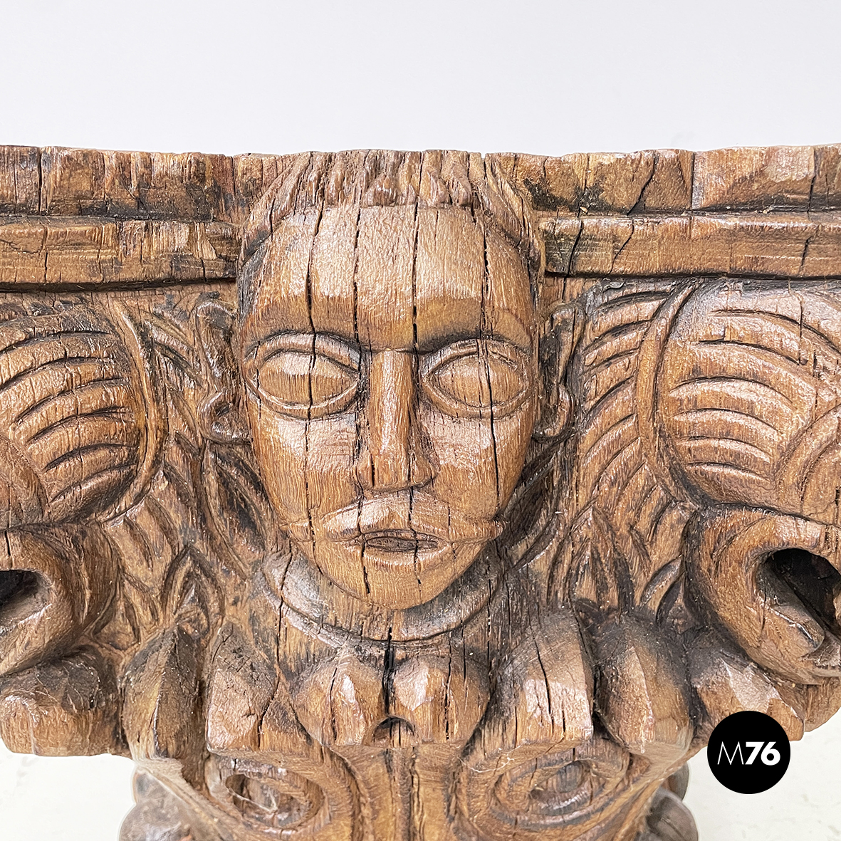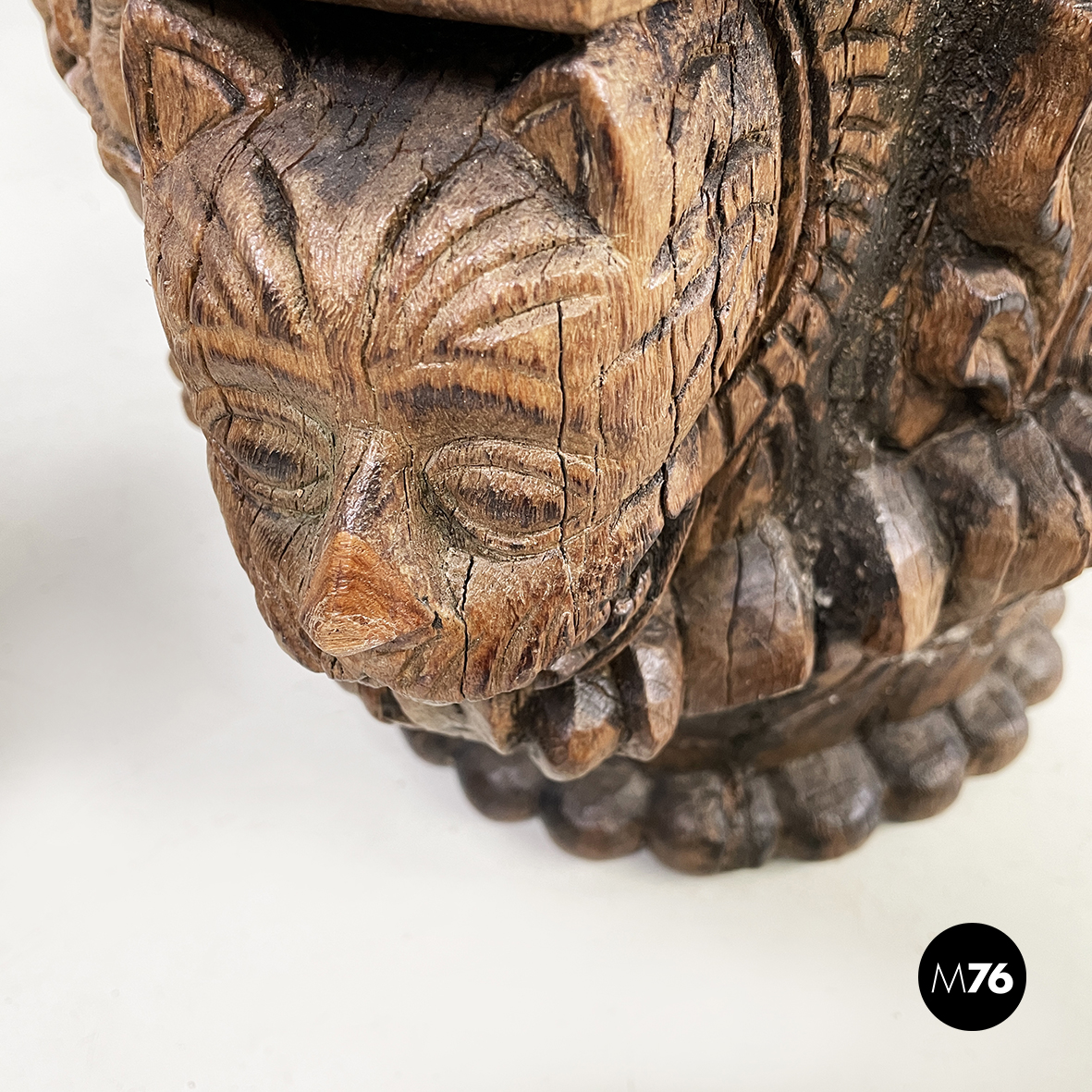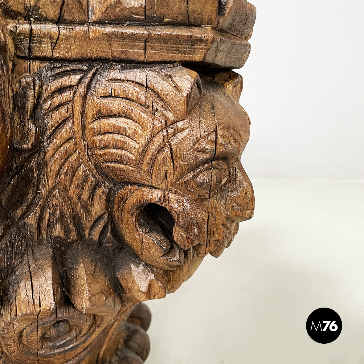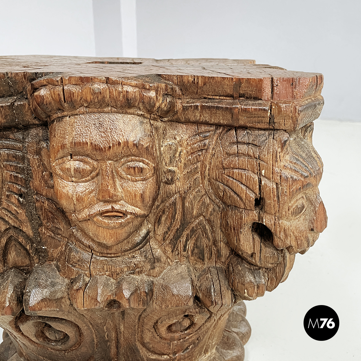 Capitelli in legno lavorato con volti di gargoyle e uomini, 1600 ca.
