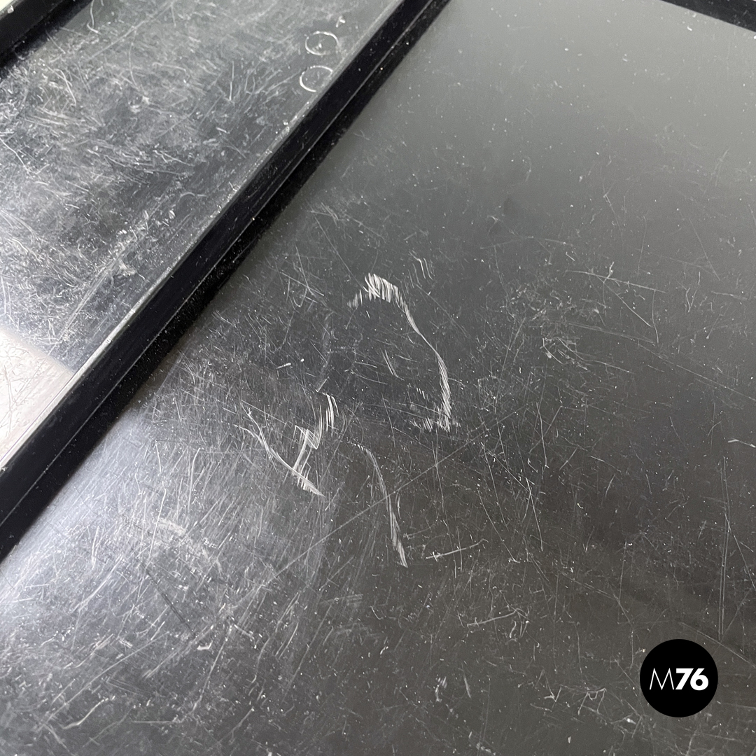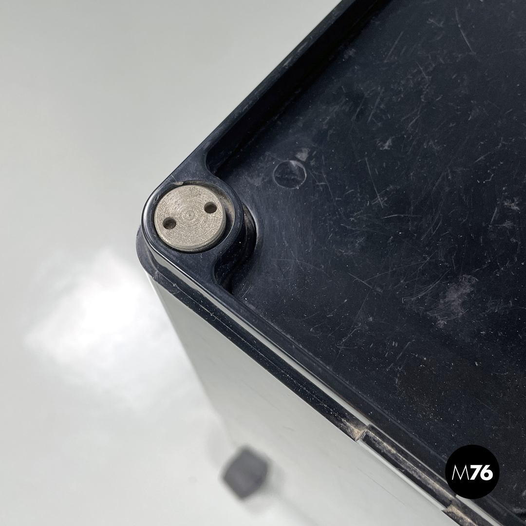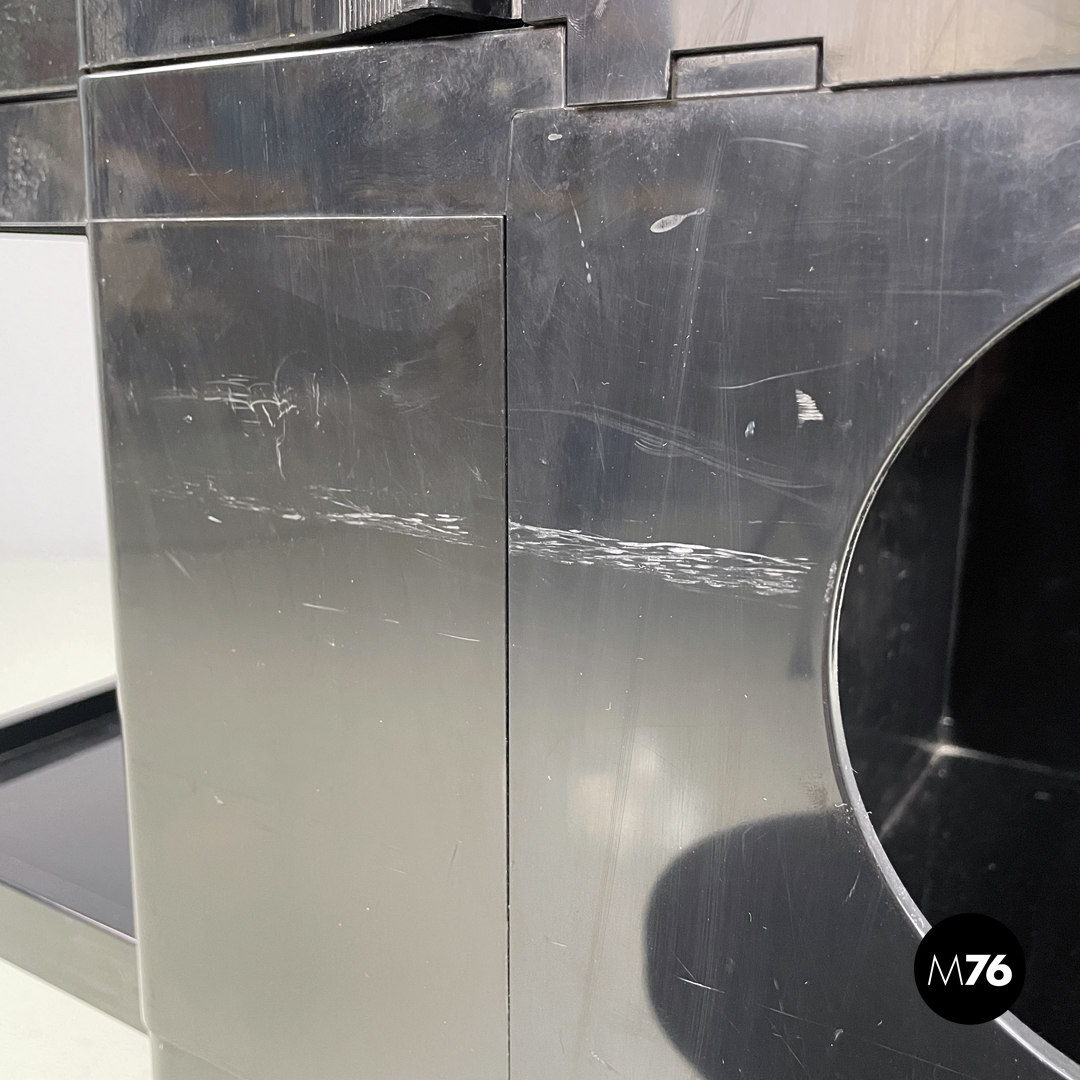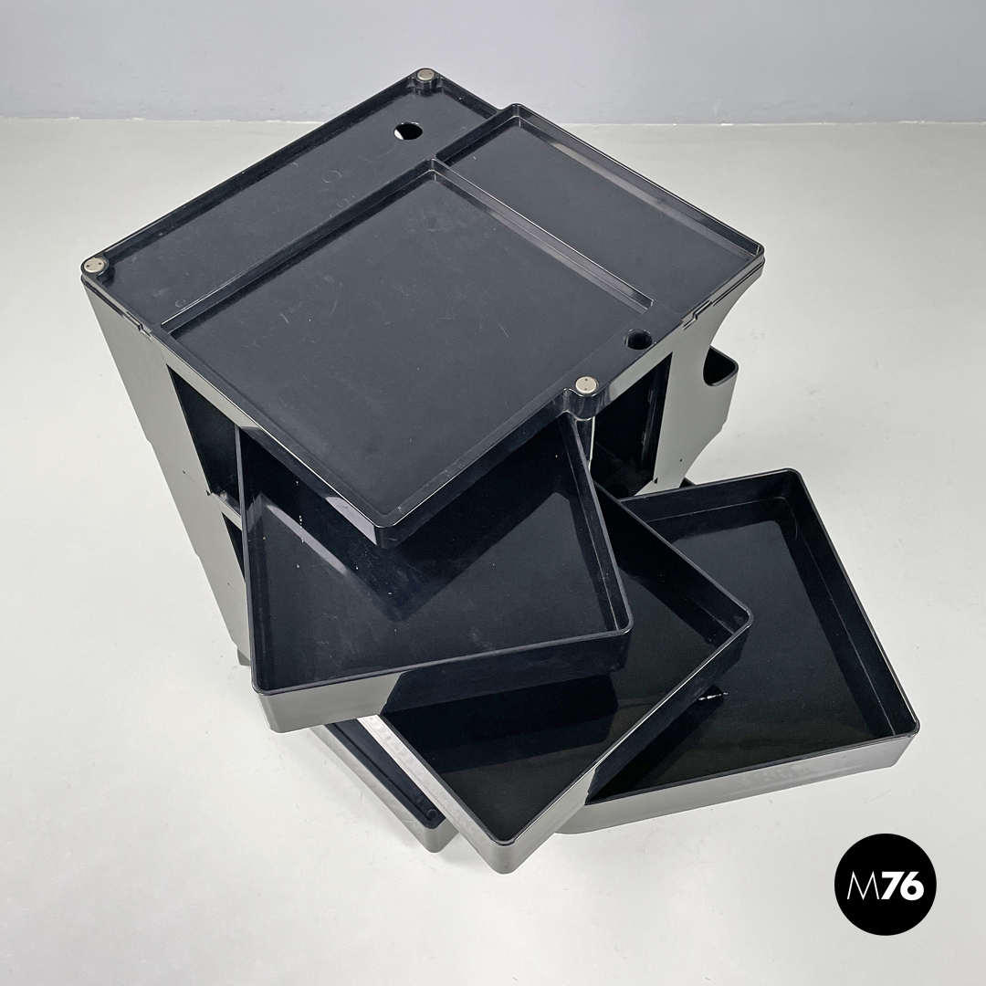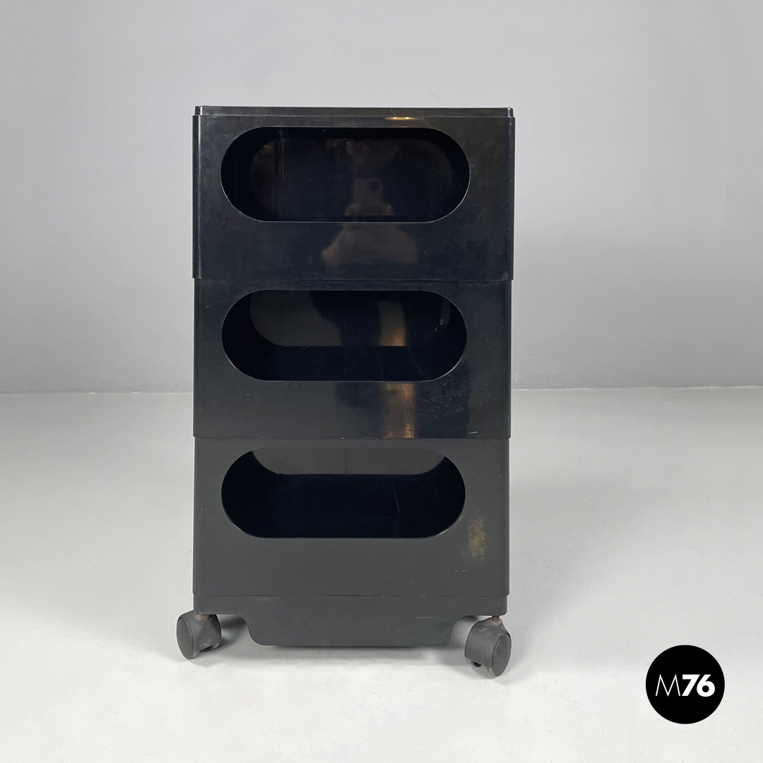 Carrello portaoggetti modello Boby in plastica nera. Il carrello è a base rettangolare presenta molti scompartimenti con tre cassetti che si aprono verso l’esterno ruotando su un angolo. Una sezione del piano è estraibile così da poter accedere a un’apertura alta quanto la struttura. Con tre ruote in plastica nera.