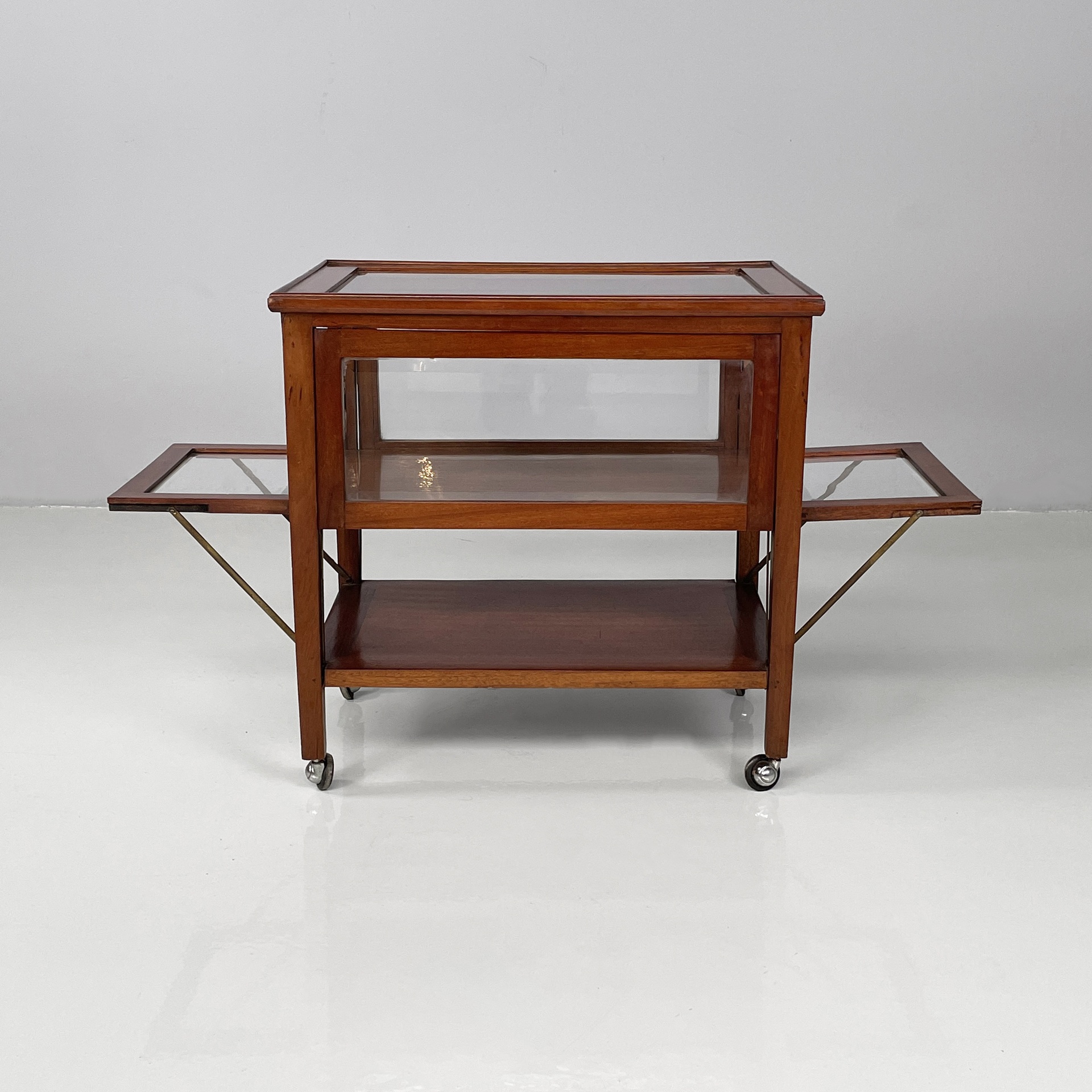 Carrello con vano bar in legno e vetro. Nella parte superiore è presente un vano con profili in legno ed interni in vetro, di cui ogni lato presenta l’apertura a ribalta. Presenta un piano inferiore rettangolare in legno. Zampe a sezione squadrata in legno. Ruote alla base.
