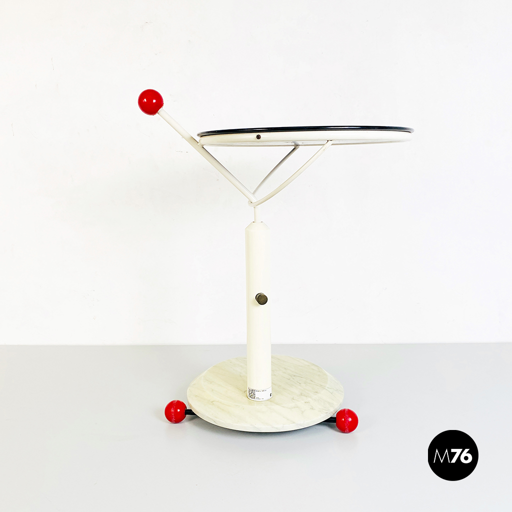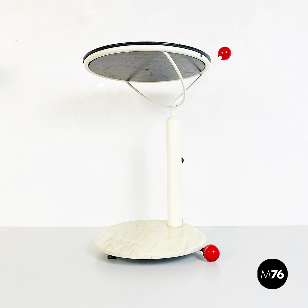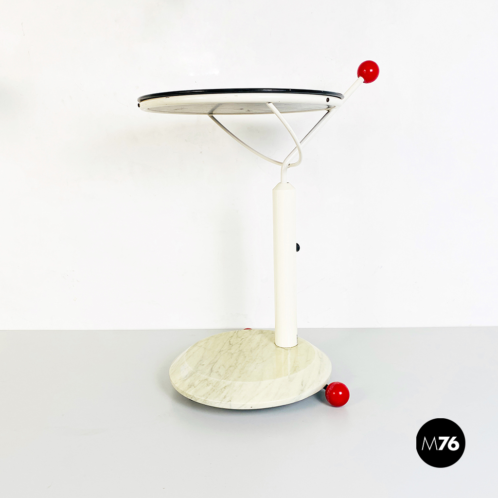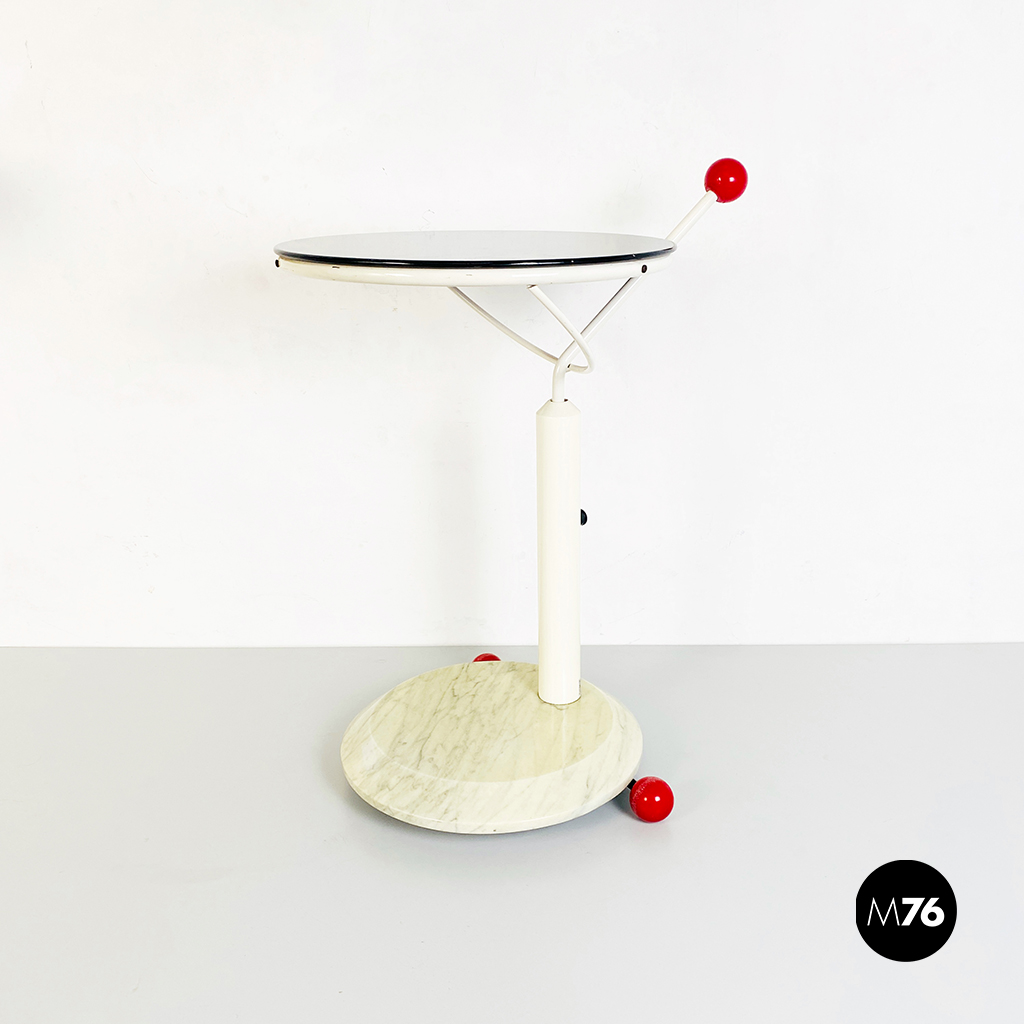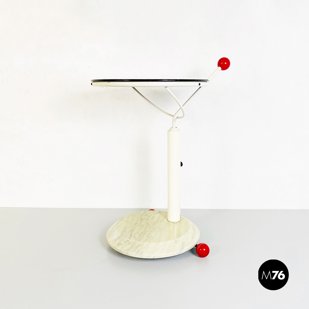 Tavolo con ruote composto da una base in marmo bianco ruote in plastica rossa struttura in metallo bianco e piano girevole in legno verniciato in nero. È presente una maniglia con pomello in plastica per spostarlo facilmente che riporta il marchio di origini giapponesi.