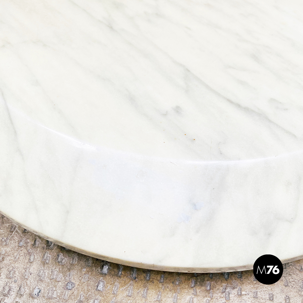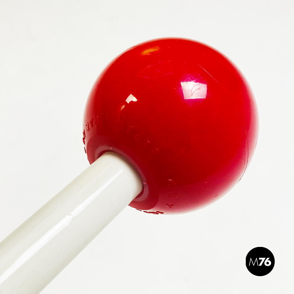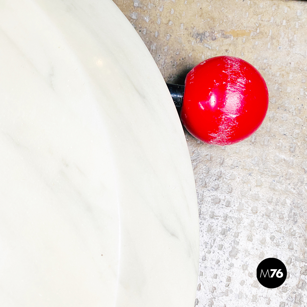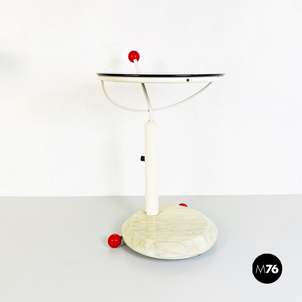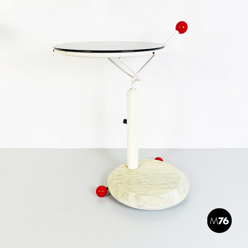 Tavolo con ruote composto da una base in marmo bianco ruote in plastica rossa struttura in metallo bianco e piano girevole in legno verniciato in nero. È presente una maniglia con pomello in plastica per spostarlo facilmente che riporta il marchio di origini giapponesi.