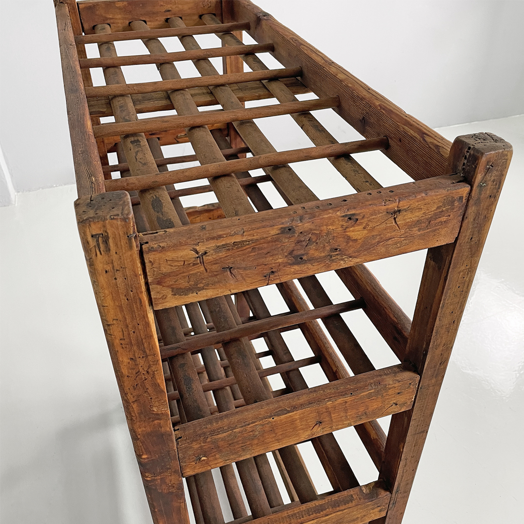 Ogni ripiano presenta diversi listelli piatti e a sezione tonda. Le zampe, unite al centro da listelli, presentano rotelle come piedini.