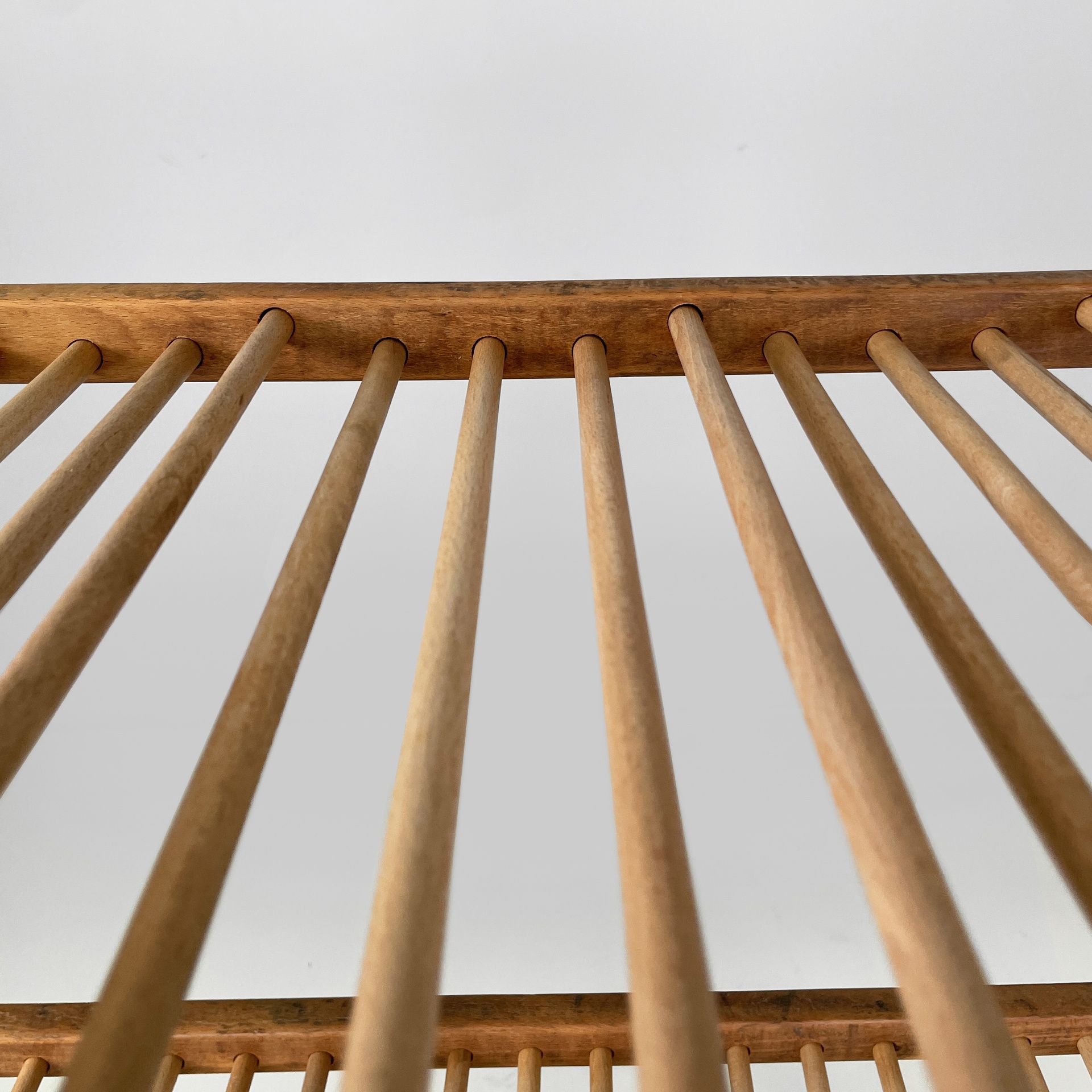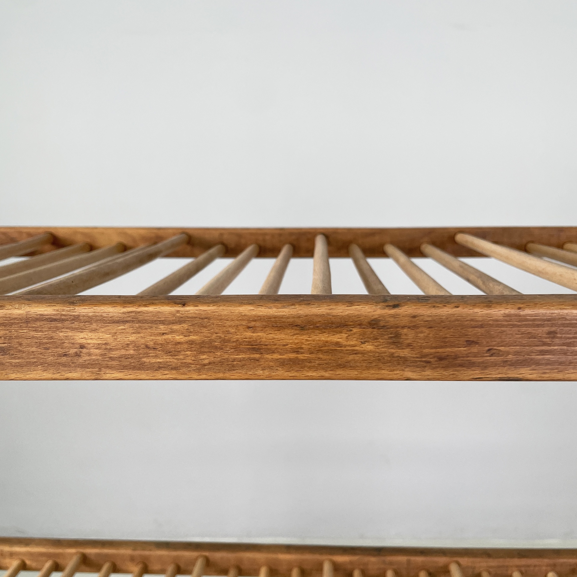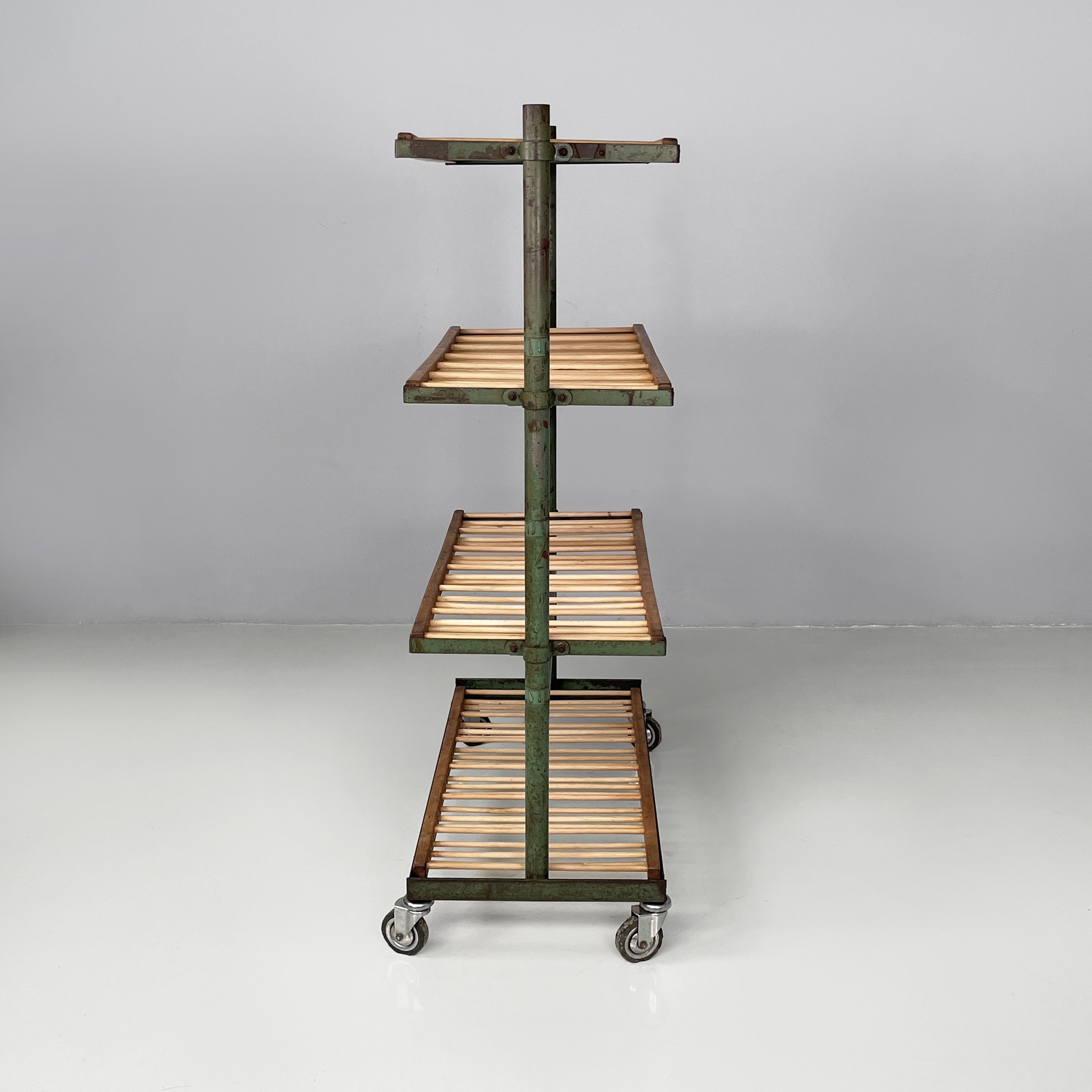Carrello con quattro ripiani in legno e metallo verniciato verde. Ogni piano è composto da una serie di listelli a sezione tonda, incastrati in due listelli orizzontali a sezione squadrata. La struttura è composta da due tubolari verticali con listelli orizzontali, in metallo verde. Alla base sono presenti quattro ruote.