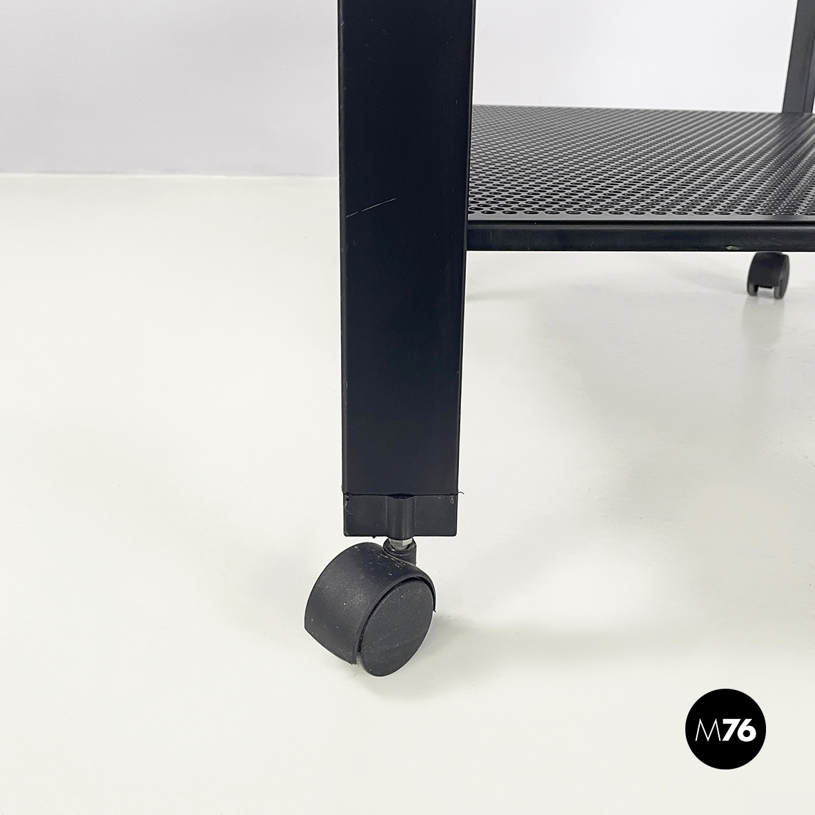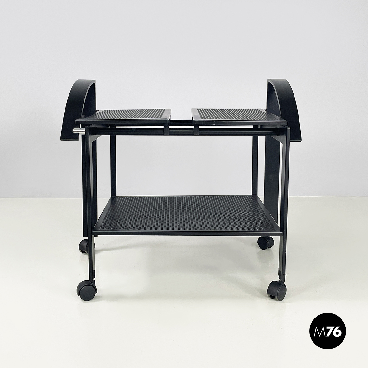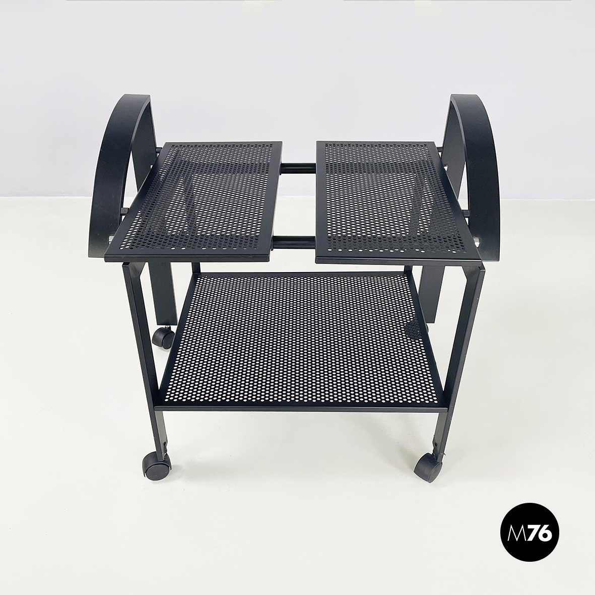 Carrello con doppio ripiano rettangolare traforato con fori tondi interamente in metallo verniciato nero. Il piano superiore è diviso in due parti ed è sostenuto da una struttura in tubolare di metallo nero. Nella parte superiore presenta due manici curvati a sezione rettangolare. Le zampe anteriori presentano un’inclinazioni differenti rispetto a quelle posteriori entrambe sono a sezione rettangolare. Rotelle nere alla base