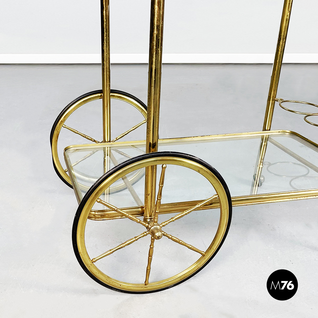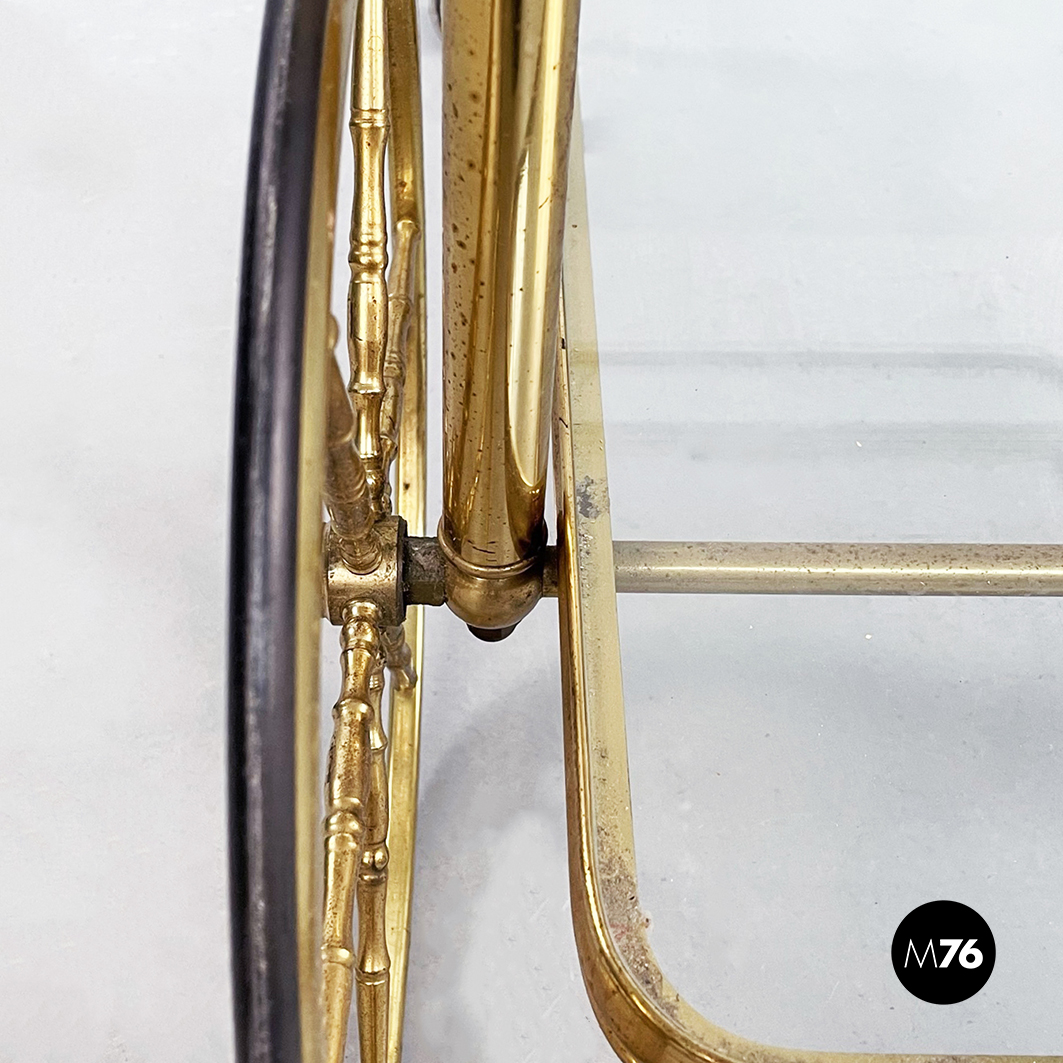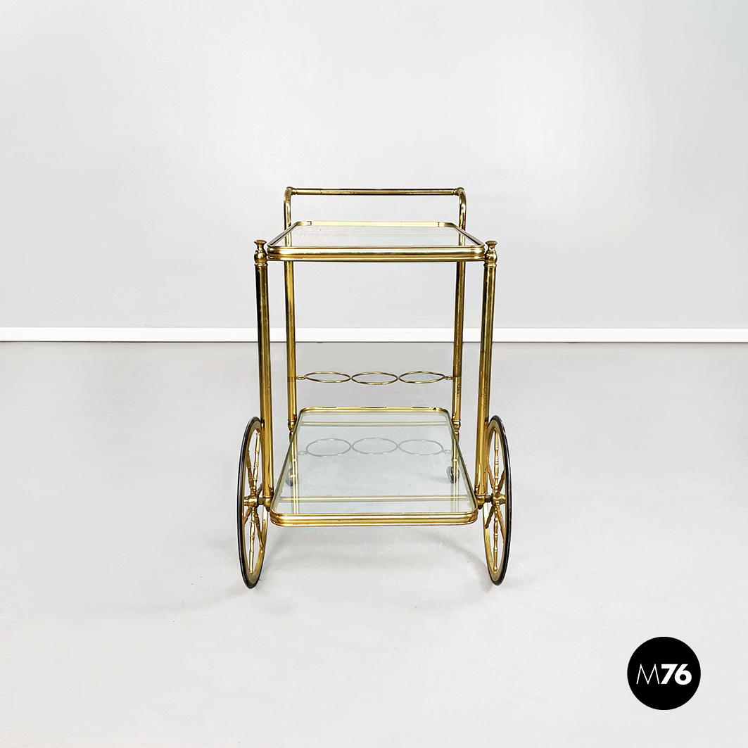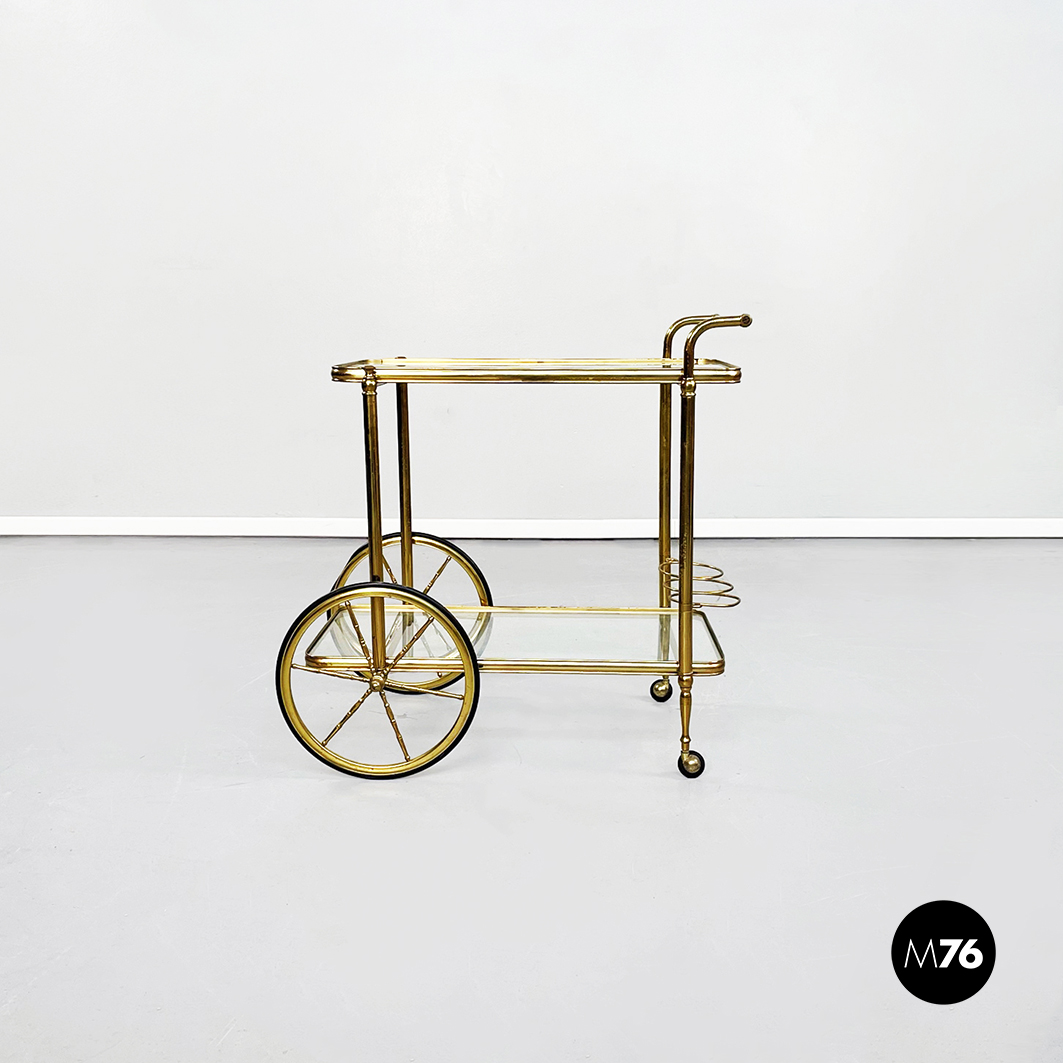 Rectangular food trolley with rounded corners in brass. The two shelves are made of two sheets of transparent glass on the lower one there are three bottle holders. The trolley has four finely crafted legs: the front ones have two large spoked wheels in brass and black rubber while the rear ones are small. Handle present.