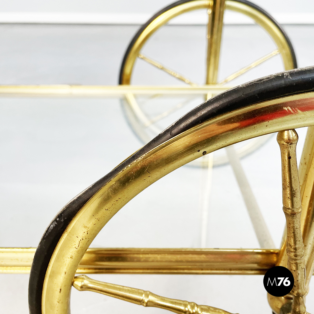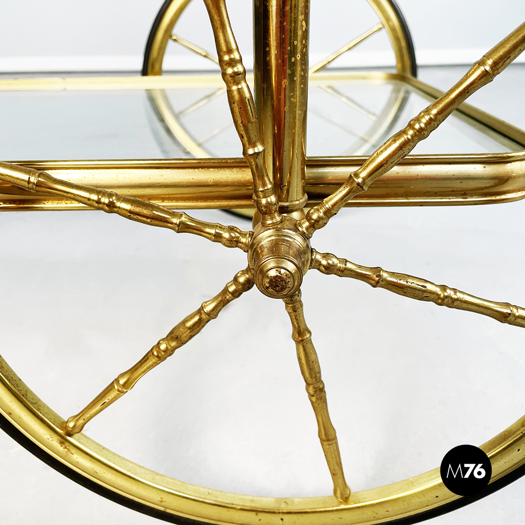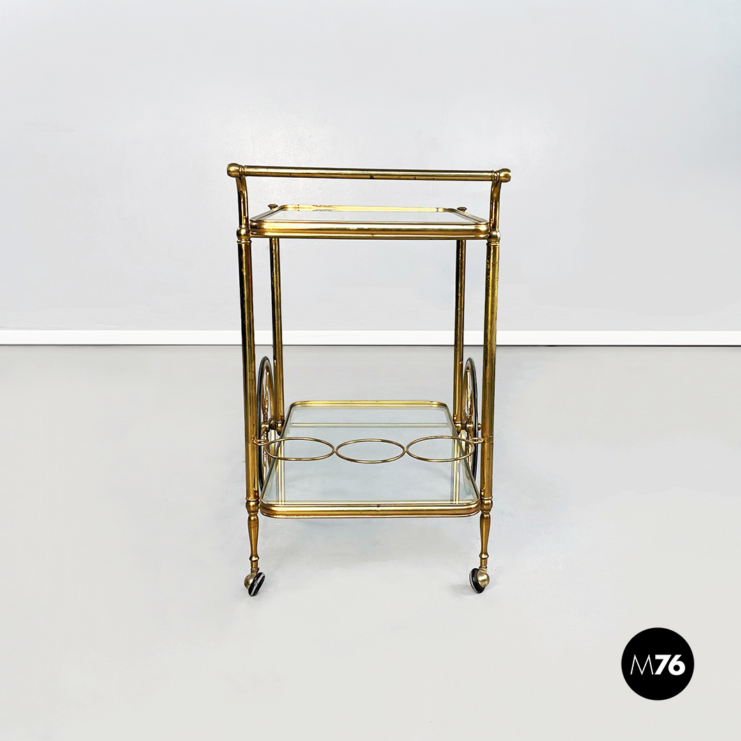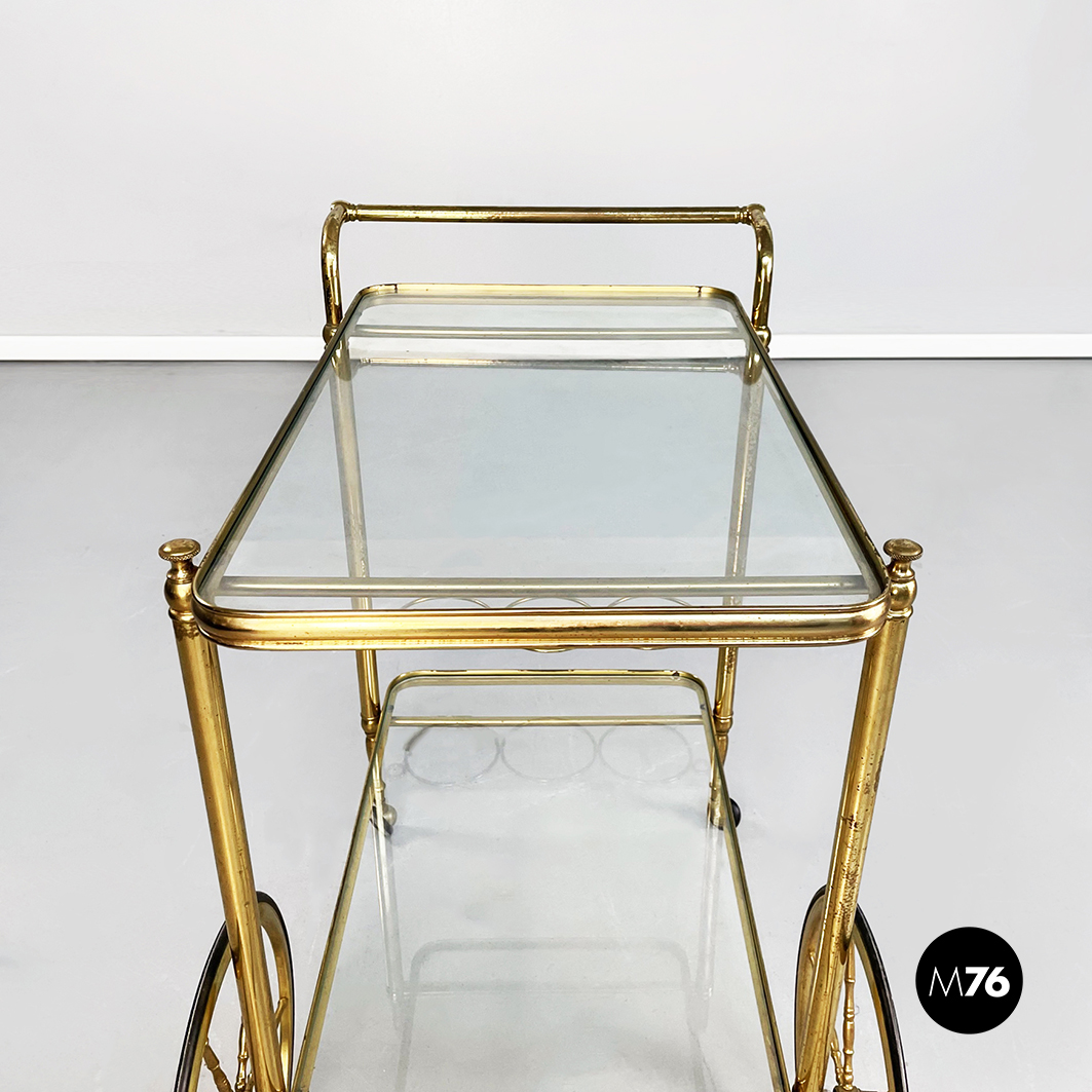 Rectangular food trolley with rounded corners in brass. The two shelves are made of two sheets of transparent glass on the lower one there are three bottle holders. The trolley has four finely crafted legs: the front ones have two large spoked wheels in brass and black rubber while the rear ones are small. Handle present.