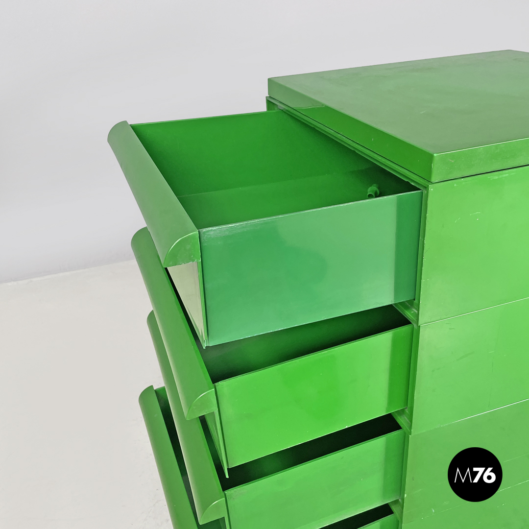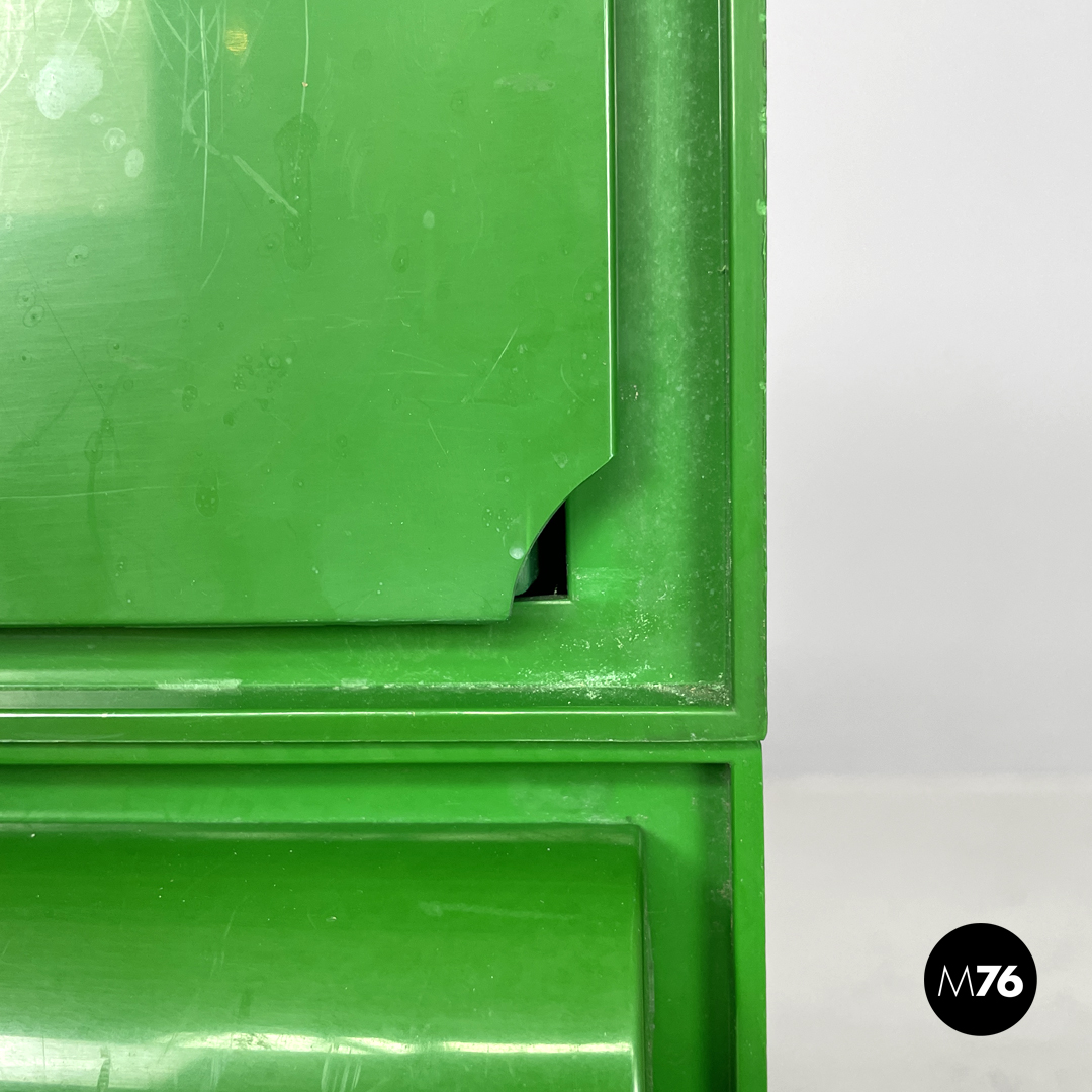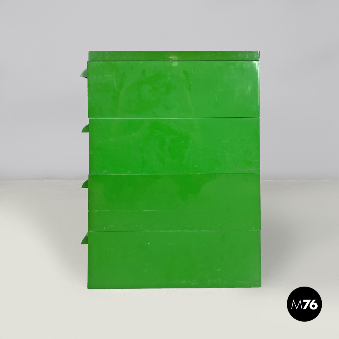 Cassettiera componibile modello 4602 in plastica verde a base quadrata. I quattro cassetti presentano una maniglia con profilo a triangolo stondato ed è della stessa lunghezza del cassetto.