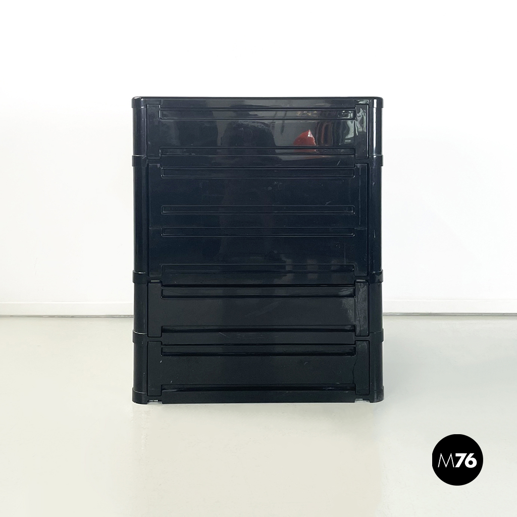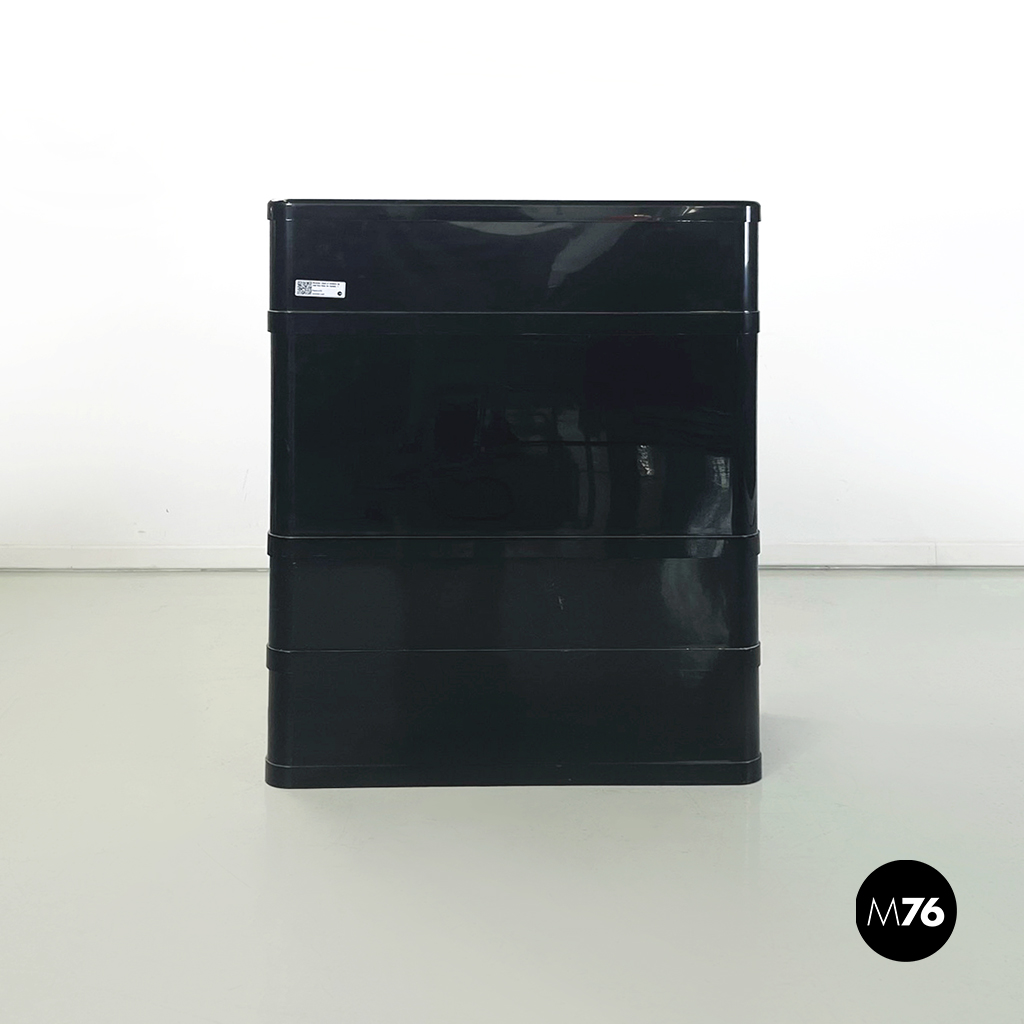Cassettiera modulare modello 4964 a base rettangolare con angoli arrotondati in plastica nera. La scarpiera è composta da 4 moduli ed ogni modulo presenta un cassetto con apertura a ribalta. Il cassetto centrale presenta una capienza doppia rispetto gli altri due.