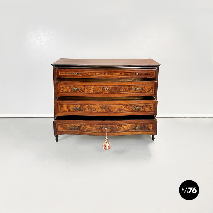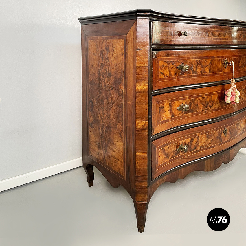 Cassettiera finemente lavorata in legno chiaro e scuro. I fianchi e il fronte dove sono presenti i quattro cassetti sono mossi e sagomati. Pomelli tondi bronzei. Due cassetti presentano serratura e chiave. In stile barocchetto.