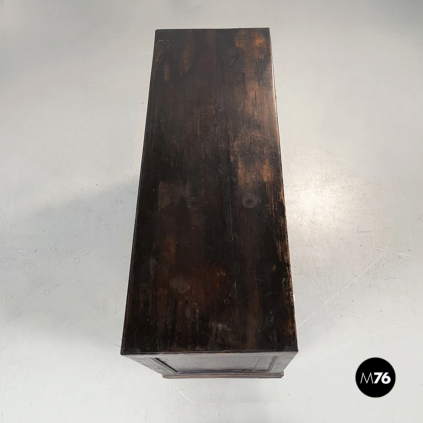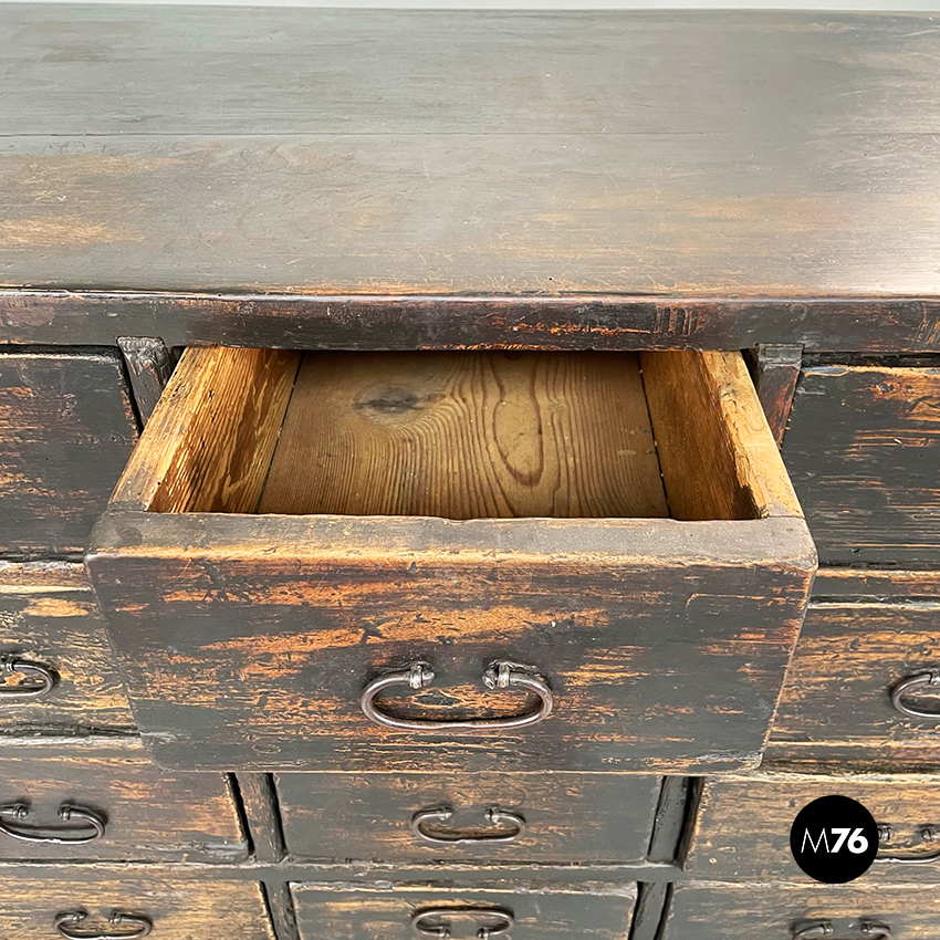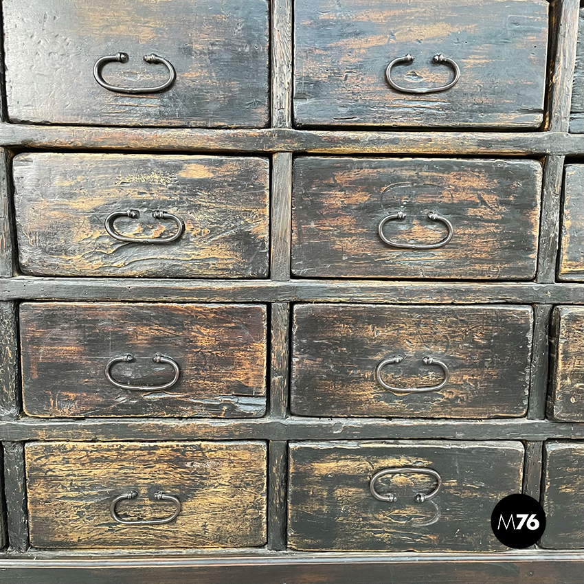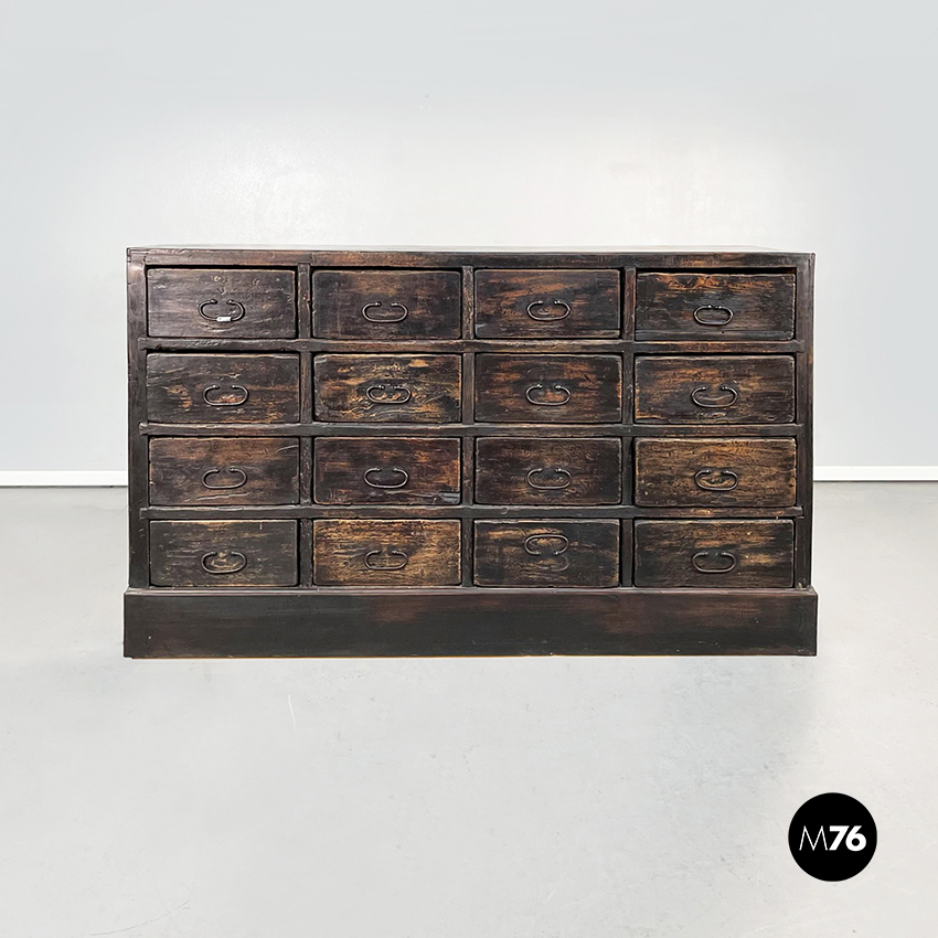 Cassettiera a base rettangolare in legno scuro. Il mobile presenta 16 cassetti divisi in 4 file. Maniglie ovali in metallo.