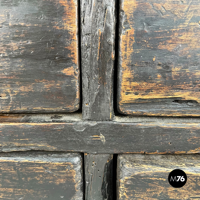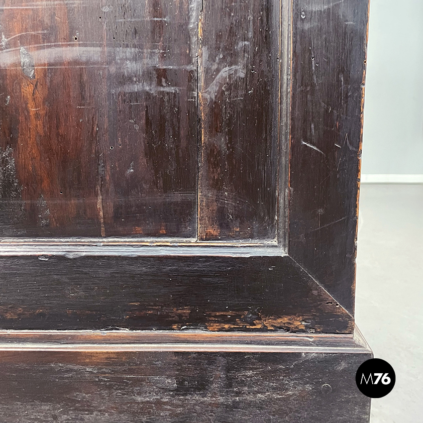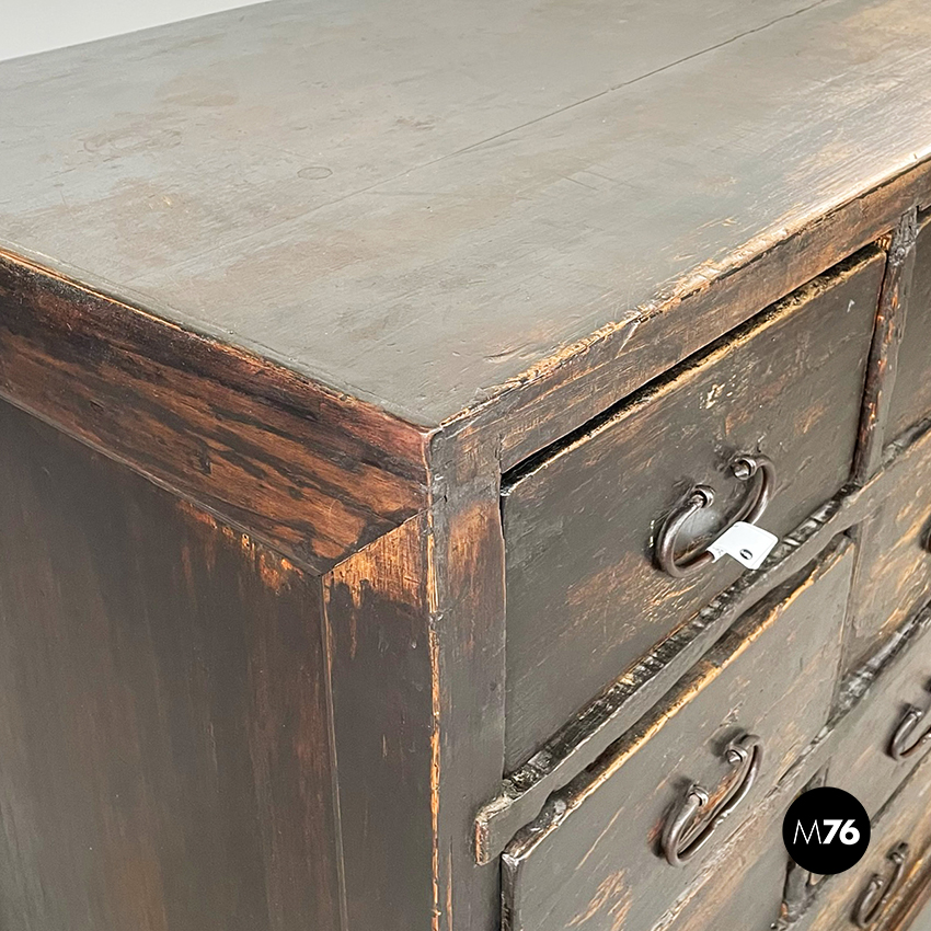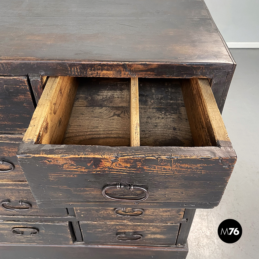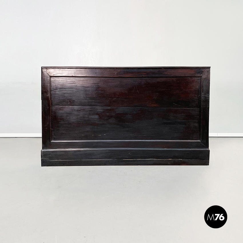 Cassettiera a base rettangolare in legno scuro. Il mobile presenta 16 cassetti divisi in 4 file. Maniglie ovali in metallo.