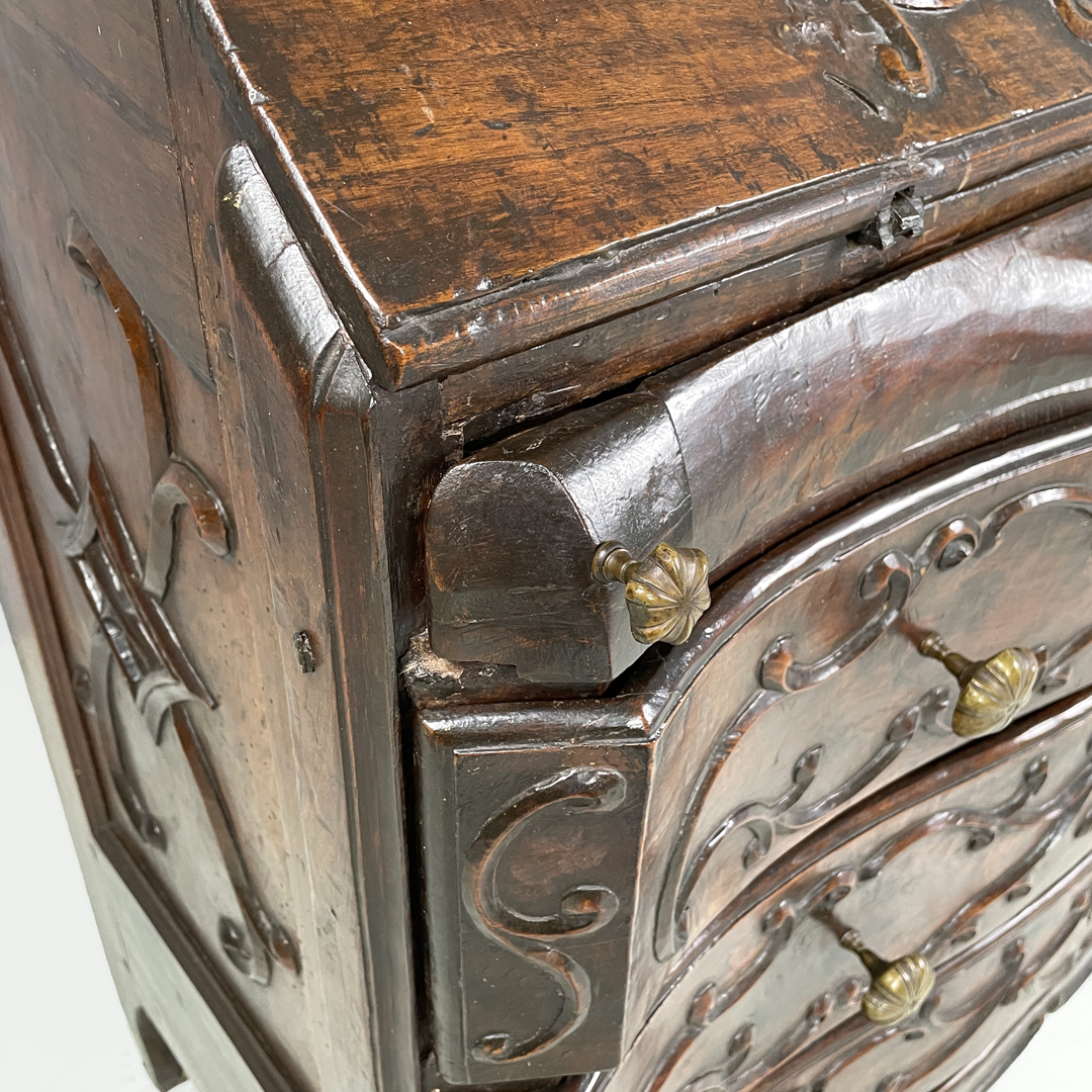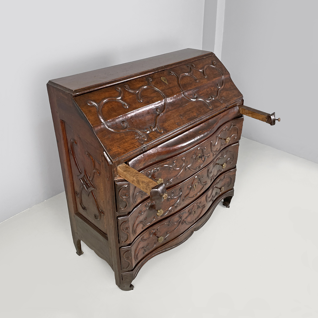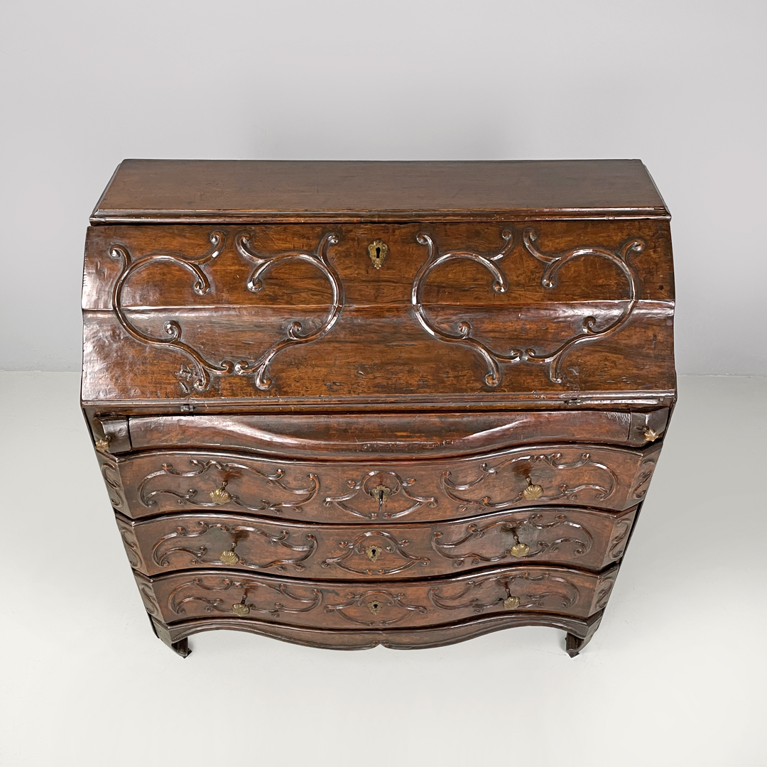 Cassettiera in legno con decorazioni tondeggianti intagliate a mano. Nella parte frontale superiore presenta un’anta a ribalta che poggia su due supporti di legno laterali estraibili con all’interno dei divisori. Sotto alla ribalta si trova un cassetto basso seguito da tre cassetti più alti rivestiti internamente con tessuto giallo con la parte frontale che segue linee curve e pomelli in ottone tondeggianti. Le due gambe anteriori curvano verso l’interno mentre quelle posteriori verso l’esterno.