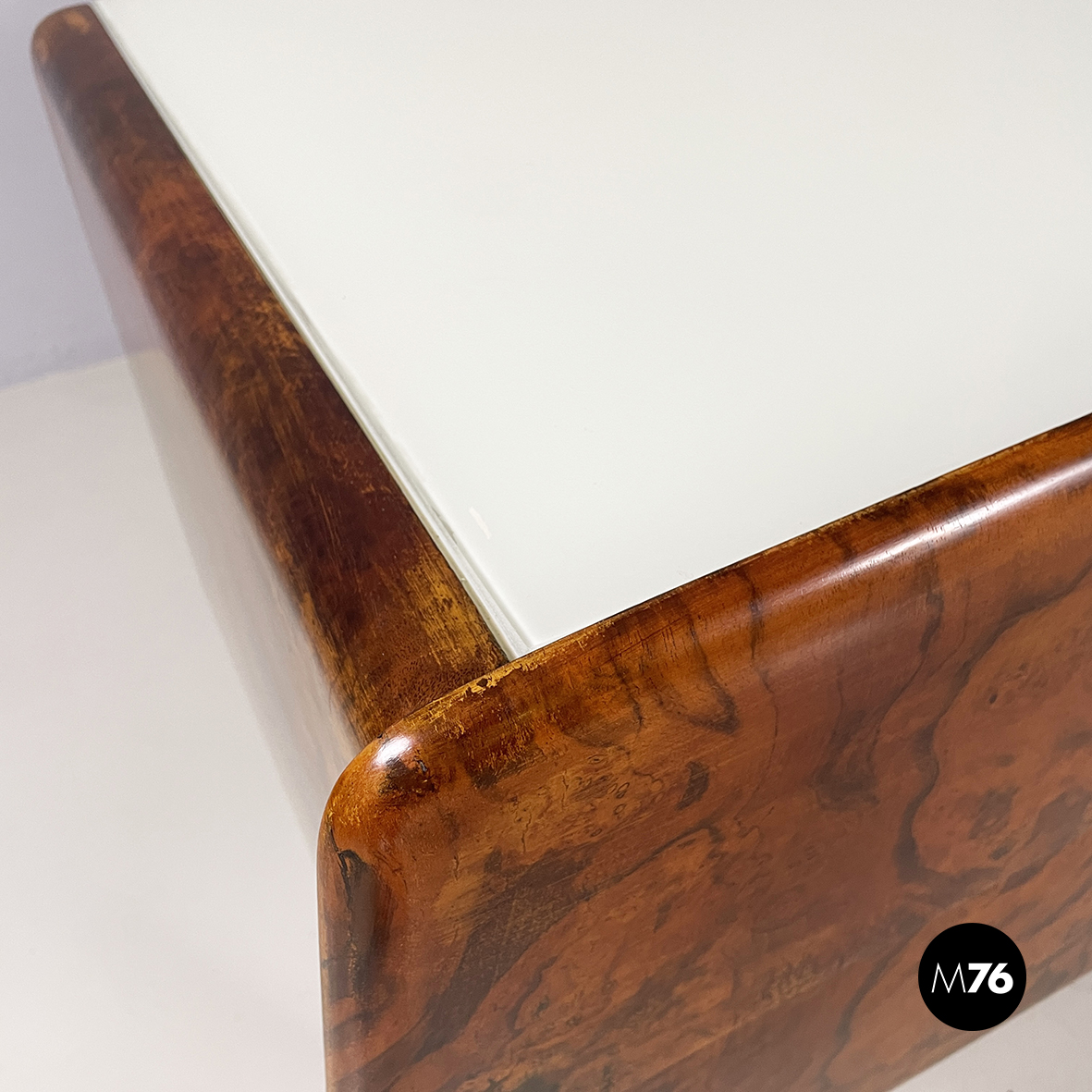 Cassettiera a base rettangolare in vetro legno e ottone. Il piano è in vetro retro-dipinto in bianco. La struttura è in legno con profili arrotondati così come i cassetti i quali hanno una forma svasata e hanno la parte frontale più ampia della stessa struttura. Ogni cassetto presenta una chiave in ottone con terminare lavorato utilizzabile come pomello. Le zampe cilindriche in ottone terminano con un piedino sferico anche esso in ottone.