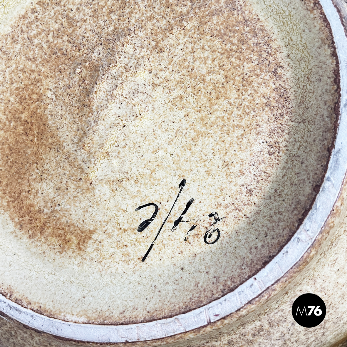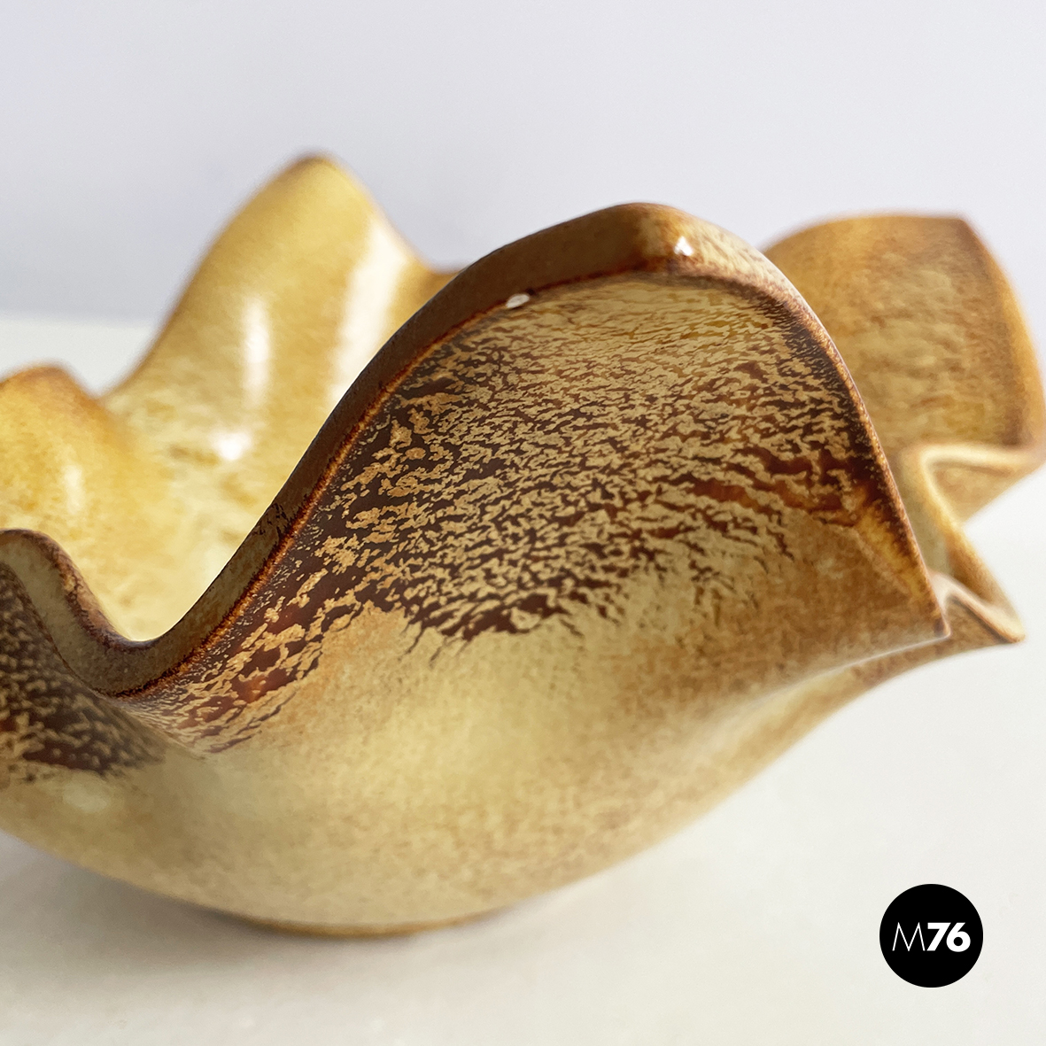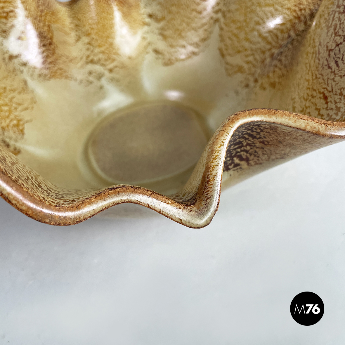 Centrotavola in ceramica dipinta tra i toni del marrone e del beige. Dalla base tonda il centrotavola si allarga prendendo una forma squadrata e organica. Questo può essere usato come portafrutta o come svuota tasche.