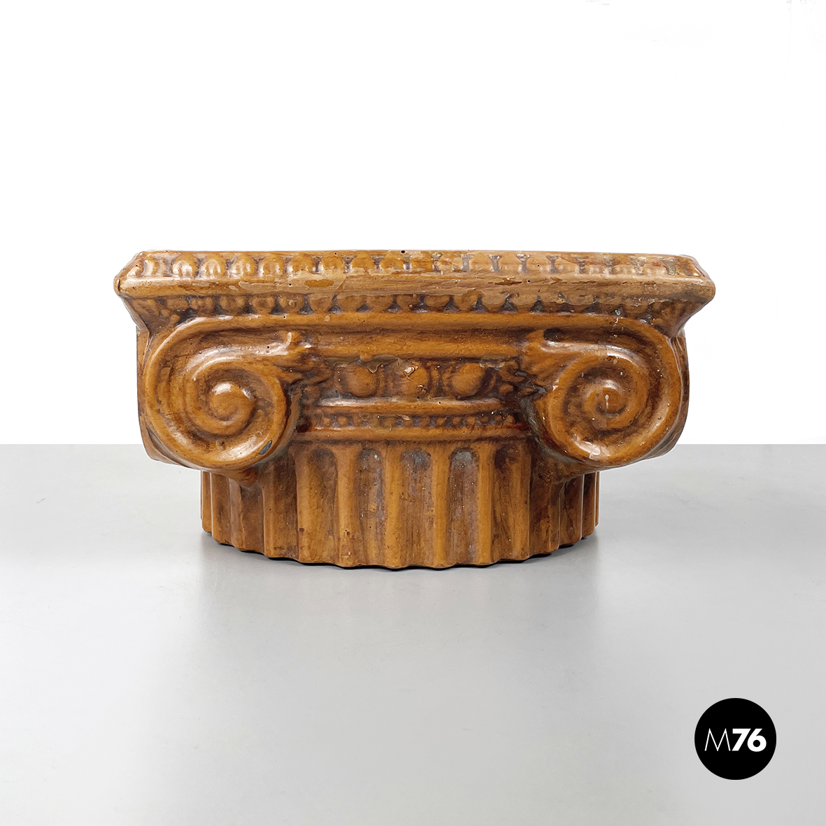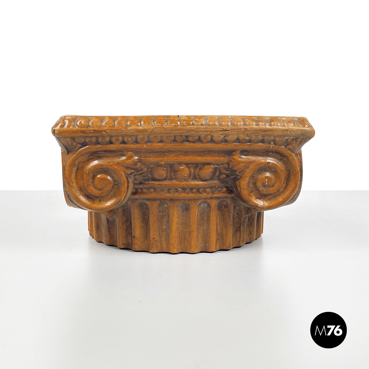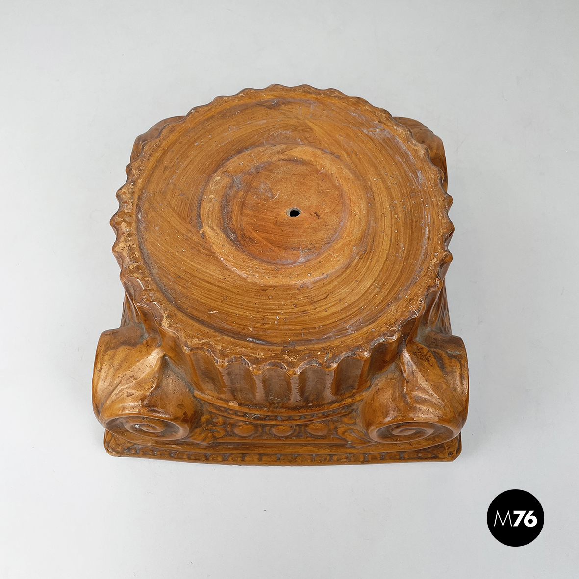 Centrotavola a base tonda in ceramica verniciata marrone. La ciotola ha la forma di un capitello ionico.