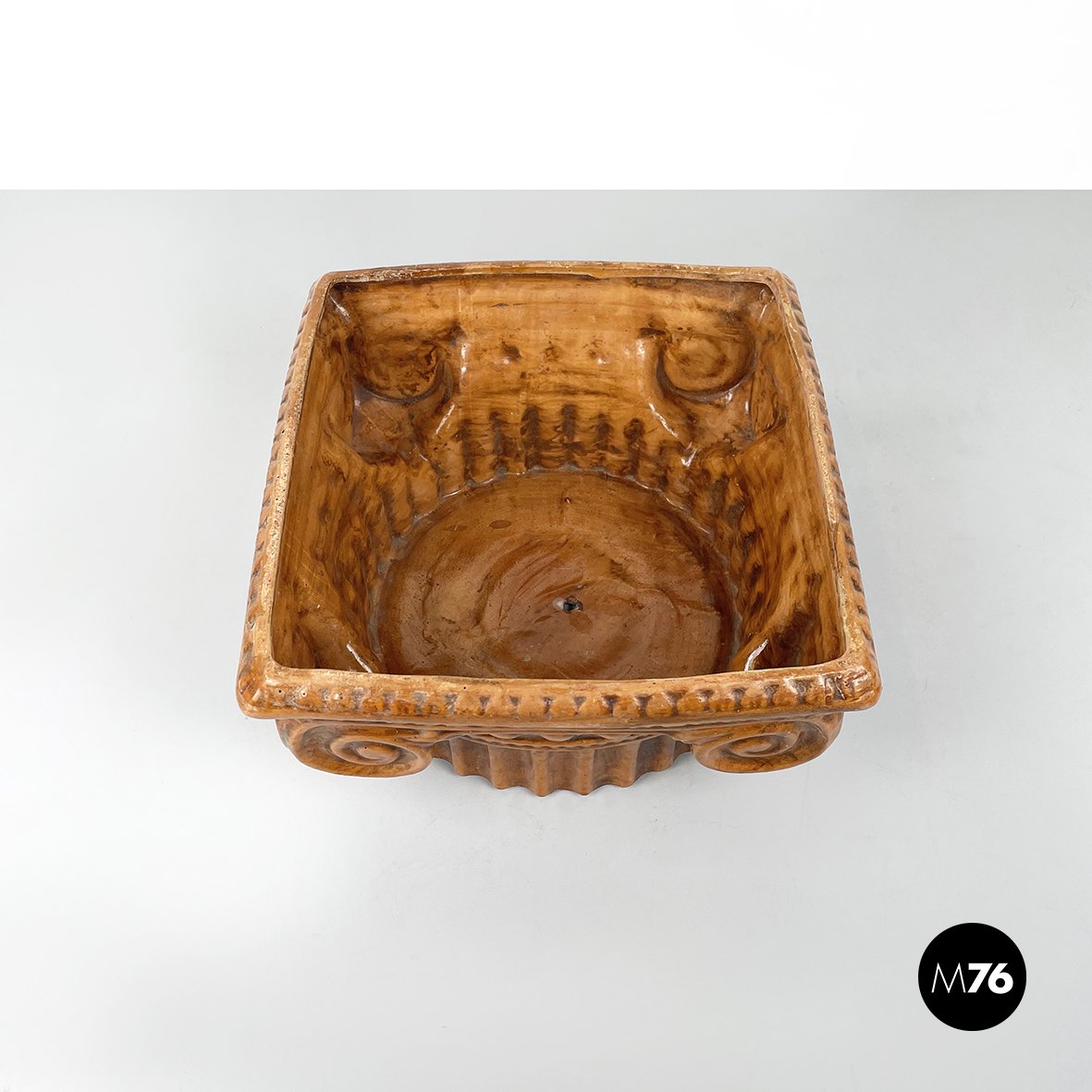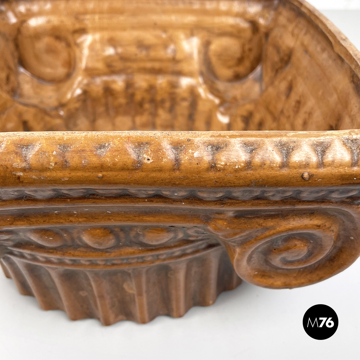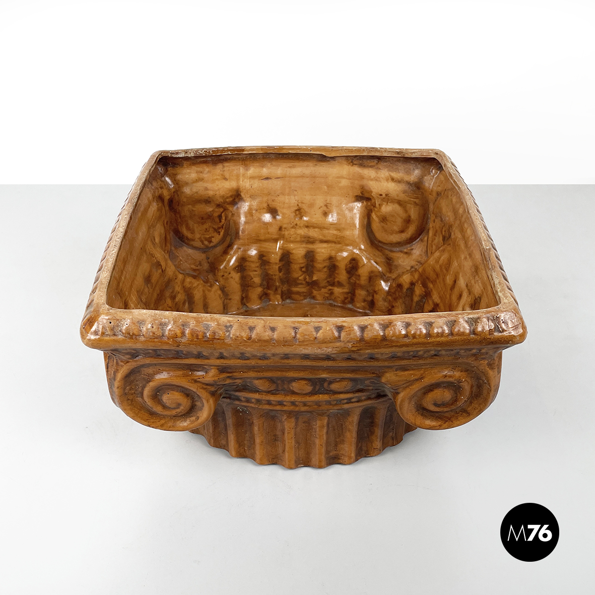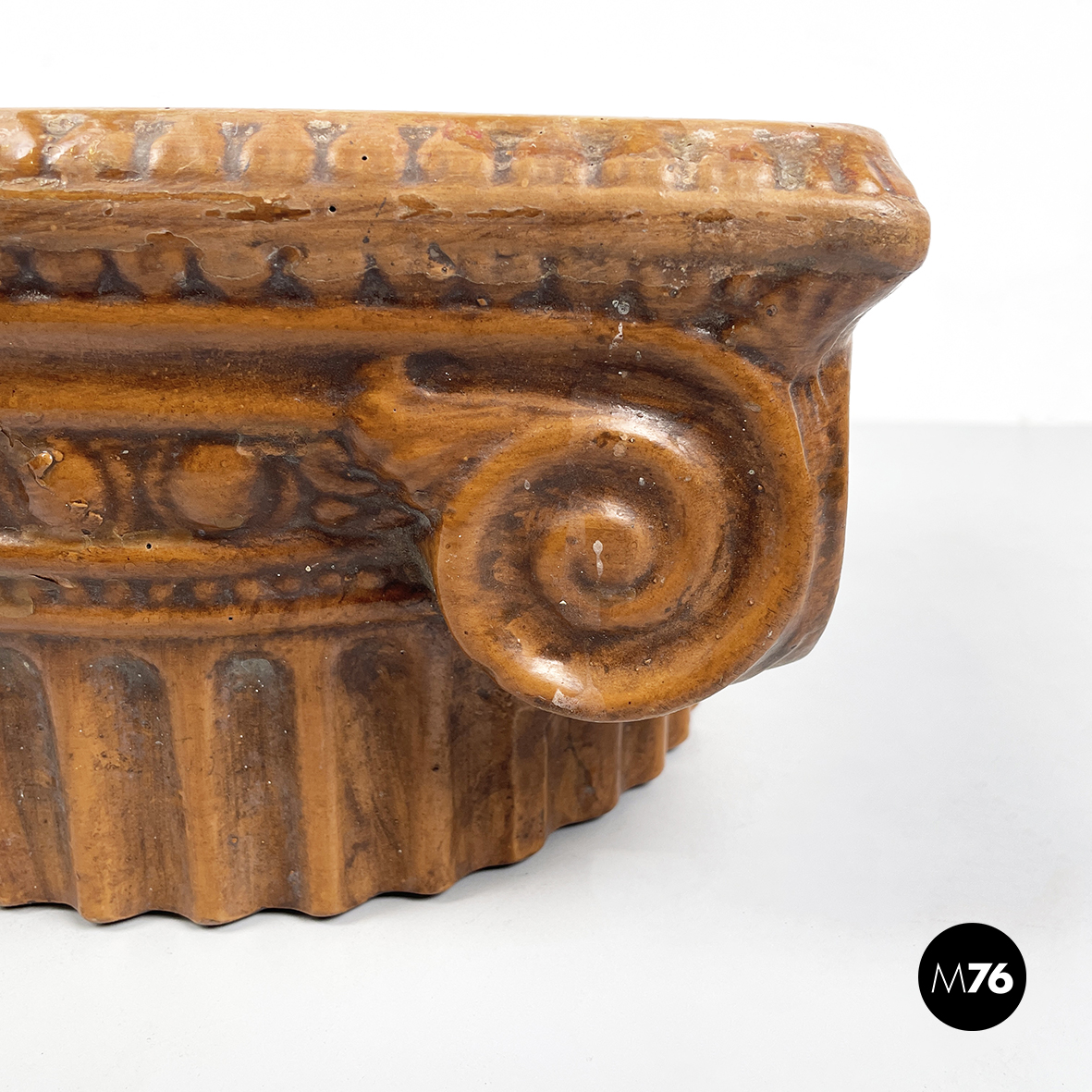 Centrotavola a base tonda in ceramica verniciata marrone. La ciotola ha la forma di un capitello ionico.