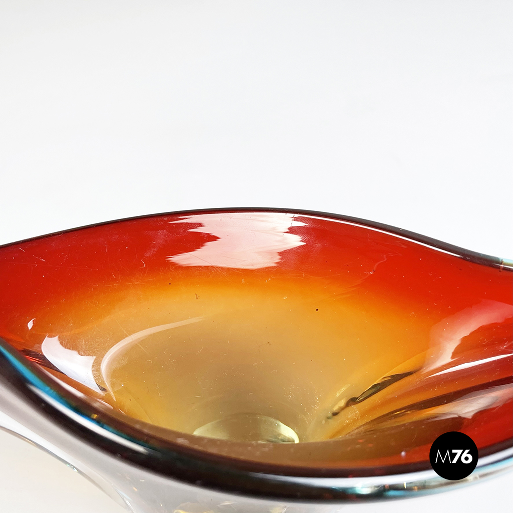 Centrotavola dalla forma irregolare in vetro di Murano. I colori principali sono giallo e rosso con leggere sfumature azzurre alla base. Utilizzabile anche come svuotatasche.