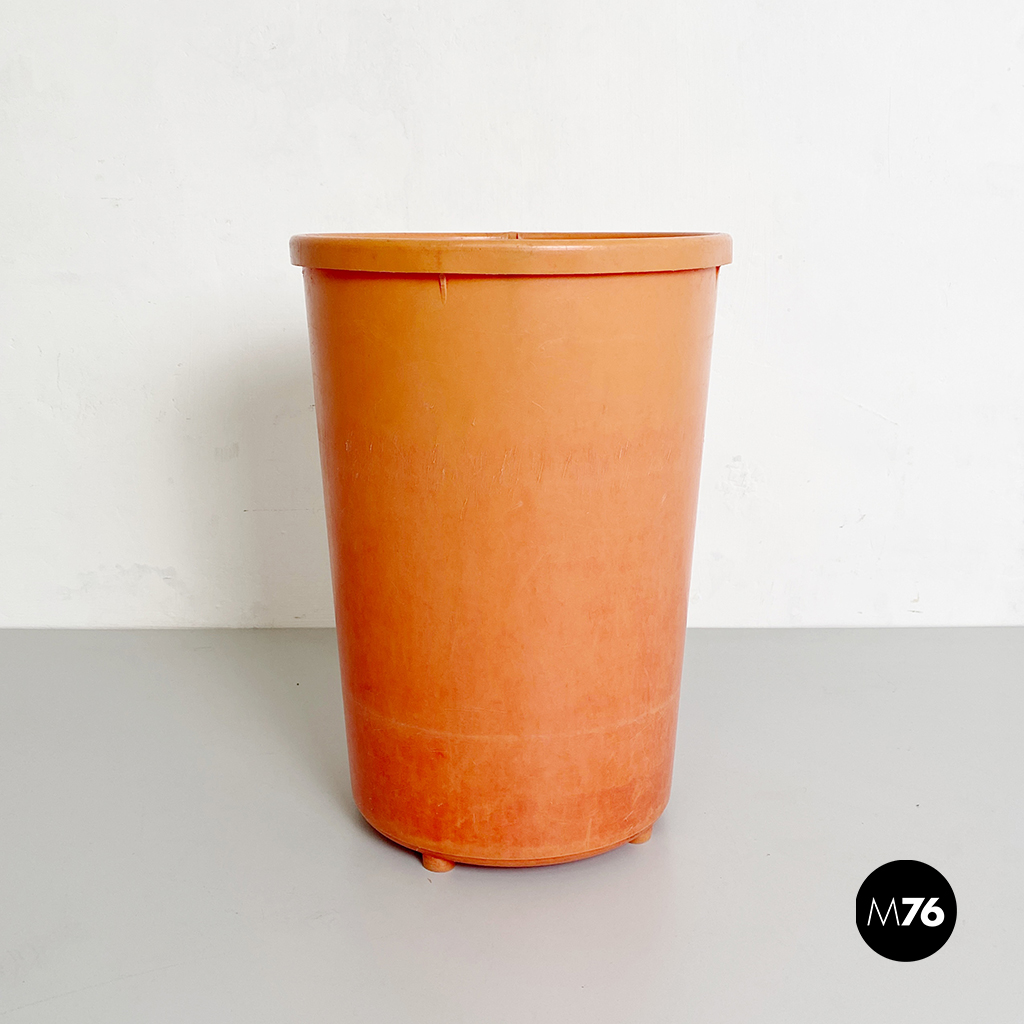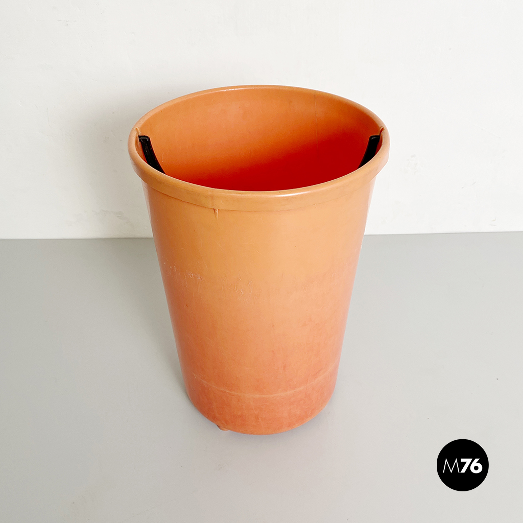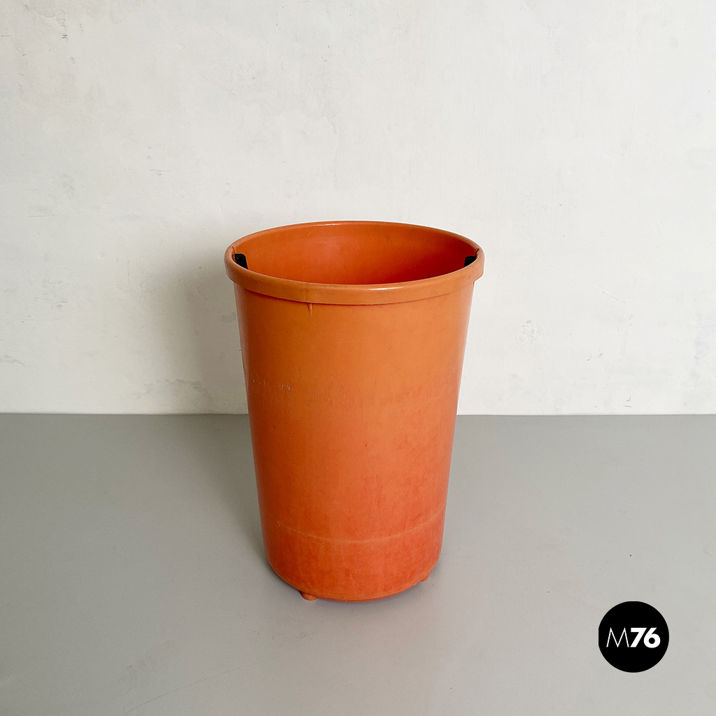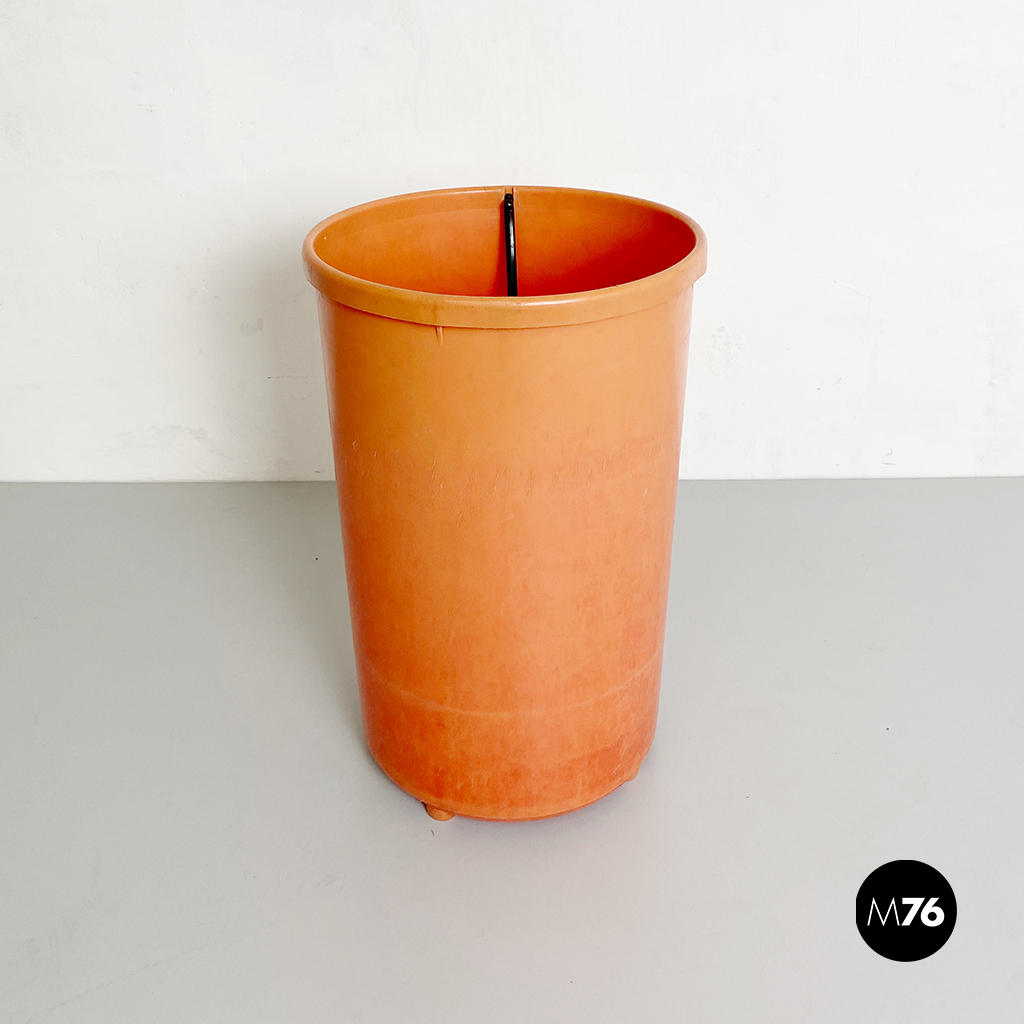 Cestino tondo in plastica arancione con manico in plastica nera.