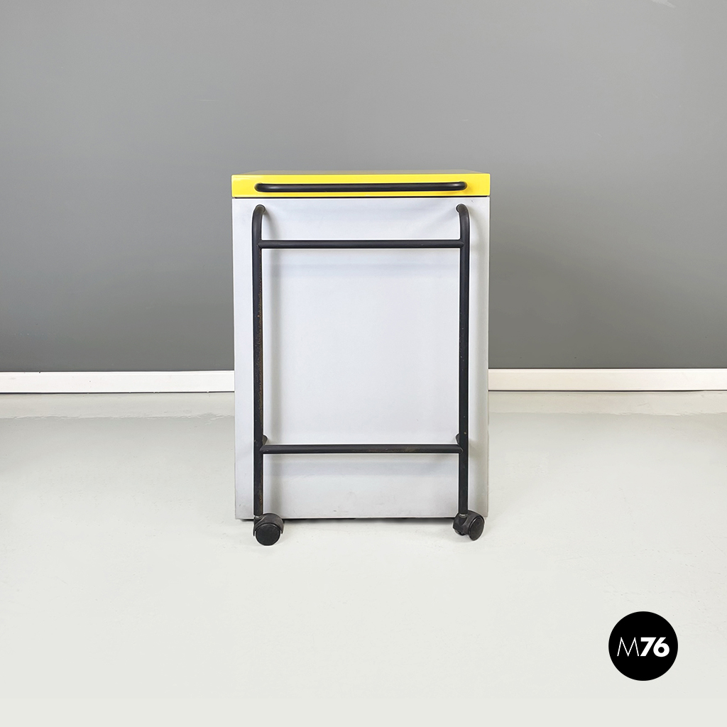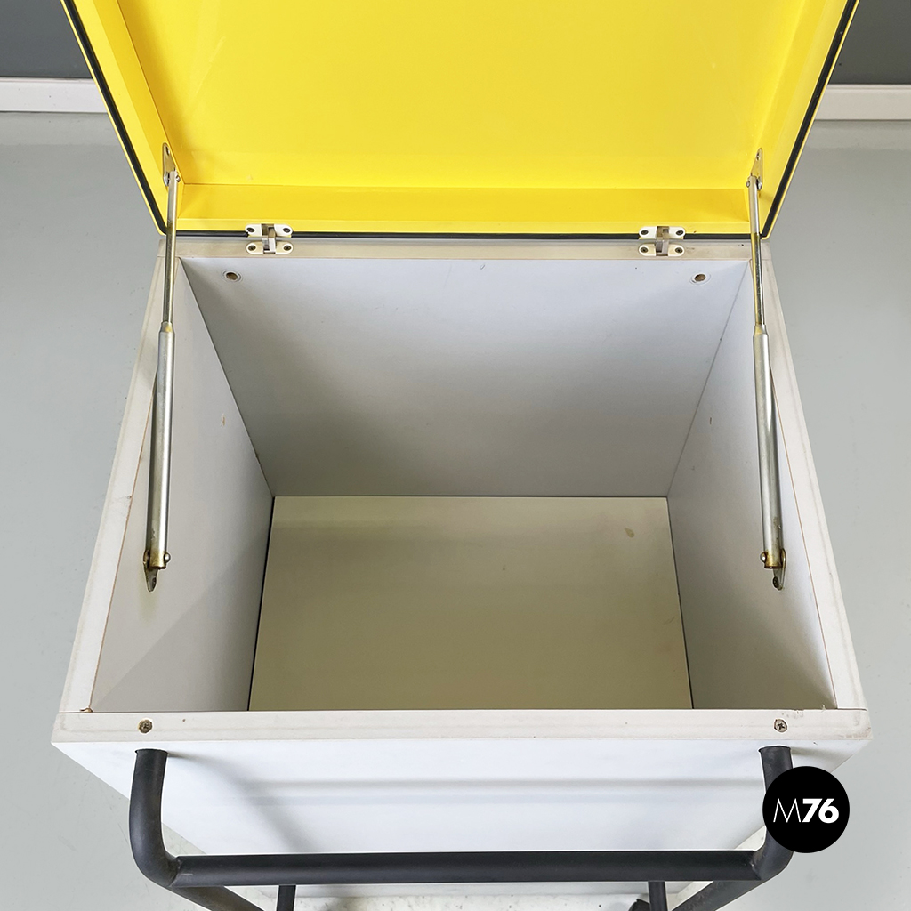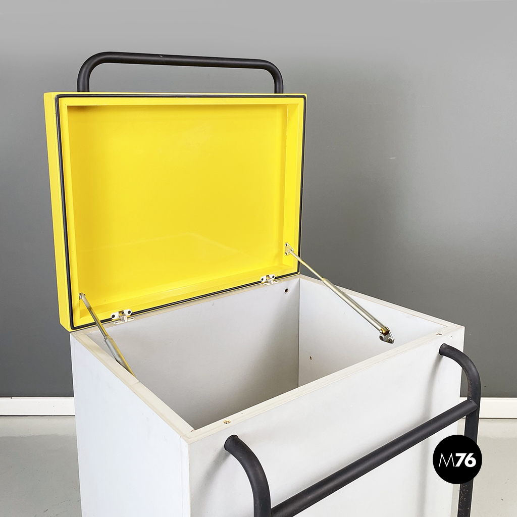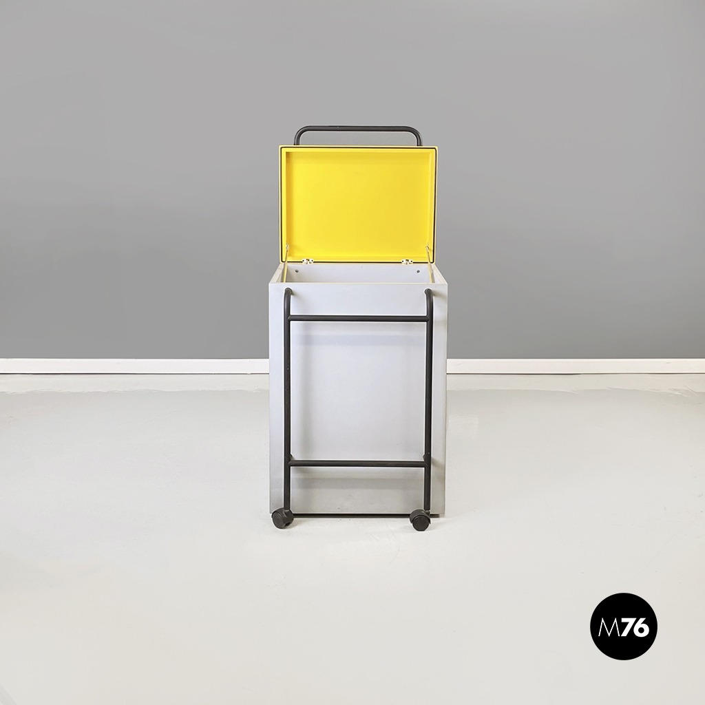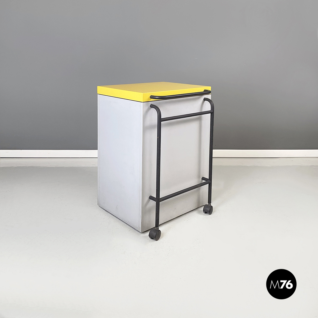 Cestino con base rettangolare in legno verniciato in grigio chiaro e giallo brillante. Il coperchio del mobile contenitore in legno giallo presenta una maniglia in tubolare di metallo verniciato nero. Sul fronte presenta una struttura in tubolare di metallo verniciato nero e alla base di questa una coppia di ruote nere.