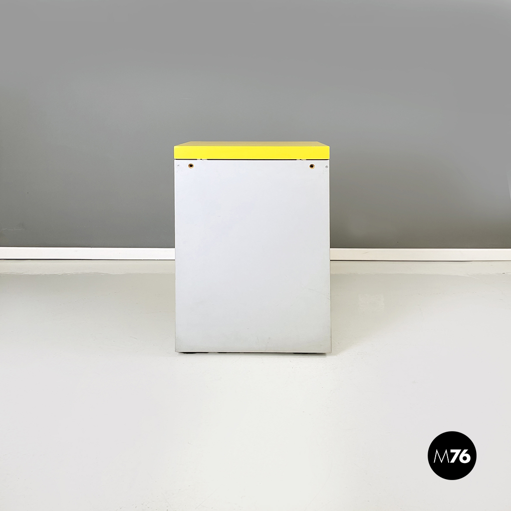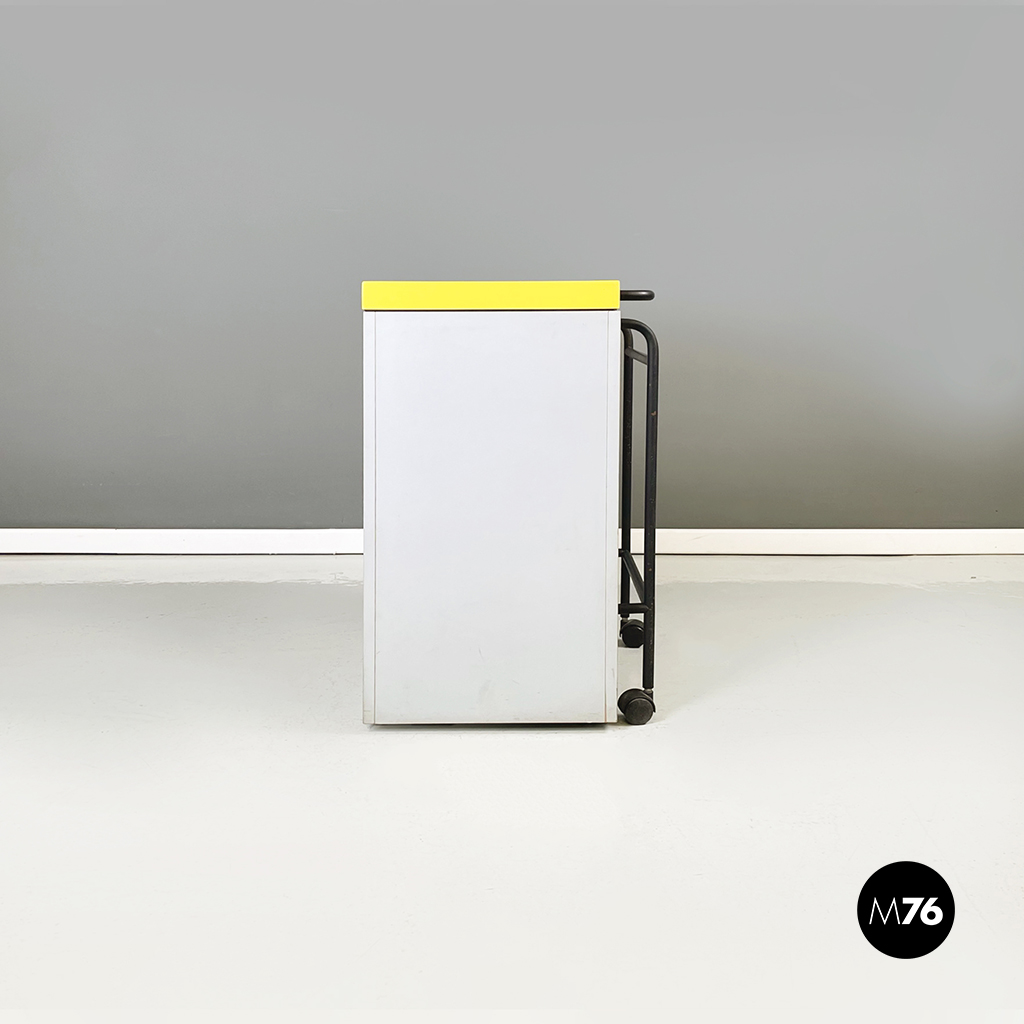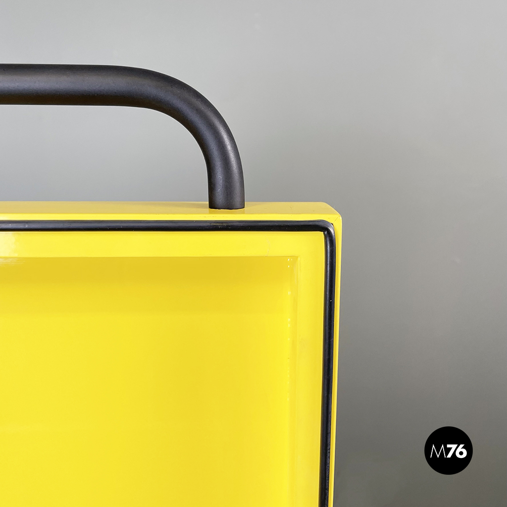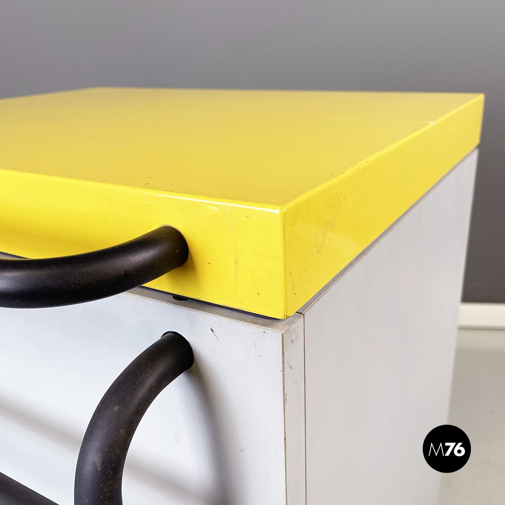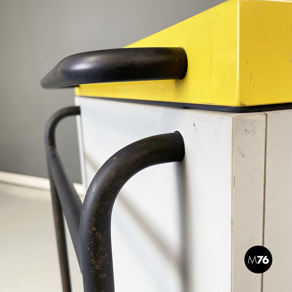 Cestino con base rettangolare in legno verniciato in grigio chiaro e giallo brillante. Il coperchio del mobile contenitore in legno giallo presenta una maniglia in tubolare di metallo verniciato nero. Sul fronte presenta una struttura in tubolare di metallo verniciato nero e alla base di questa una coppia di ruote nere.